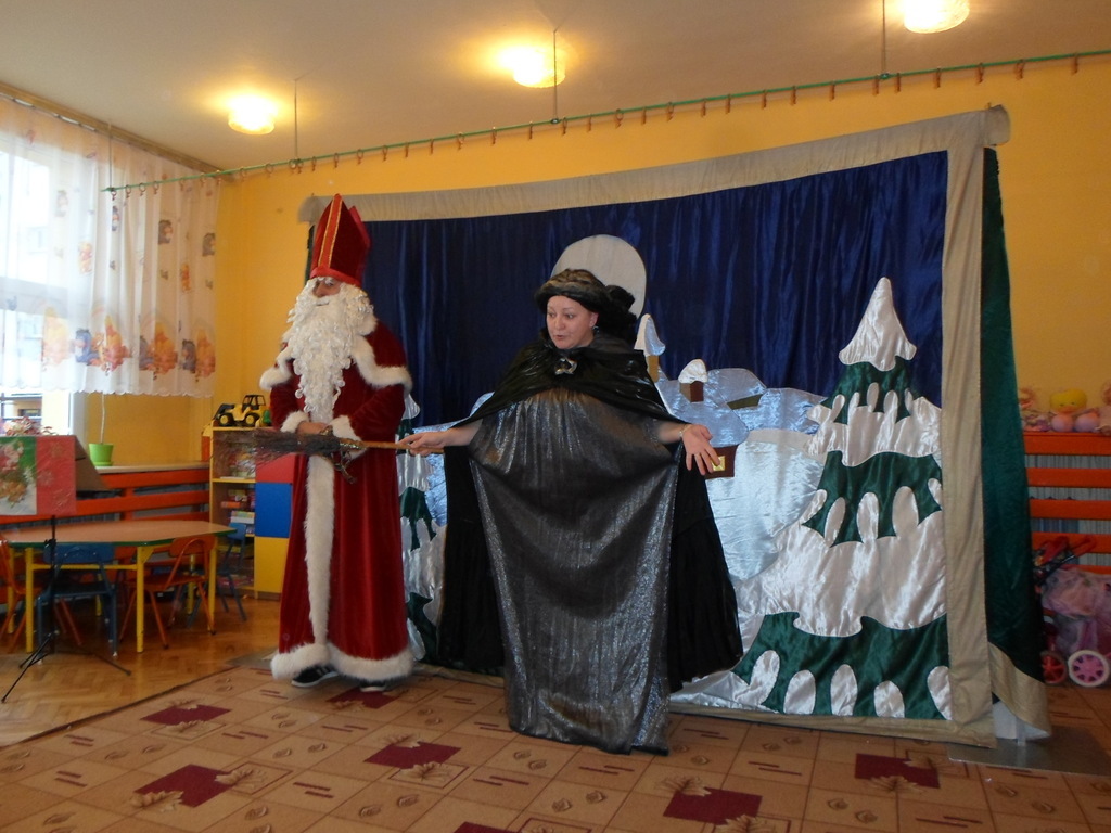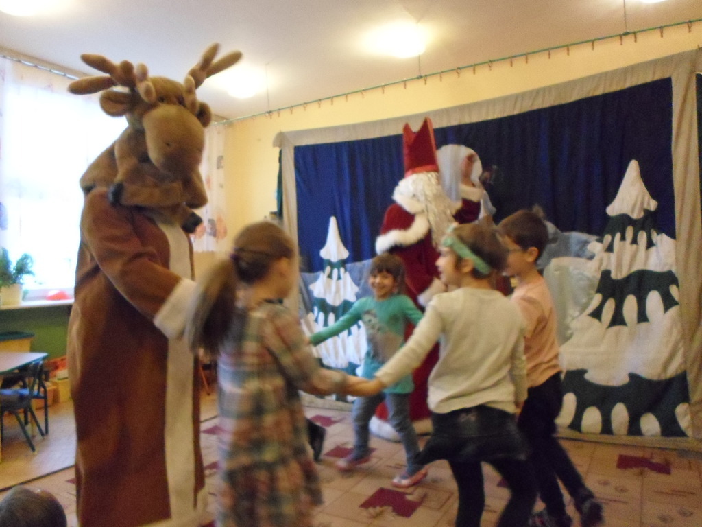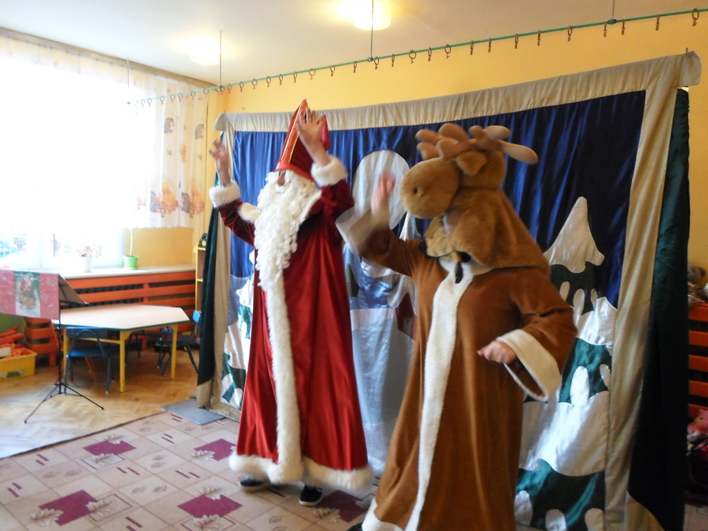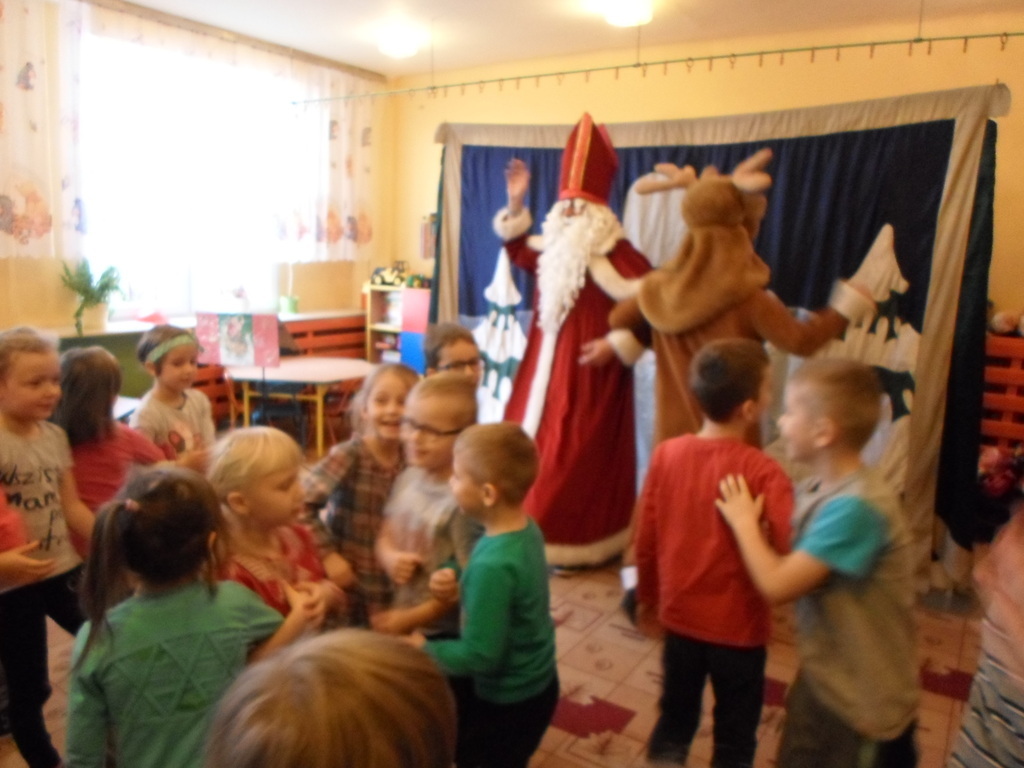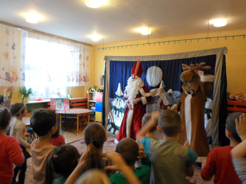 Teatrzyk wprowadził dzieci w ważny zbliżający się dzień – 6 grudnia Święto Mikołaja. Niezwykły, zabawny renifer mocno seplenił i wzbudzał salwy śmiechu. Mikołaj opowiadał legendę o różnych świętych rozwożących prezenty we Włoszech, w Niemczech i Chorwacji.Przedszkolaki poznały wiedźmę Befanę, która 5 stycznia rozdaje prezenty, Santa Clausa i Święty Nikola.