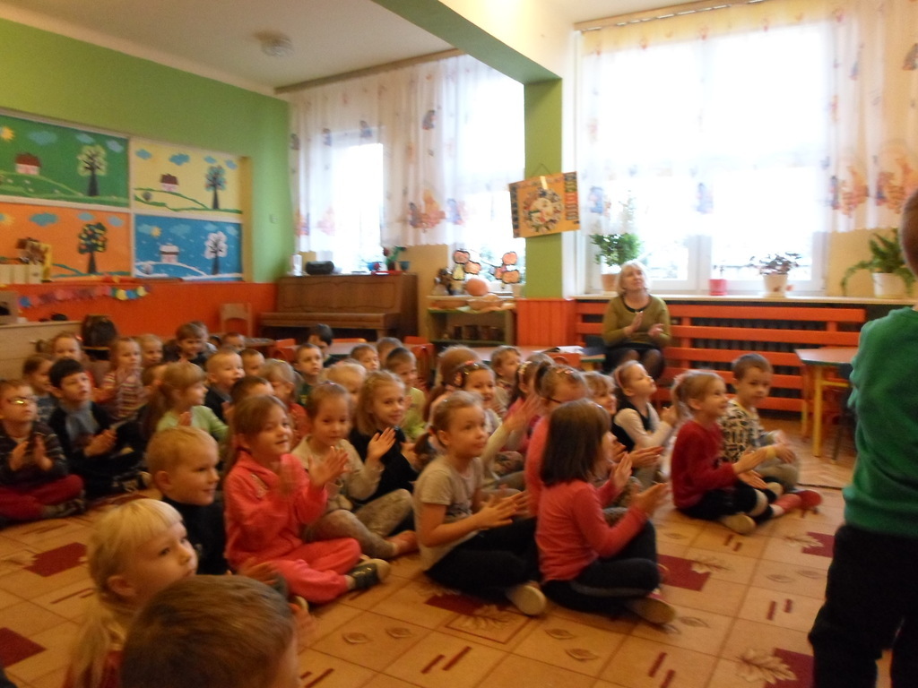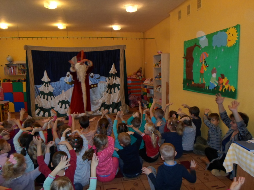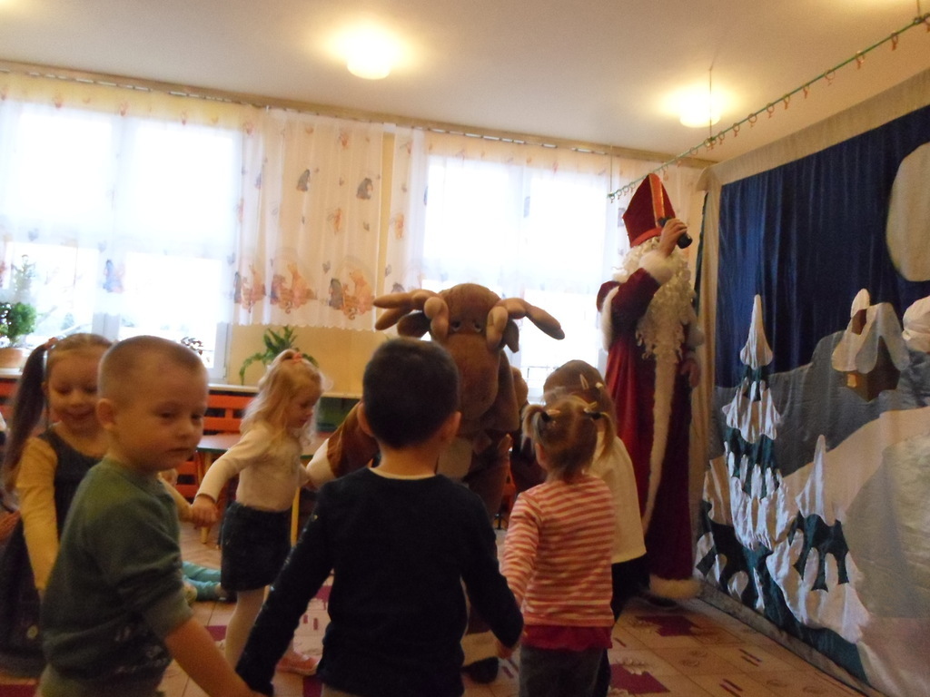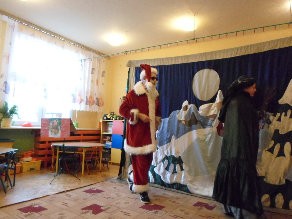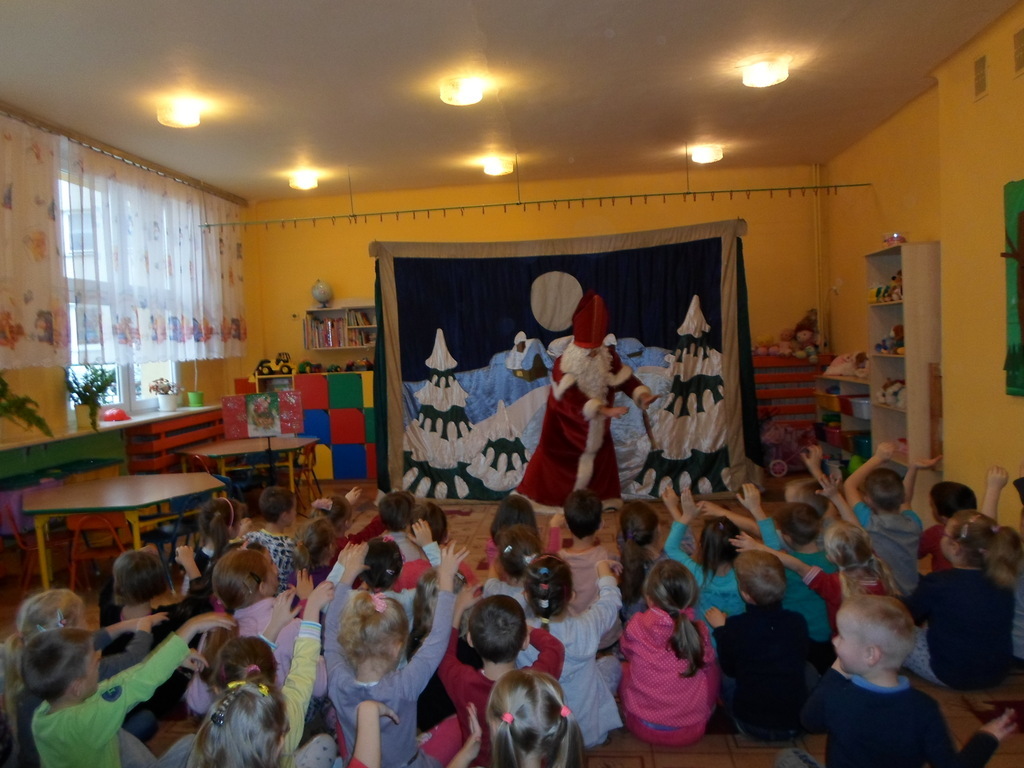 Teatrzyk wprowadził dzieci w ważny zbliżający się dzień – 6 grudnia Święto Mikołaja. Niezwykły, zabawny renifer mocno seplenił i wzbudzał salwy śmiechu. Mikołaj opowiadał legendę o różnych świętych rozwożących prezenty we Włoszech, w Niemczech i Chorwacji.Przedszkolaki poznały wiedźmę Befanę, która 5 stycznia rozdaje prezenty, Santa Clausa i Święty Nikola.