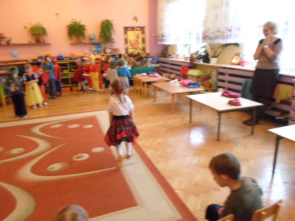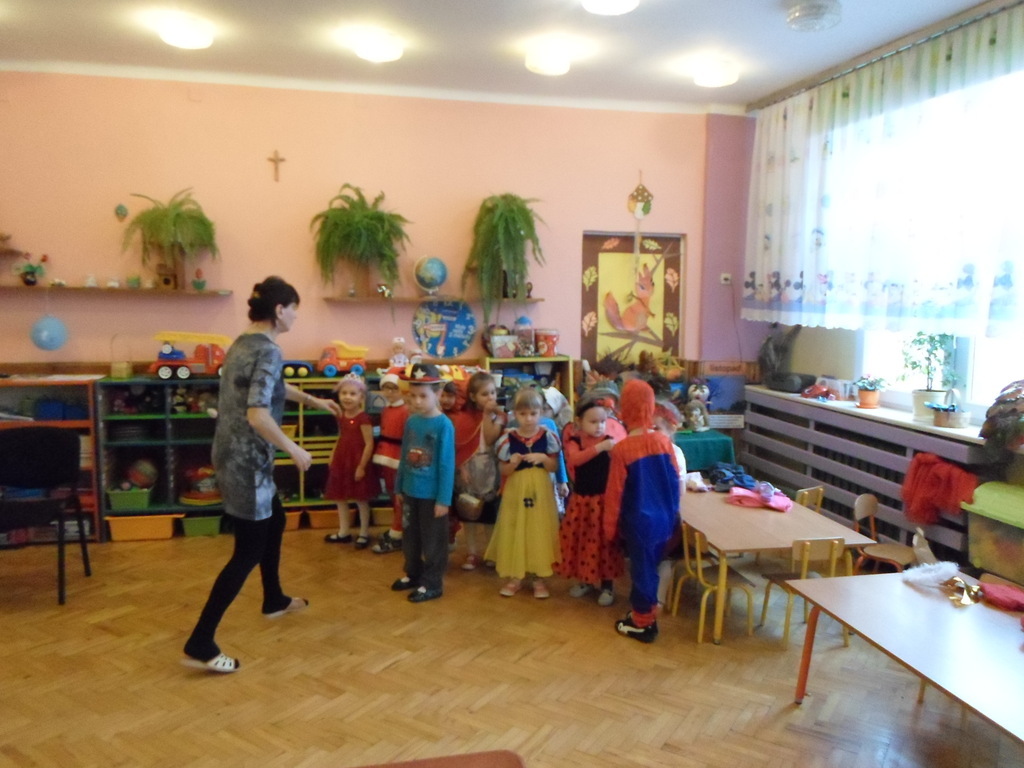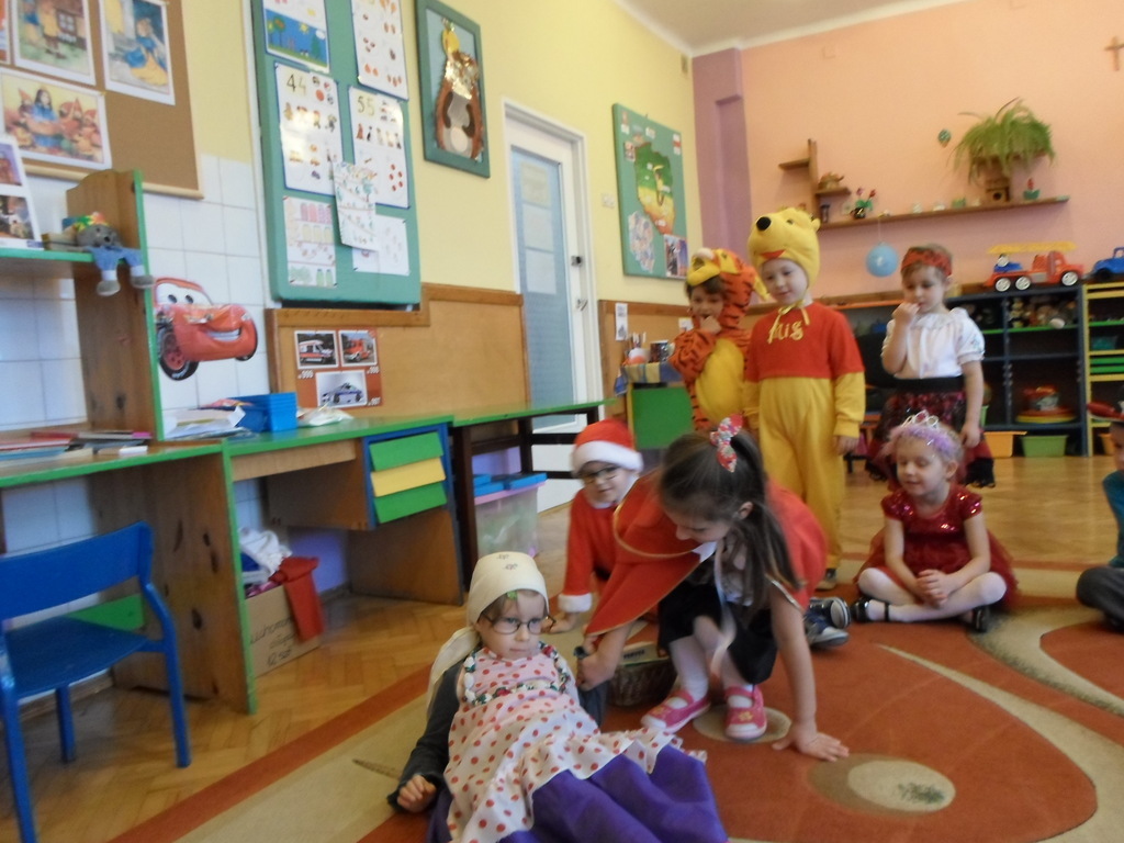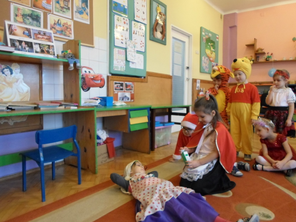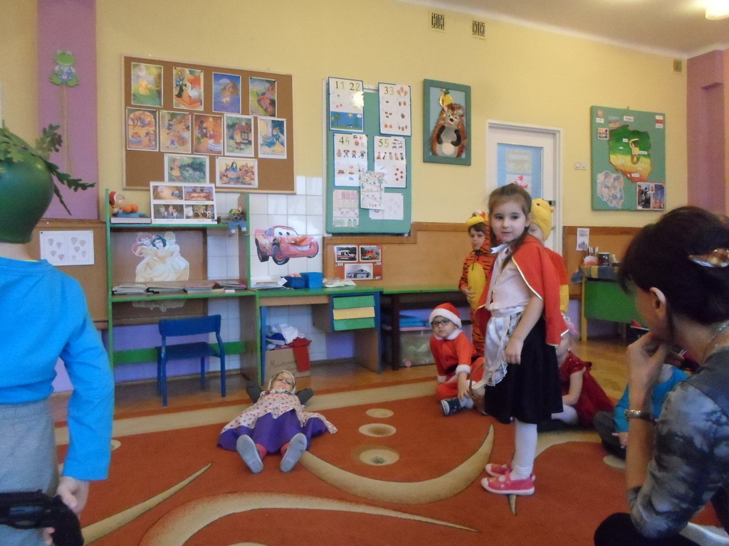 Oddział III „Pszczółki” zaprezentował pokaz mody teatralnej, w której występowały postacie z bajek. Na pokaz zaproszono maluchów, którzy podziwili i nazywali prezentujące się postacie. Chętnie dzieci zagrały , krótkie scenki dramowe , a potem bohaterzy bajek zaprosili maluchów do wspólnej zabawy przy muzyce.