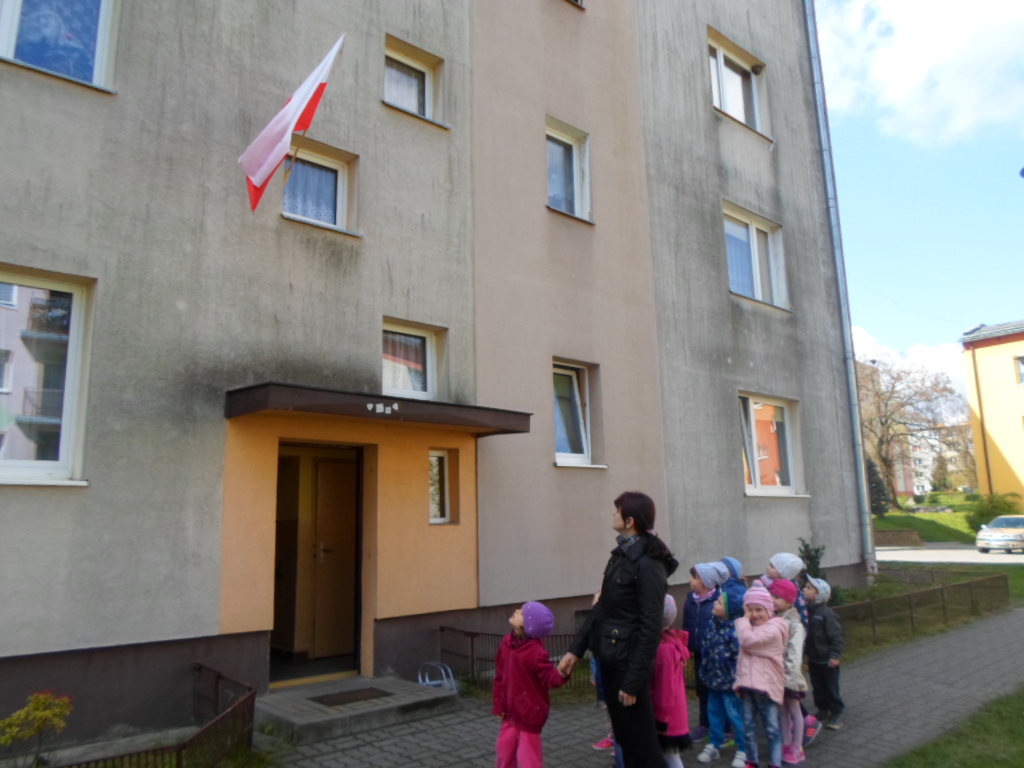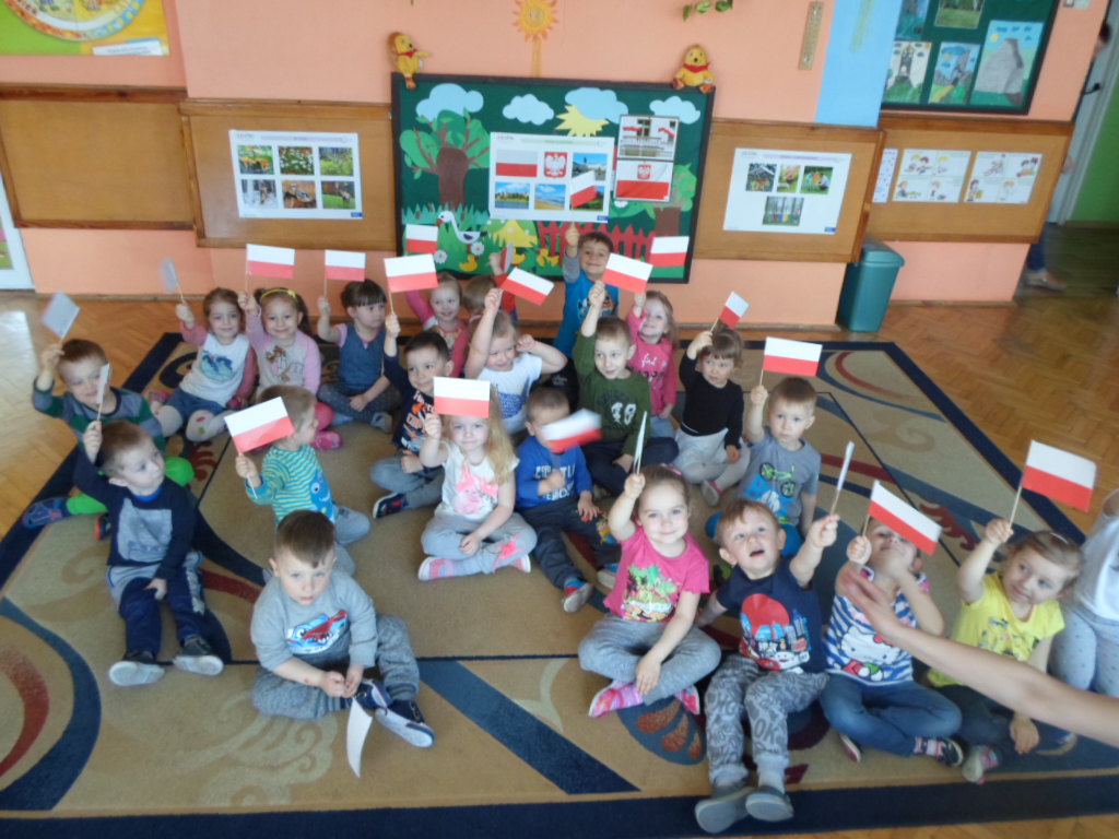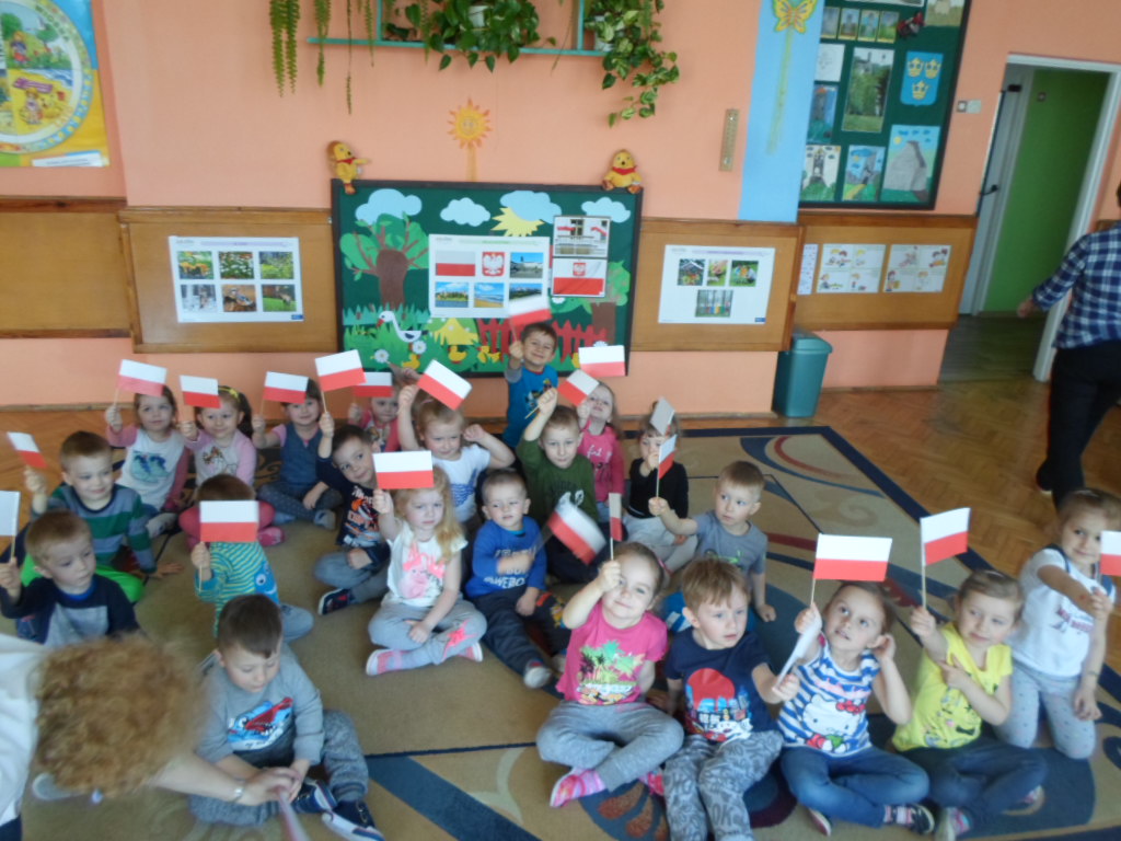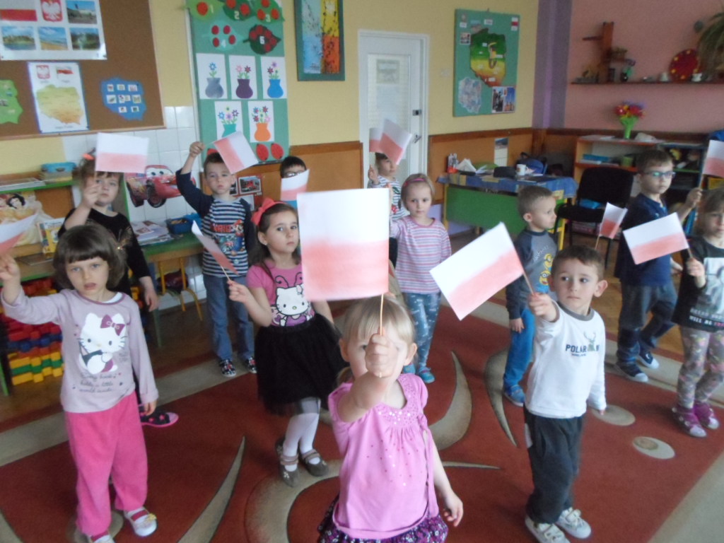 Ten szczególny dzień uczciliśmy wcześniej 30 kwietnia w naszym przedszkolu. Wszystkie grupy wykonały flagę i zabrały ją do domu, by ozdobić swoje okno. Uczyliśmy się także wiersza „Barwy ojczyste” Cz. Janczarskiego. Podczas spaceru obserwowaliśmy różne budynki ozdobione flagami – symbolem naszej polskości. Teraz już każde dziecko zna kolory na naszej fladze, a gdy zapomni to treść nauczonego wiersza podpowie: „Powiewa ,flaga gdy wiatr się zerwie, a na tej fladze biel jest i czerwień……”
