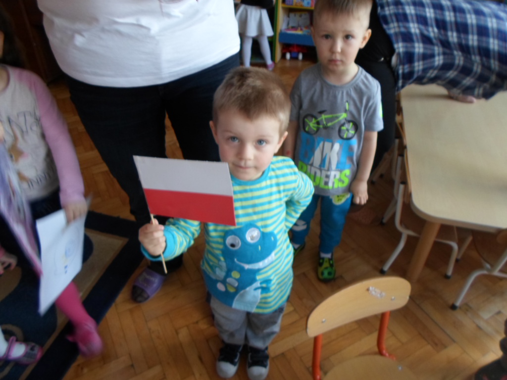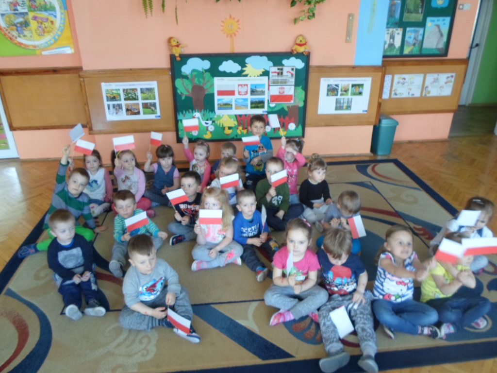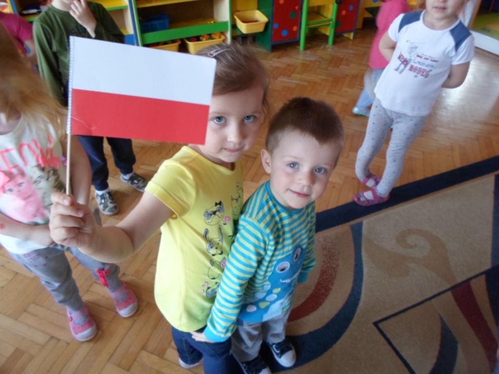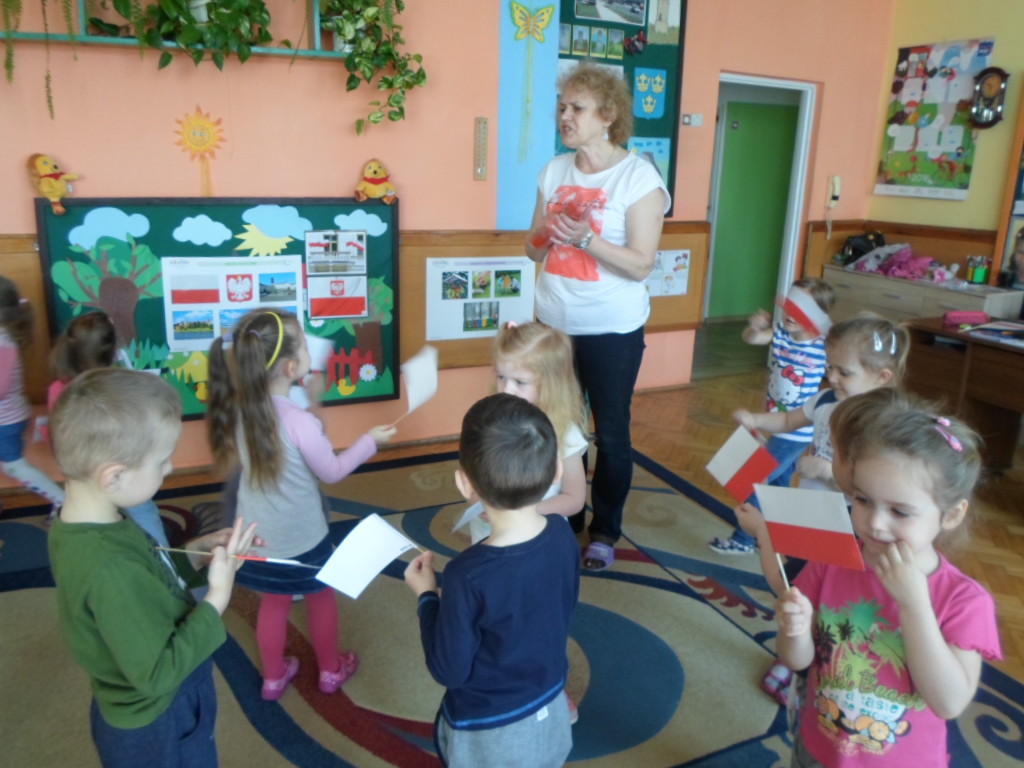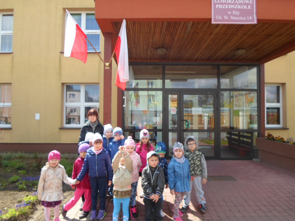 Ten szczególny dzień uczciliśmy wcześniej 30 kwietnia w naszym przedszkolu. Wszystkie grupy wykonały flagę i zabrały ją do domu, by ozdobić swoje okno. Uczyliśmy się także wiersza „Barwy ojczyste” Cz. Janczarskiego. Podczas spaceru obserwowaliśmy różne budynki ozdobione flagami – symbolem naszej polskości. Teraz już każde dziecko zna kolory na naszej fladze, a gdy zapomni to treść nauczonego wiersza podpowie: „Powiewa ,flaga gdy wiatr się zerwie, a na tej fladze biel jest i czerwień……”