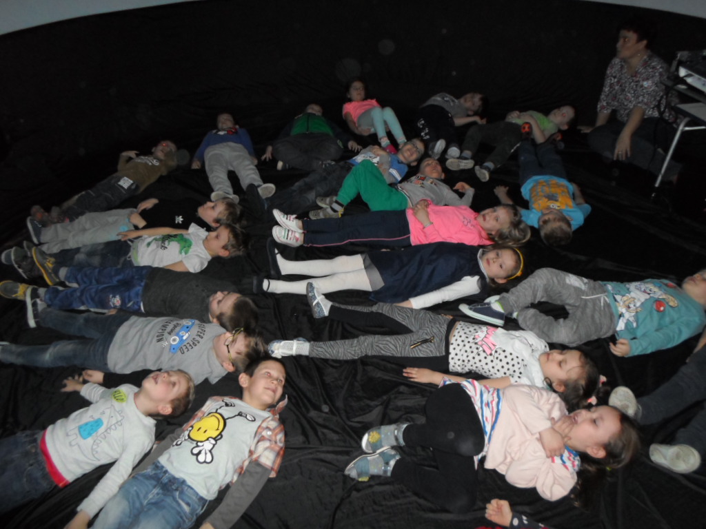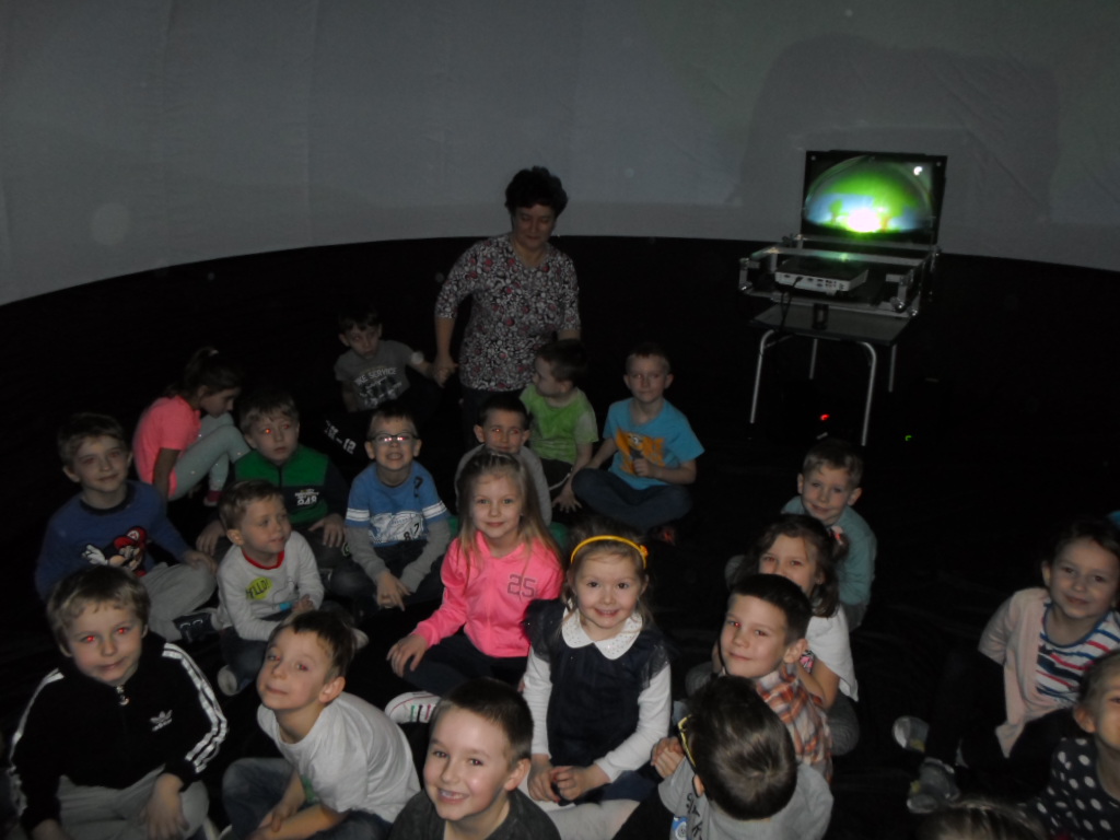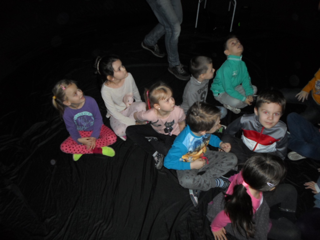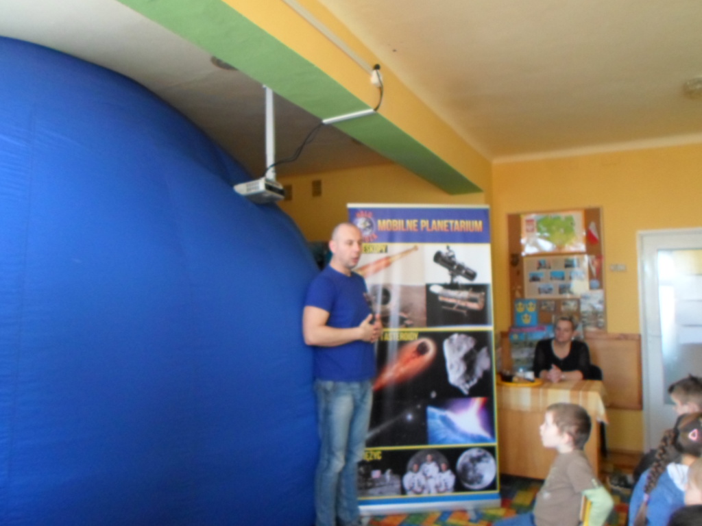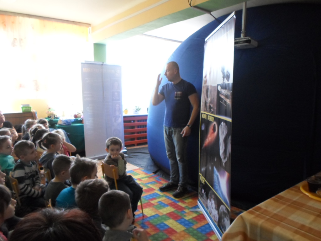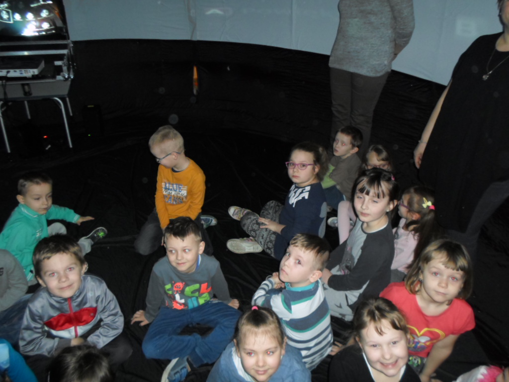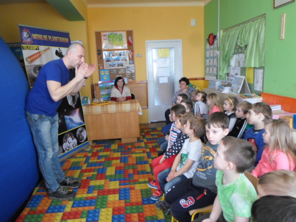 16-17.03.2017r. - wszystkie grupy naszej placówki mogły indywidualnie zgłębić tajniki Wszechświata. Dzieci dowiedziały się, dlaczego wyginęły dinozaury i jak udoskonalano przyrządy służące do obserwacji gwiazd i planet. Poznały suczkę Łajkę, która pierwsza wyleciała w kosmos i najodważniejszego człowieka Jurija Gagarina. Przedszkolaki zostały zapoznane z zasługami znanego na całym świecie astronoma - Mikołaja Kopernika, który ,,wstrzymał Słońce, ruszył Ziemię - polskie wydało go plemię". Za pomocą bajkowej opowieści ilustrowanej prezentowanej w mobilnym planetarium najmłodsi widzowie w przystępny i ciekawy sposób poznali kolejne planety Układu Słonecznego.