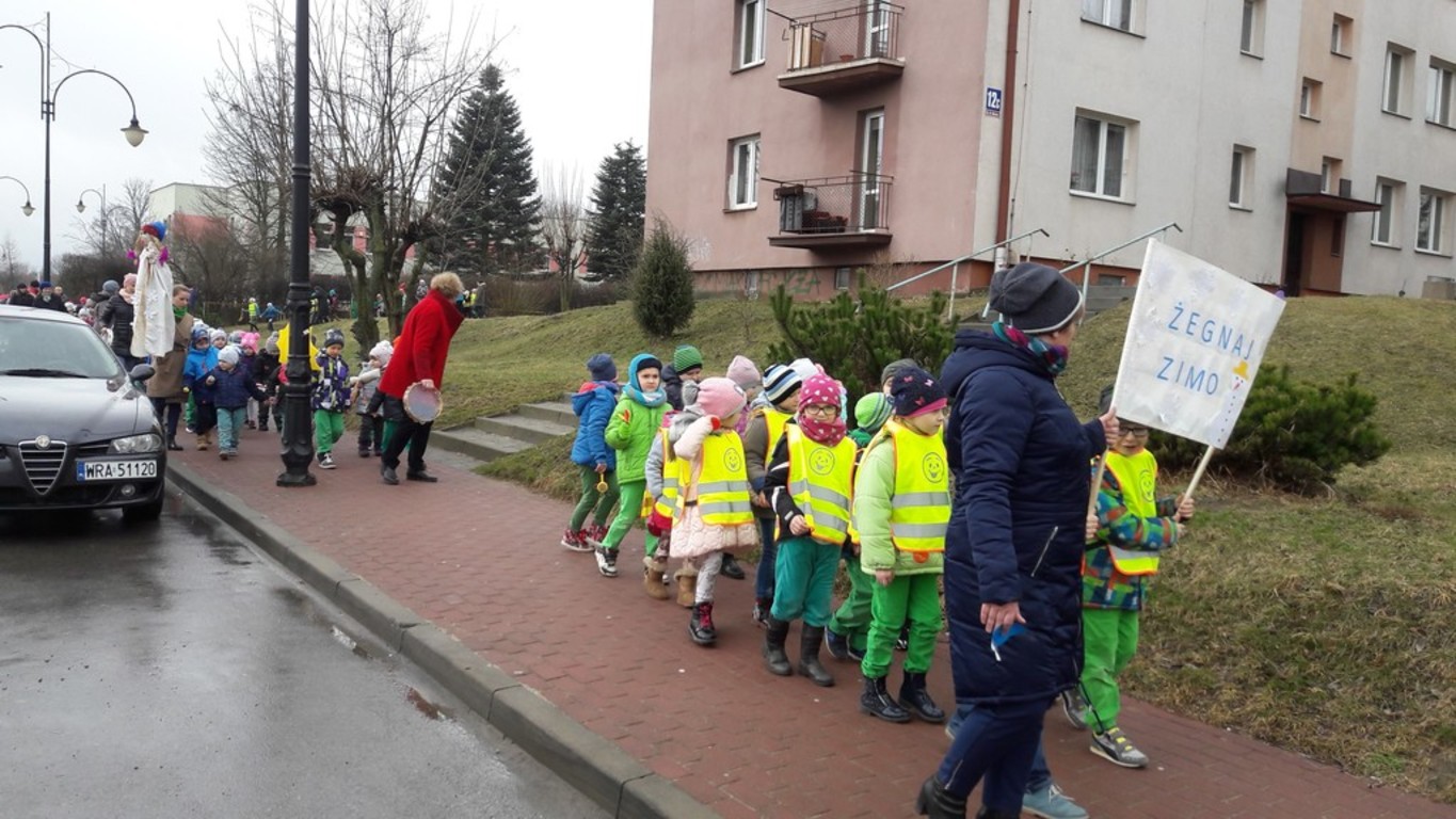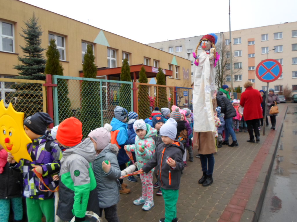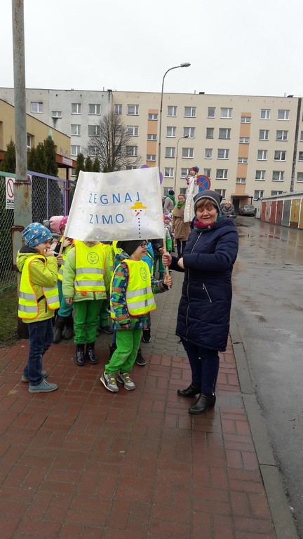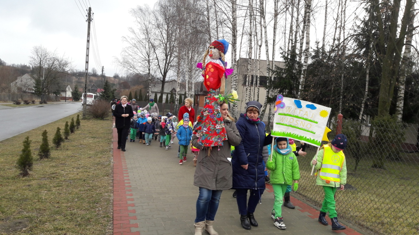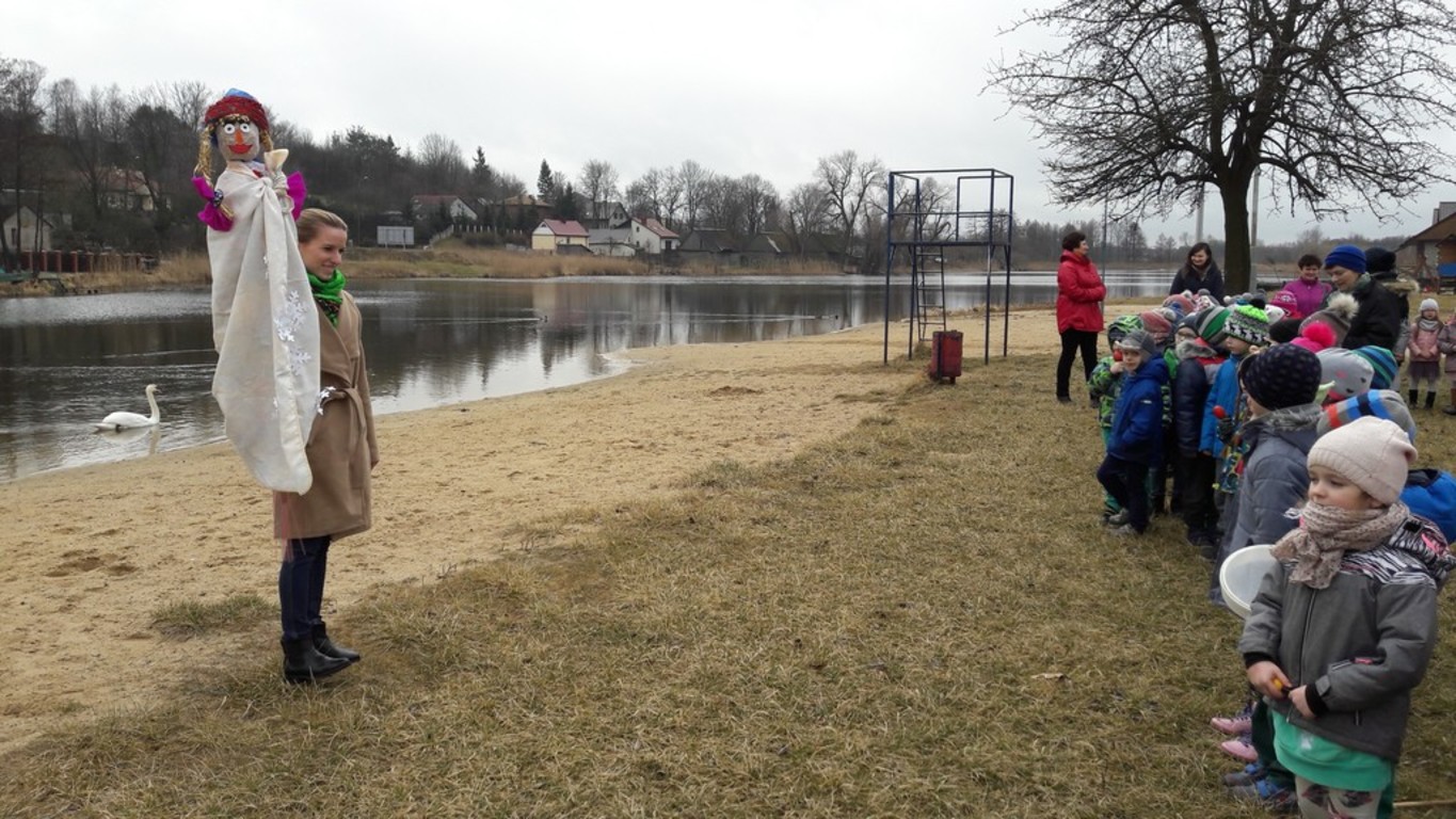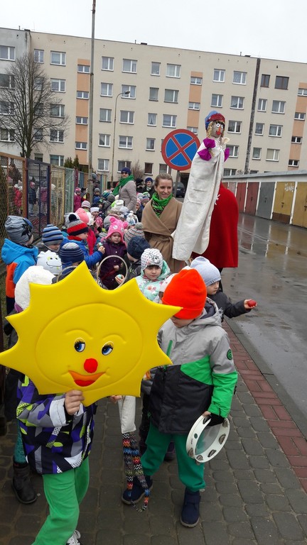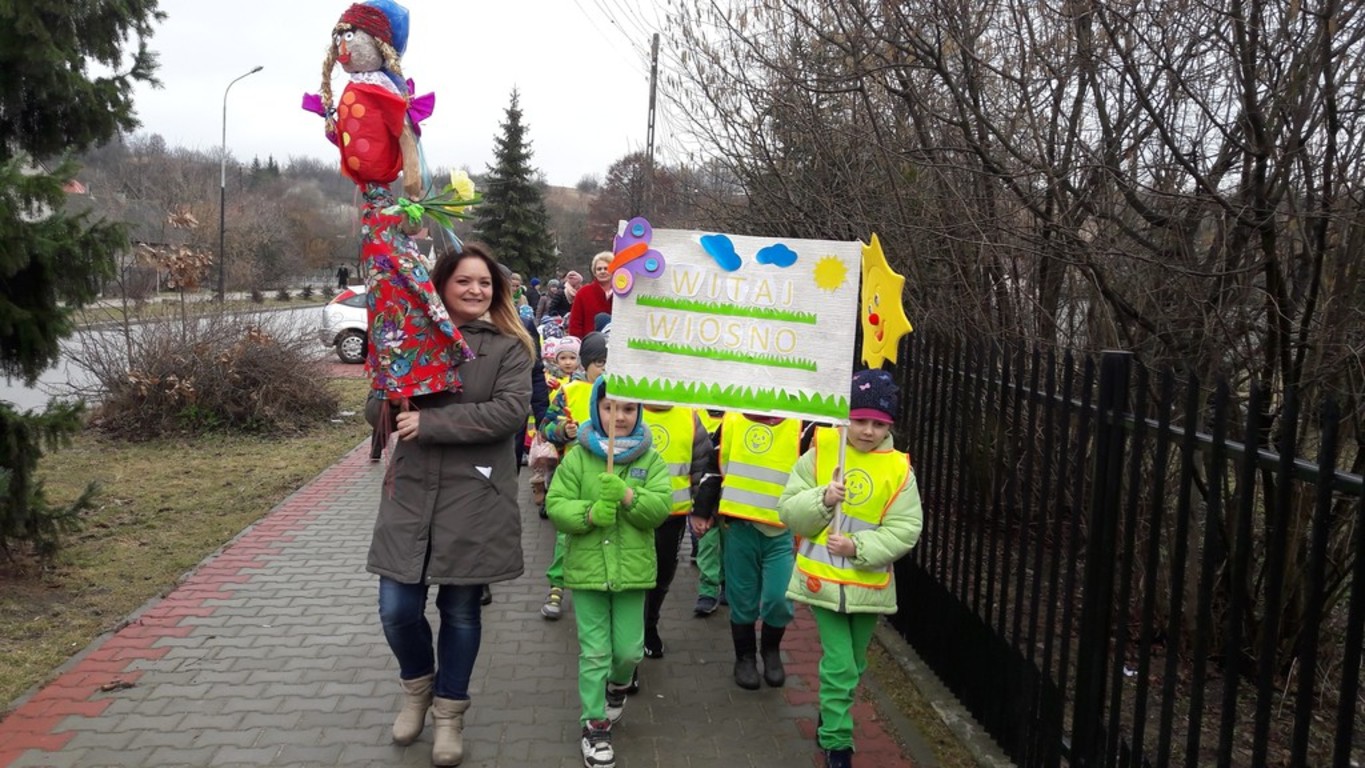Potem w barwnym pochodzie z transparentem "Żegnaj Zimo" i kukłą Pani Zimy oraz instrumentami udały się nad Iłżankę.Tam dzieci odrywały płatki śniegu z sukni Marzanny i wrzucały je do wody, mówiąc wierszyk pożegnalny. W drodze powrotnej niosły Panią Wiosnę i transparent "Witaj Wiosno"- śpiewały o niej piosenkę. Przed przedszkolem na każdą grupę czekały upominki od Wiosny - papierowe stokrotki.