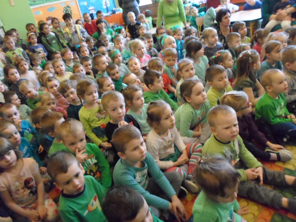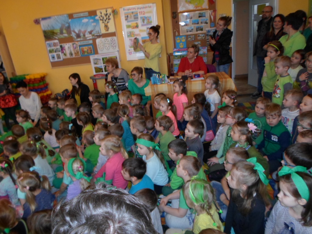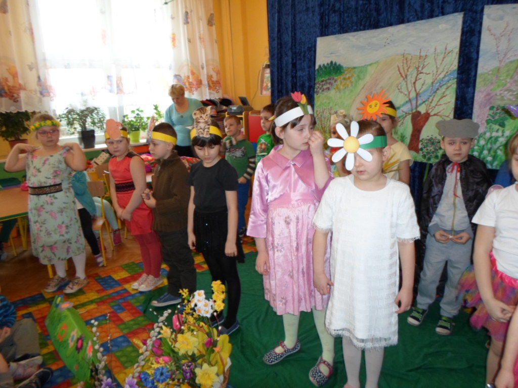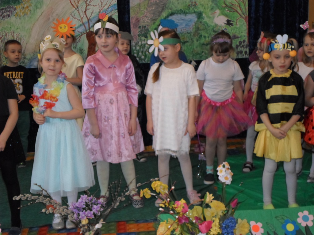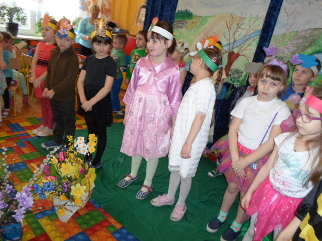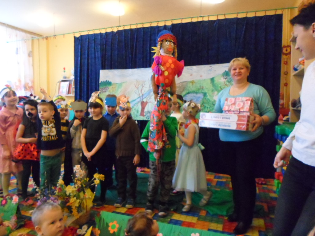 Najpierw przedszkolaki obejrzały montaż słowno-muzyczny "Witaj Wiosenko" w wykonaniu grupy IX "Słoneczka".