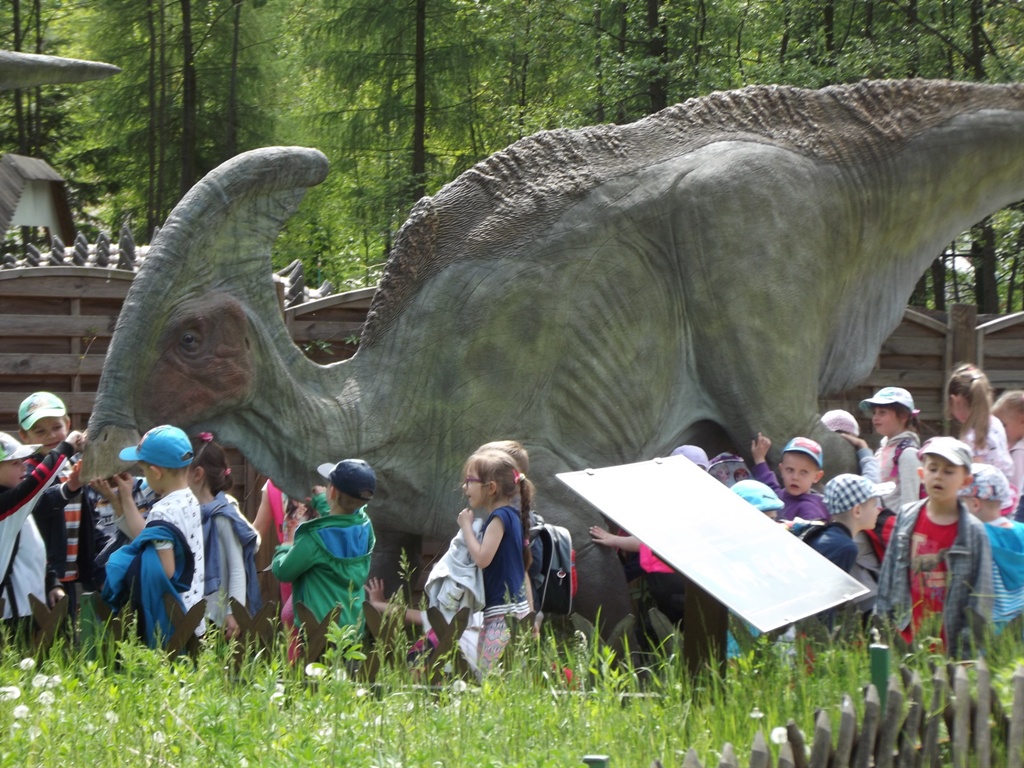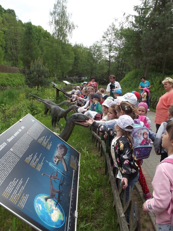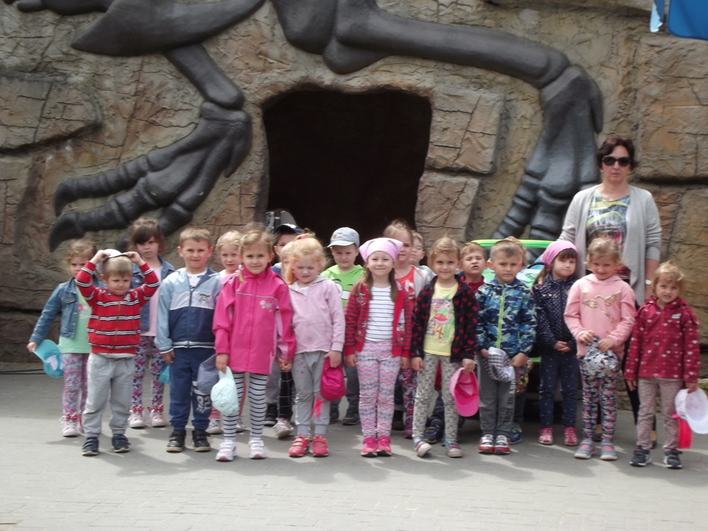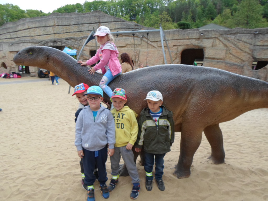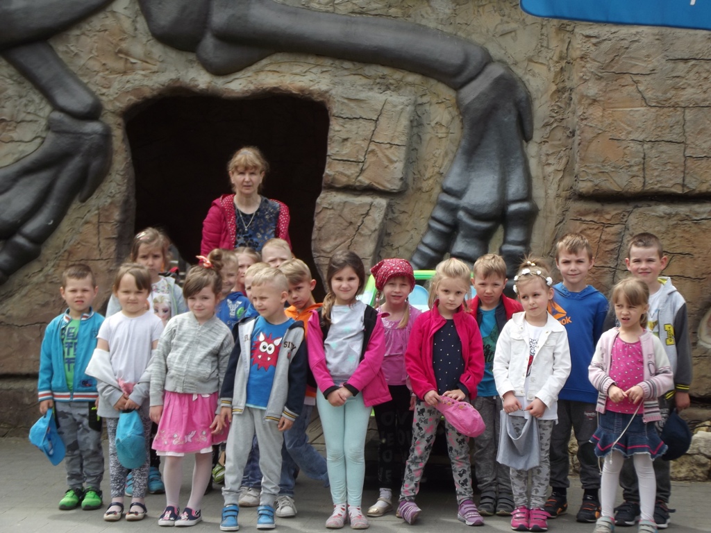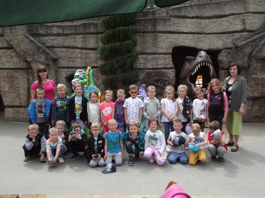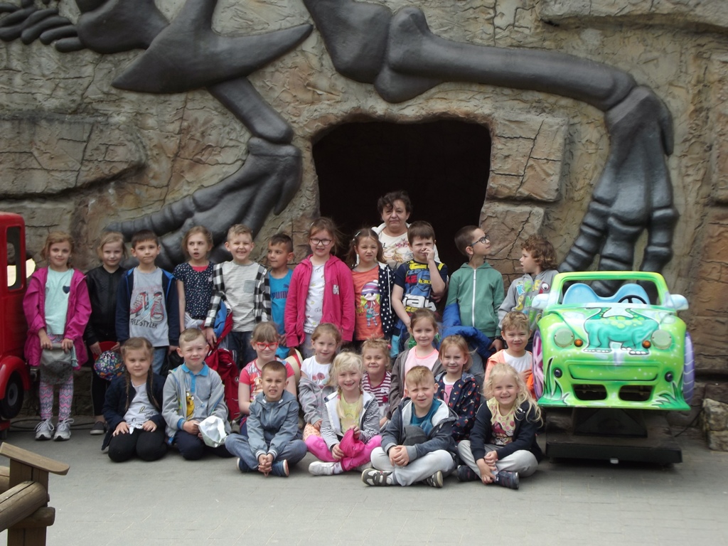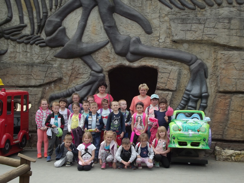 22 maja przedszkolaki ze wszystkich grup wraz z paniami opiekunkami i panią dyrektor zwiedziły Jura Park w Bałtowie.Pogoda była bardzo sprzyjająca wędrówkom śladami dinozaurów. Atrakcją dla dzieci było spędzenie czasu na placu zabaw oraz zwiedzanie parku z przewodnikiem i oglądanie dinozaurów naturalnej wielkości, m. in. T-Rexa, Allozaura, Triceratopsa. W Gondwanie- placu zabaw kreatywnych przedszkolaki mogły odkopać szkielet dinozaura oraz oglądać różne skamieliny. W Muzeum Jurajskim dzieci podziwiały zęby, kręgi i tropy dinozaurów. Wycieczka była dużym przedsięwzięciem, wszystko wypadło pomyślnie. Należy podkreślić, że nasi wychowankowie sprawdzili się świetnie w roli wycieczkowiczów, a 3 i 4 latki dzielnie zniosły długą wędrówkę i rozłąkę z rodzicami. Było super !!