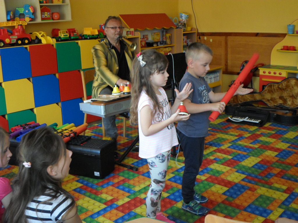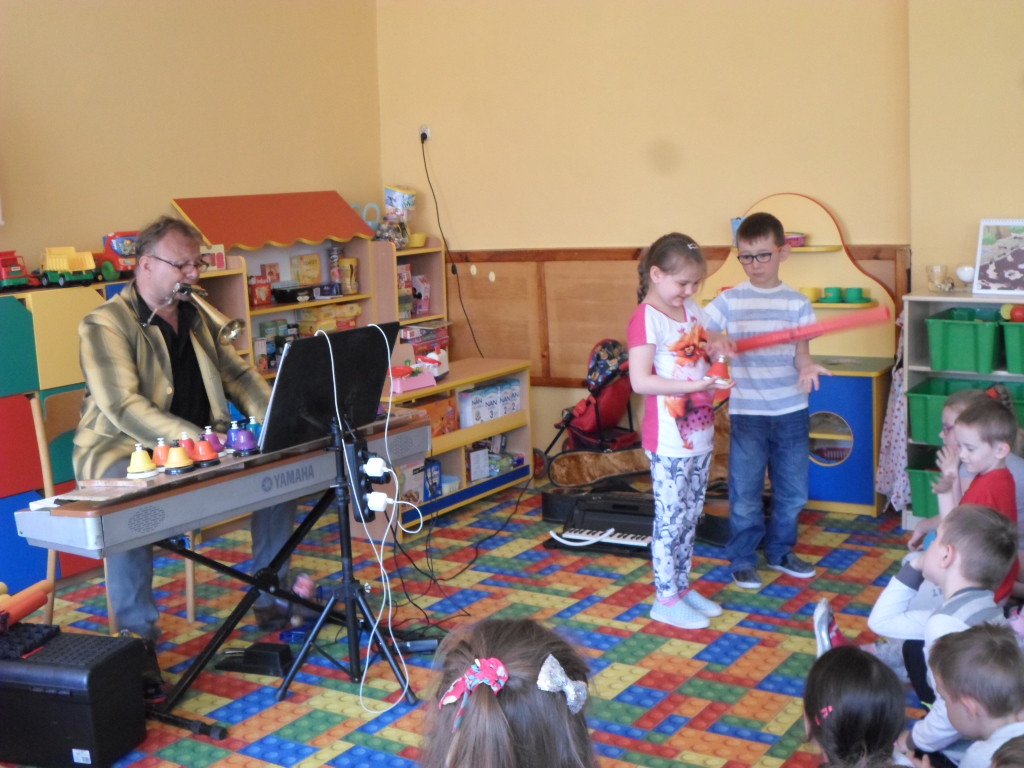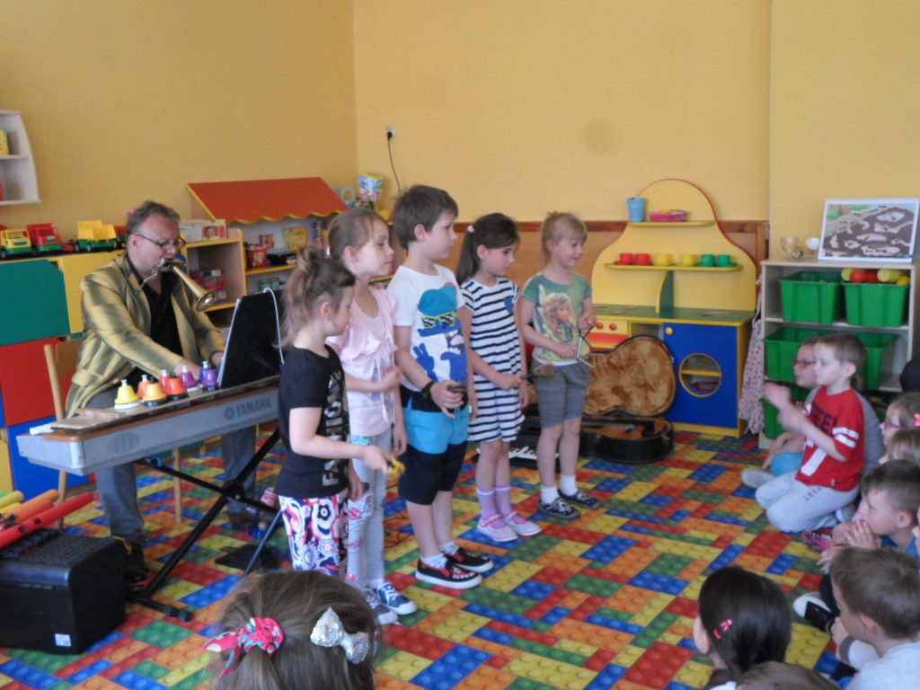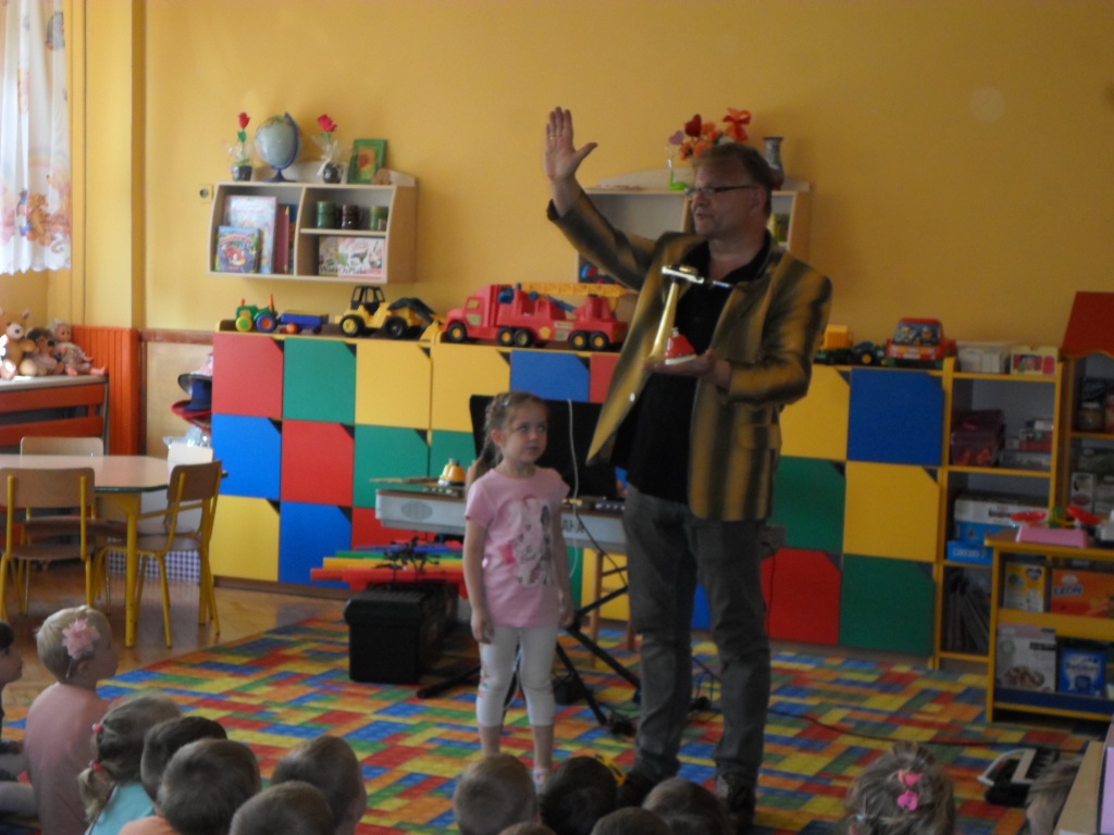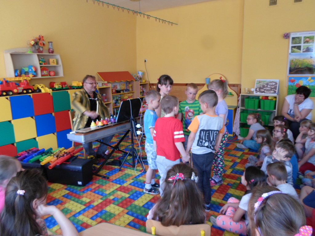 23 maja nasze przedszkole odwiedził pan Wiesław Pyzalski artysta muzyk, absolwent Instytutu Edukacji Muzycznej oraz zdobywca wielu nagród i wyróżnień.Zaprezentował dzieciom instrumenty perkusyjne, dęte, klawiszowe.Dzieciom podobały się bum bum rurki-instrumenty perkusyjne melodyczne. Muzyk grał jednocześnie na wielu instrumentach i śpiewał piosenki ,,Psie figle'', ,,Na wędrówkę", ,,Tęcza". Dzieci wysłuchały również utworów muzyki poważnej:,,Humoreska" A.Dworzaka i ,,Życzenie"F.Chopina w wykonaniu artysty.Przedszkolaki aktywnie uczestniczyły w spotkaniu,grały na instrumentach oraz rozpoznawały ich nazwy, śpiewały gamę,wyklaskiwały rytm, poznawały nuty, nazywały kolory podstawowe i pochodne. Audycja umożliwiła obcowanie z różnymi gatunkami muzycznymi,uczyła właściwej postawy przy percepcji muzyki oraz pobudzała do aktywności muzycznej.Pokazała możliwości interpretacyjno-wykonawcze. Występ podobał się dzieciom,artysta często był nagradzany gromkimi brawami.