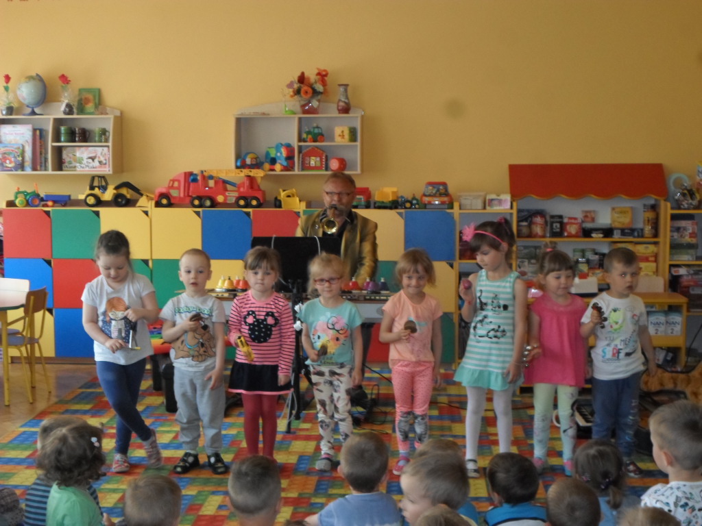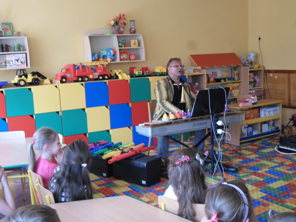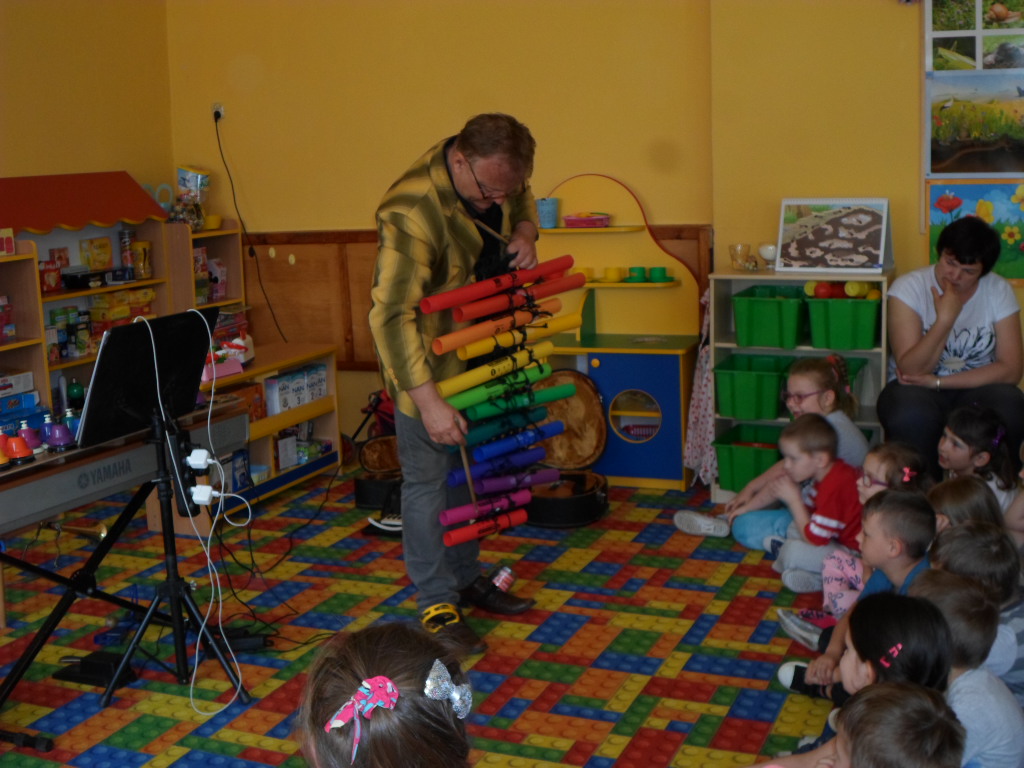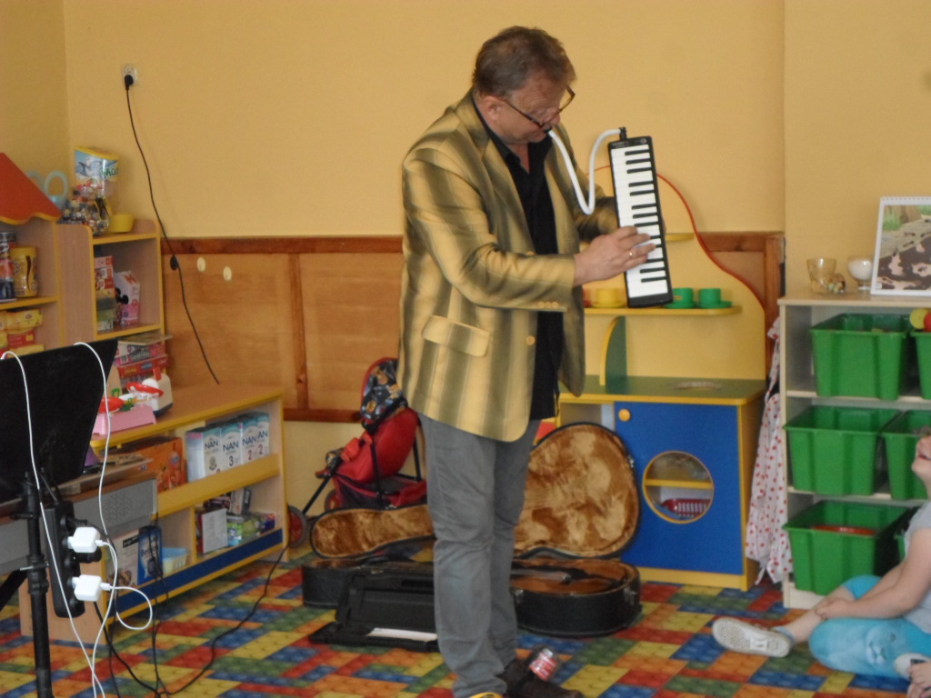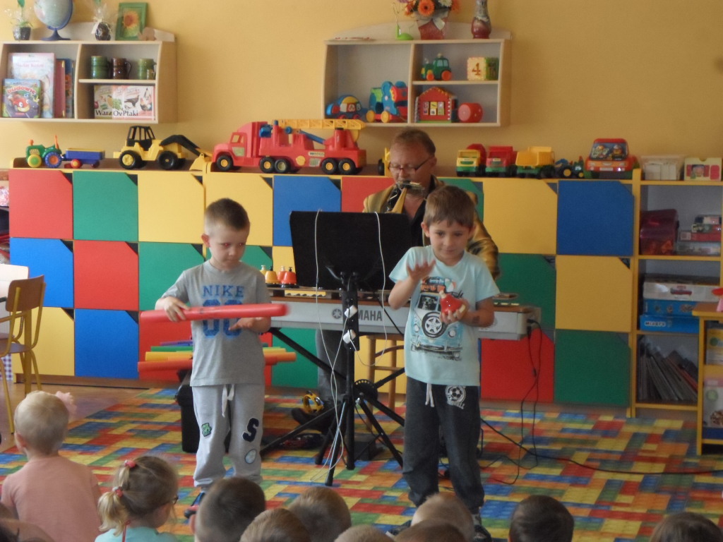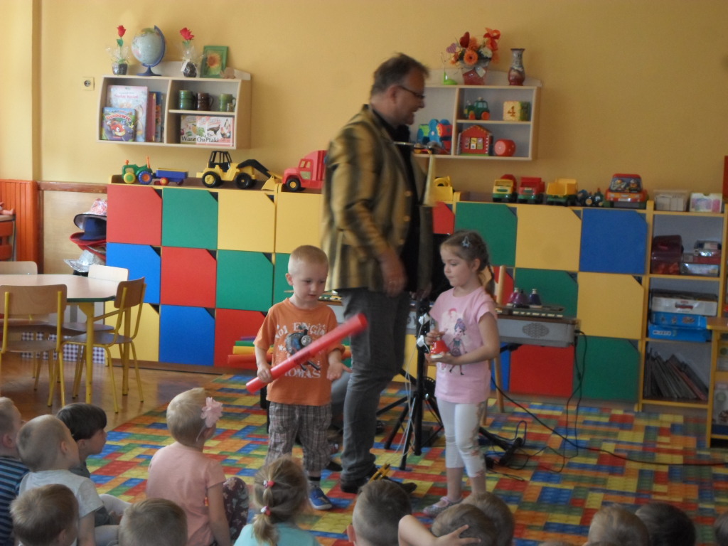 23 maja nasze przedszkole odwiedził pan Wiesław Pyzalski artysta muzyk, absolwent Instytutu Edukacji Muzycznej oraz zdobywca wielu nagród i wyróżnień.Zaprezentował dzieciom instrumenty perkusyjne, dęte, klawiszowe.Dzieciom podobały się bum bum rurki-instrumenty perkusyjne melodyczne. Muzyk grał jednocześnie na wielu instrumentach i śpiewał piosenki ,,Psie figle'', ,,Na wędrówkę", ,,Tęcza". Dzieci wysłuchały również utworów muzyki poważnej:,,Humoreska" A.Dworzaka i ,,Życzenie"F.Chopina w wykonaniu artysty.Przedszkolaki aktywnie uczestniczyły w spotkaniu,grały na instrumentach oraz rozpoznawały ich nazwy, śpiewały gamę,wyklaskiwały rytm, poznawały nuty, nazywały kolory podstawowe i pochodne. Audycja umożliwiła obcowanie z różnymi gatunkami muzycznymi,uczyła właściwej postawy przy percepcji muzyki oraz pobudzała do aktywności muzycznej.Pokazała możliwości interpretacyjno-wykonawcze. Występ podobał się dzieciom,artysta często był nagradzany gromkimi brawami.