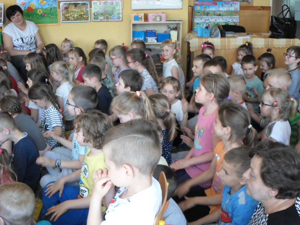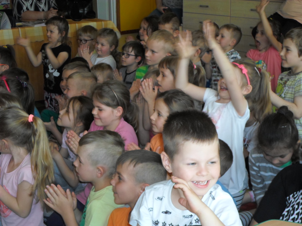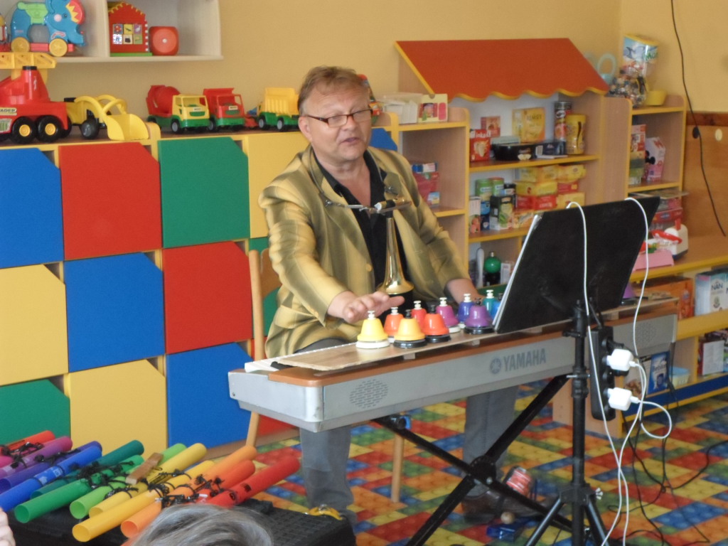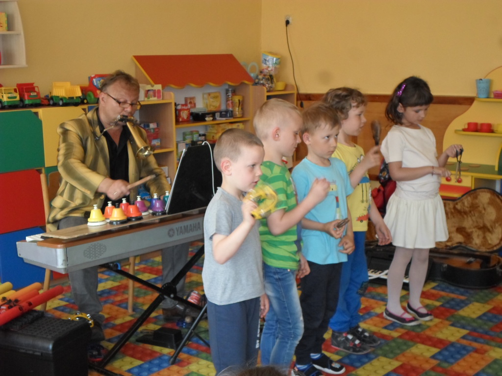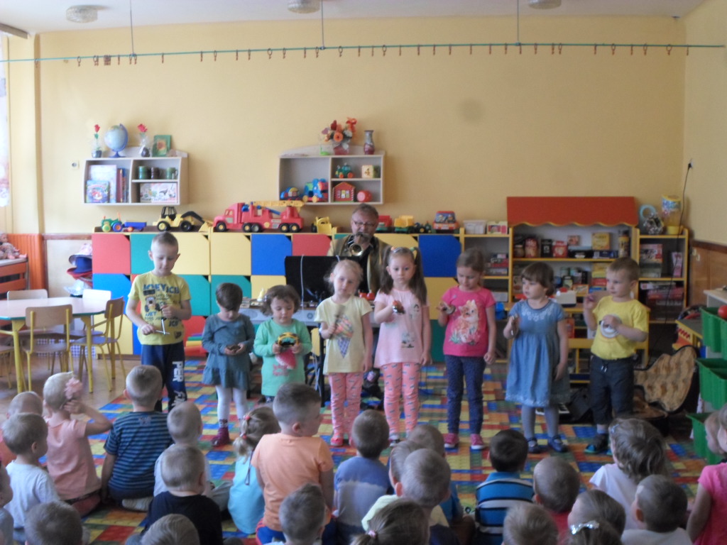 23 maja nasze przedszkole odwiedził pan Wiesław Pyzalski artysta muzyk, absolwent Instytutu Edukacji Muzycznej oraz zdobywca wielu nagród i wyróżnień.Zaprezentował dzieciom instrumenty perkusyjne, dęte, klawiszowe.Dzieciom podobały się bum bum rurki-instrumenty perkusyjne melodyczne. Muzyk grał jednocześnie na wielu instrumentach i śpiewał piosenki ,,Psie figle'', ,,Na wędrówkę", ,,Tęcza". Dzieci wysłuchały również utworów muzyki poważnej:,,Humoreska" A.Dworzaka i ,,Życzenie"F.Chopina w wykonaniu artysty.Przedszkolaki aktywnie uczestniczyły w spotkaniu,grały na instrumentach oraz rozpoznawały ich nazwy, śpiewały gamę,wyklaskiwały rytm, poznawały nuty, nazywały kolory podstawowe i pochodne. Audycja umożliwiła obcowanie z różnymi gatunkami muzycznymi,uczyła właściwej postawy przy percepcji muzyki oraz pobudzała do aktywności muzycznej.Pokazała możliwości interpretacyjno-wykonawcze. Występ podobał się dzieciom,artysta często był nagradzany gromkimi brawami.