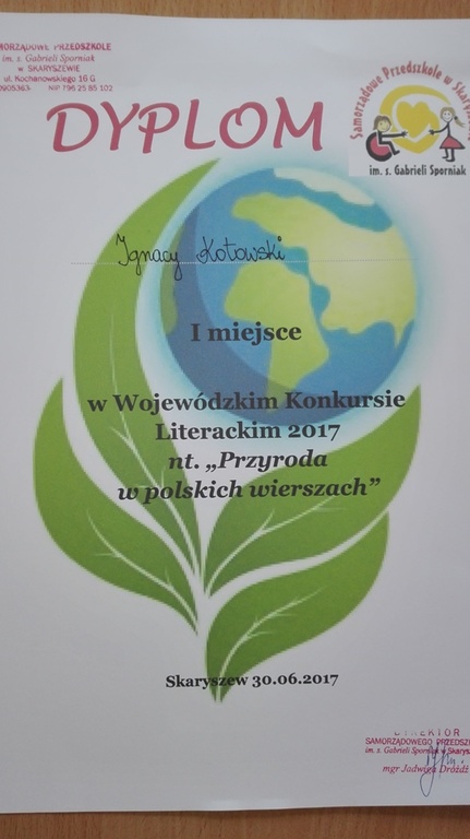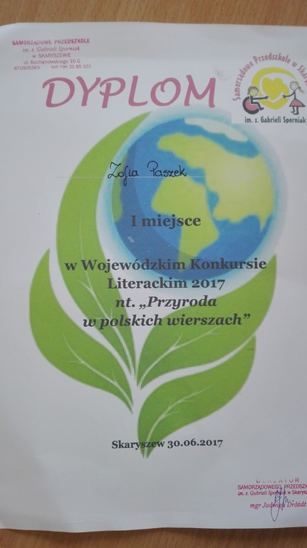 Dnia 30.05.2017r. odbył się Wojewódzki Konkurs Literacki "Przyroda w polskich wierszach". Organizatorem konkursu było Samorządowe Przedszkole w Skaryszewie.