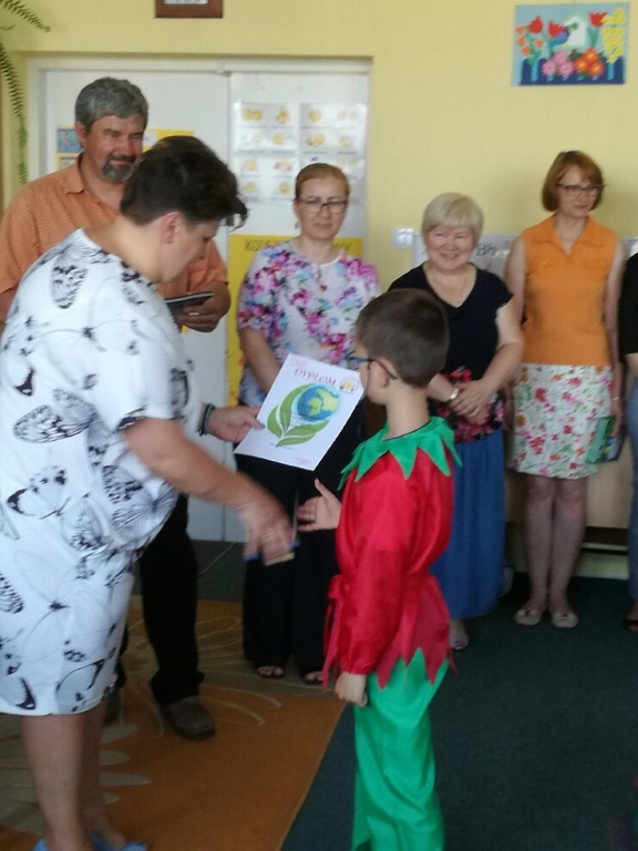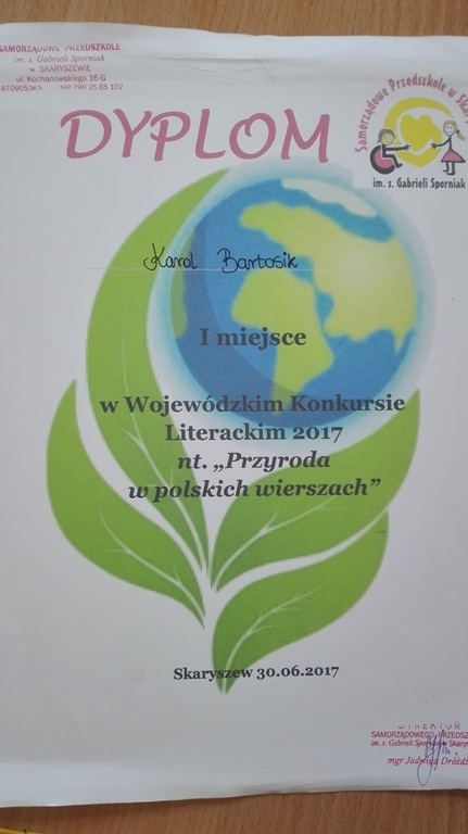 Każdy uczestnik otrzymał dyplom za udział oraz nagrodę książkową. Otrzymaliśmy również nagrodę Dyrektor Przedszkola w postaci książek a także sadzonkę ozdobnego drzewka.