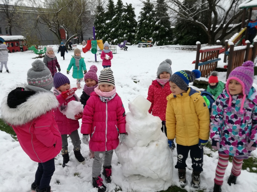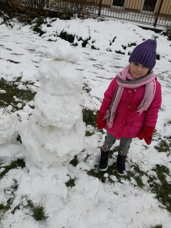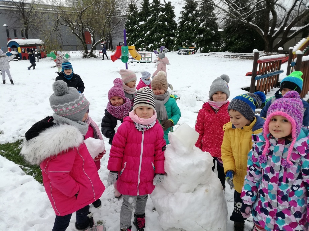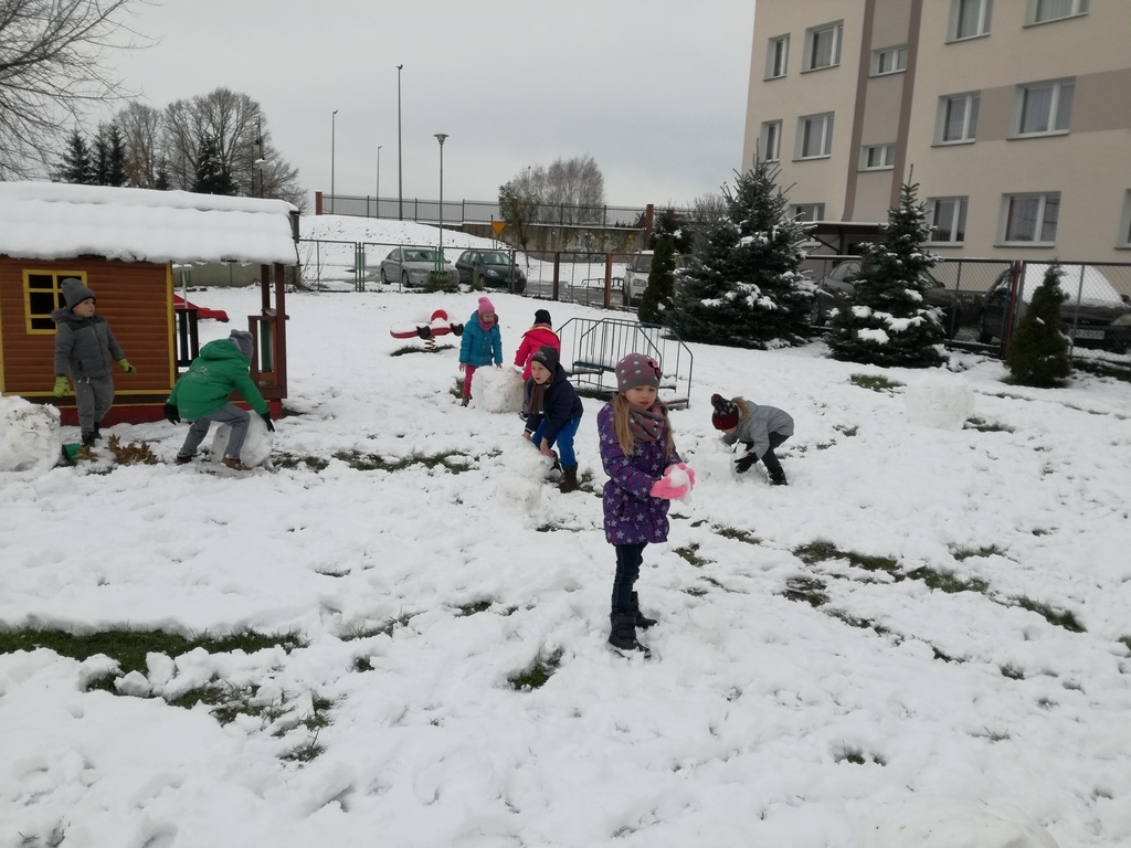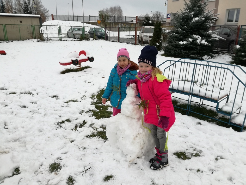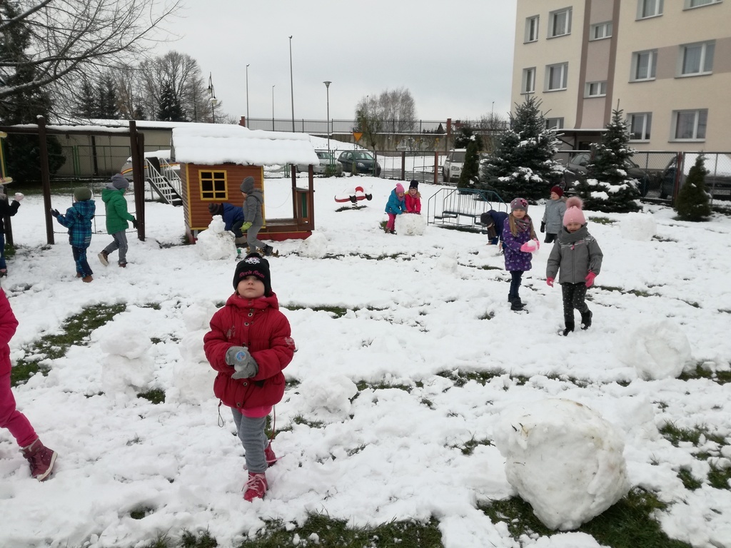 Zabawa w białym puchu przyniosła wiele radości przedszkolakom.