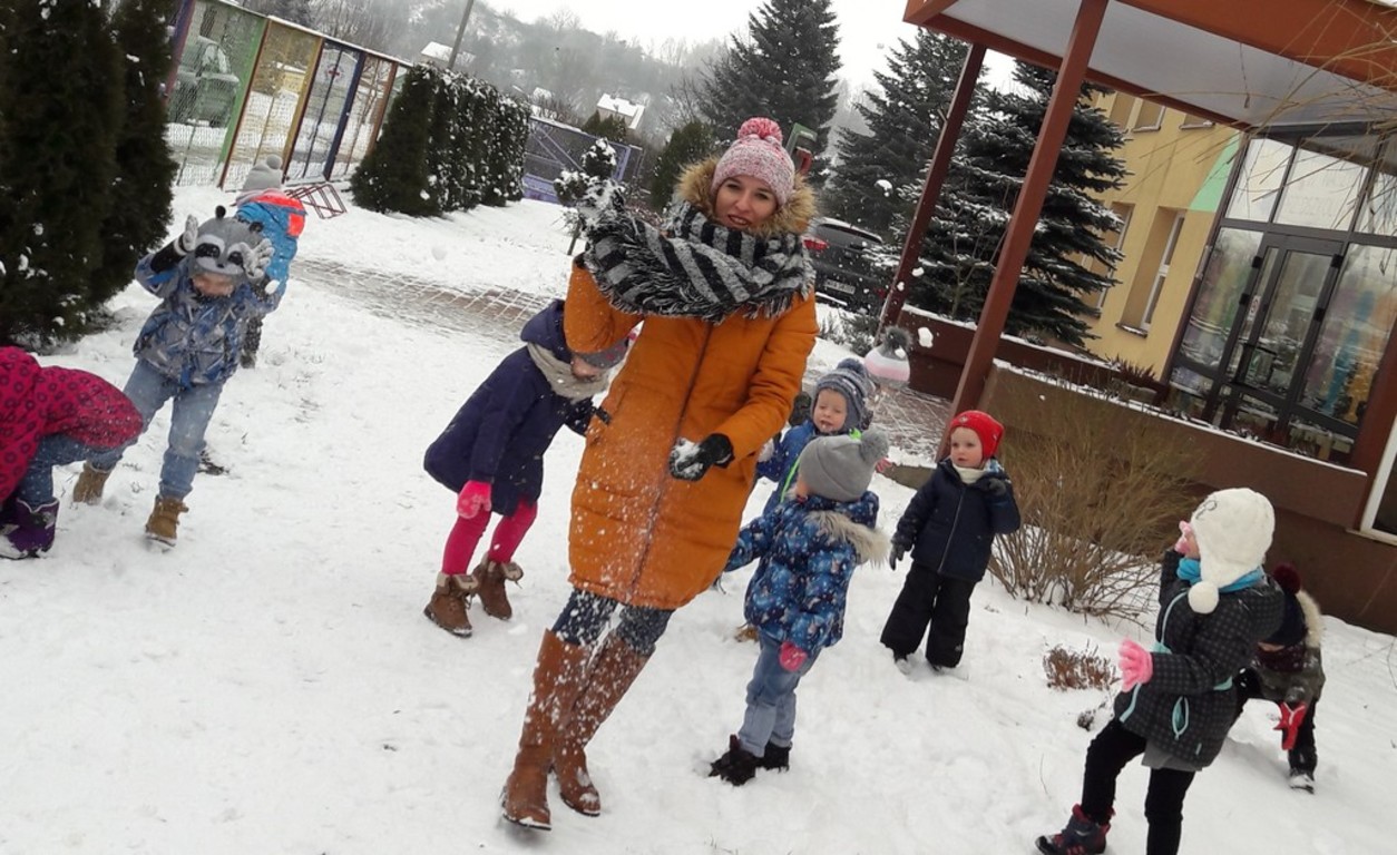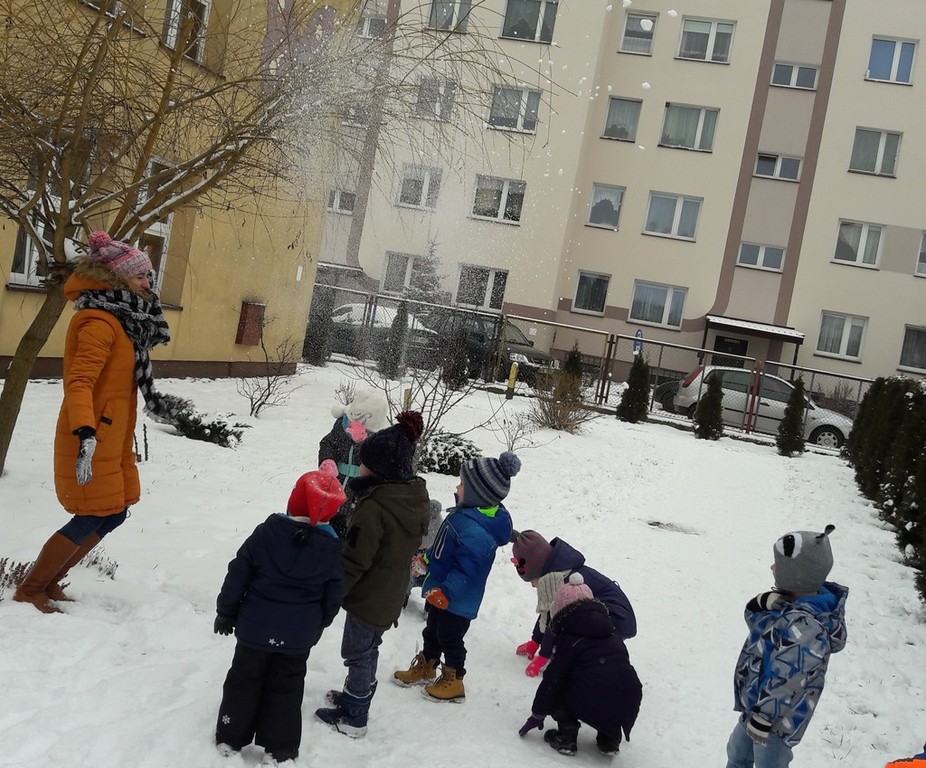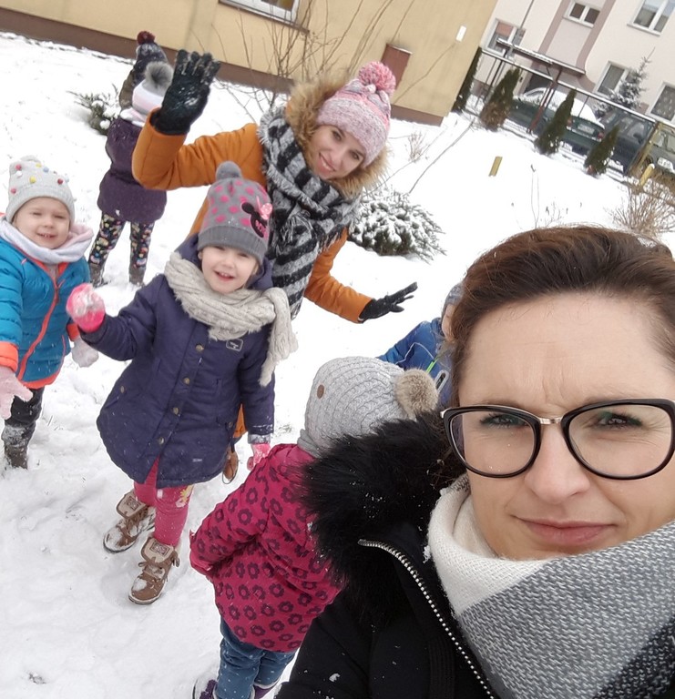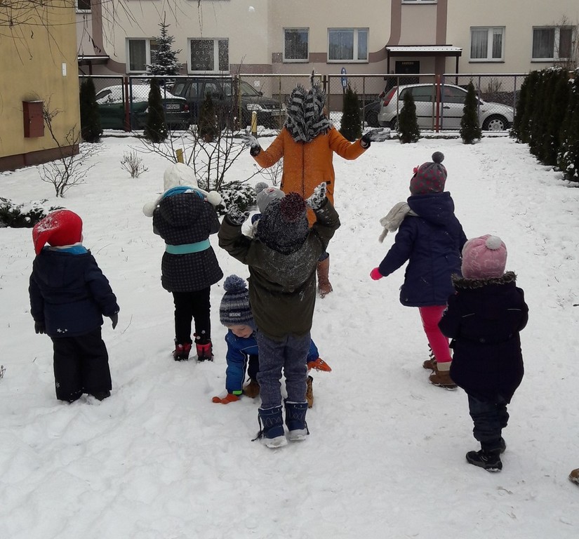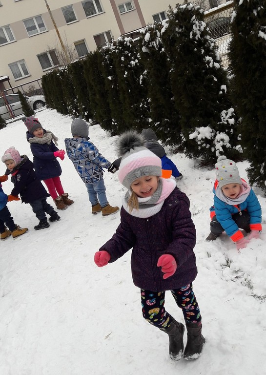 Tegoroczna zima płata nam figle, raz jest ciepło, a raz mroźno. dlatego korzystając z jej uroku maluszki postanowiły pobawić się na śniegu przed naszym przedszkolem, starsze dzieci natomiast wybrały się do przedszkolnego ogrodu i tam odbyła się prawdziwa bitwa na śnieżki:)