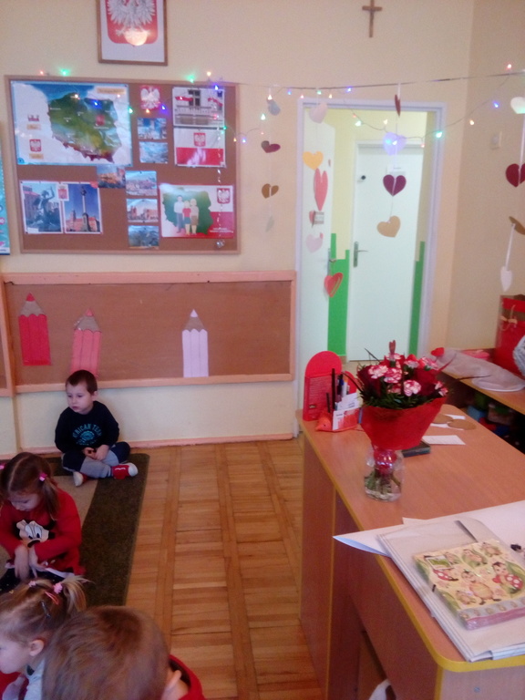 Maluszki wędrowały po przedszkolu z Walentynkami dla Pani Dyrektor, Pani Intendentki i pań pracujących na kuchni. Na koniec tego czerwonego dnia każde dziecko otrzymało drobny upominek i baloniki od pań. Dekoracje w salach umiliły nam spędzenie tego dnia w serduszkowej atmosferze.