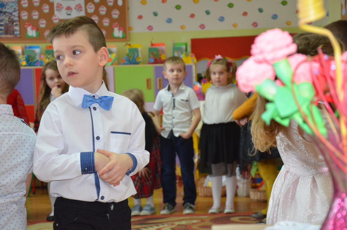 Dalszą częśc naszego koncertu życzeń poprowadziła jak zwykle niezastąpiona Pani Asia, która zapowiedziała i przedstawiła każdą grupę przedszkolną a na koniec w imieniu dzieci wręczyła gościom kolorowe kwiatuszki.