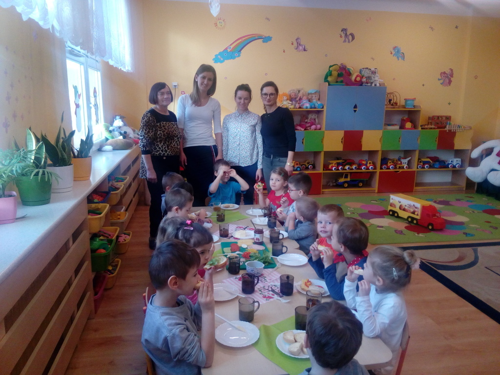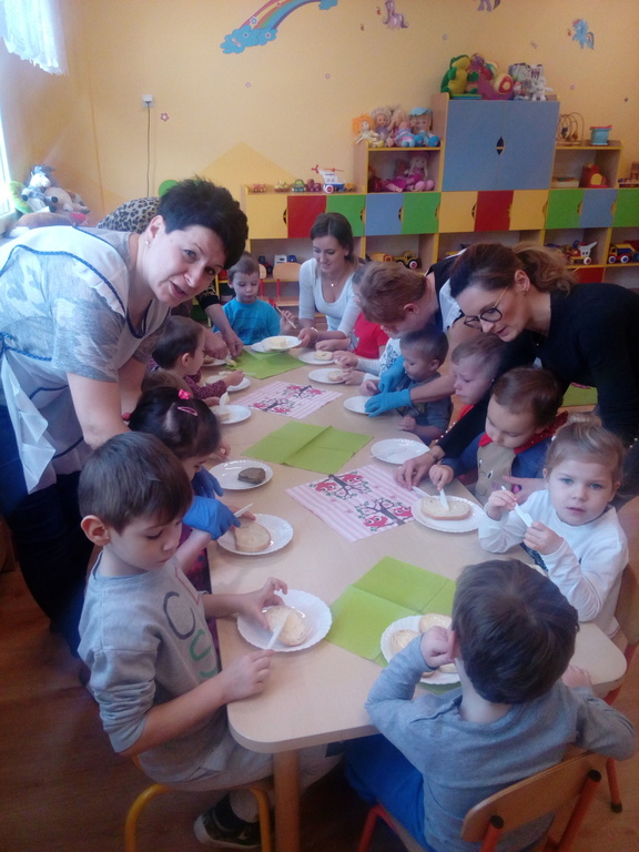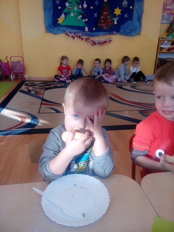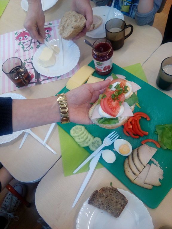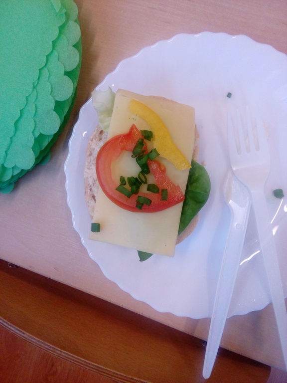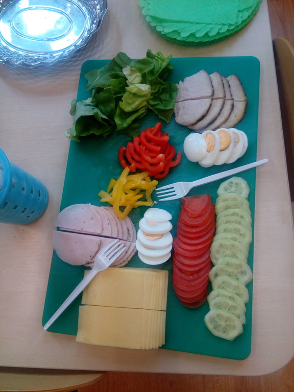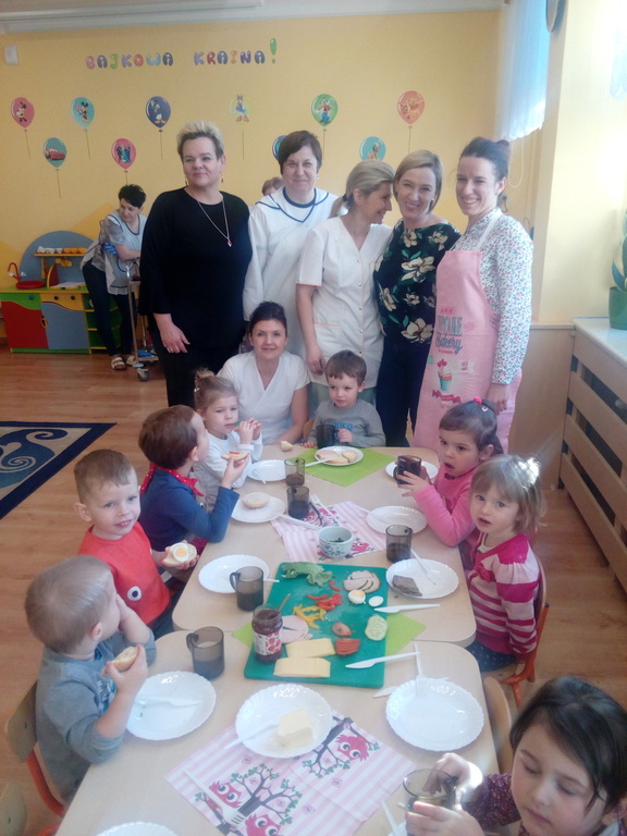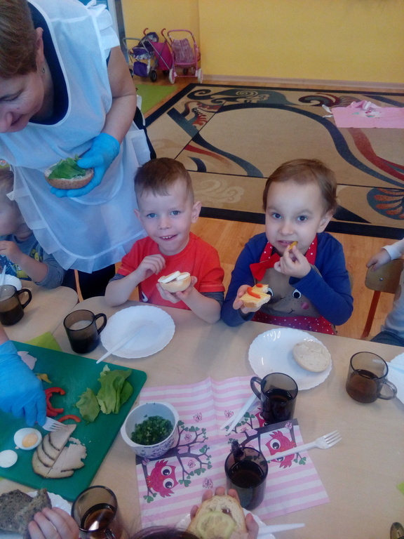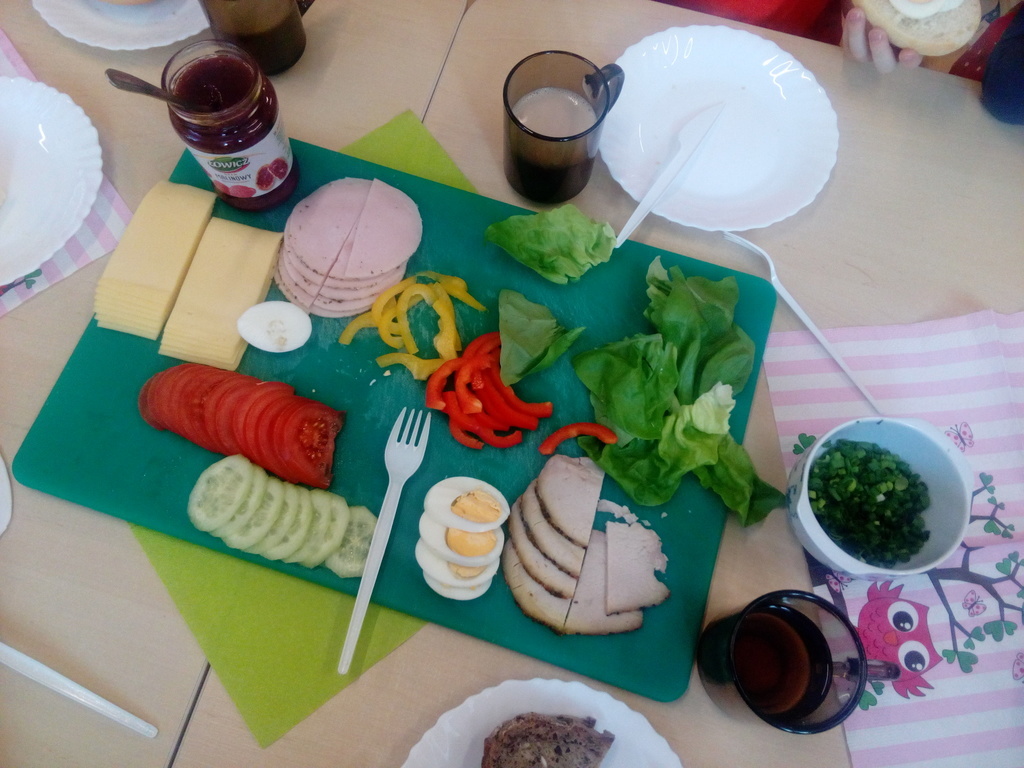Dzień rozpoczął się dla nas niezywkle intensywnie. Po porannej zbawie i wspólnej gimnastyce dzieci zabrały się za przygotowanie wspólnego śnaidania - zdrowych kanapeczek. Wszystkie składniki przygotowały panie pracujące na kuchni. Dzieci , poinstruowane przez nauczycieli, samodzielnie przygotowały swoje kanapki według własnego pomysłu i smaku. Ku naszemu zaskoczeniu wiele dzieci sięgnęło po warzywa, takie jak: sałata, papryka, ogórek, pomidor, szczypiorek. Nawet te dzieci. które na co dzień stronią od warzyw, tego dnia zjadały je chętnie.