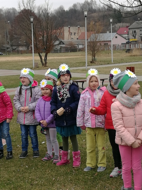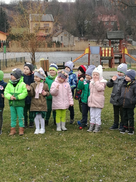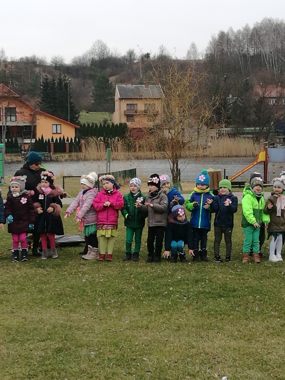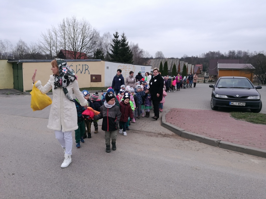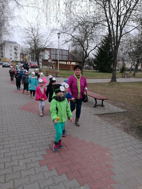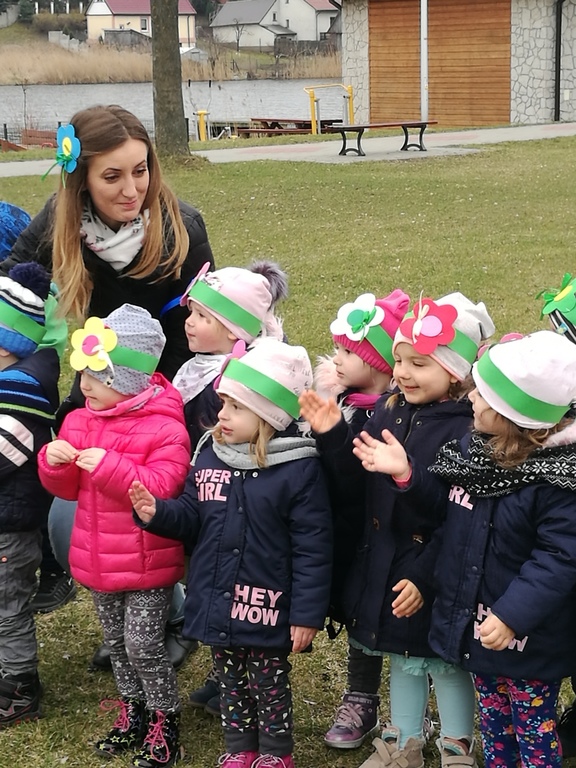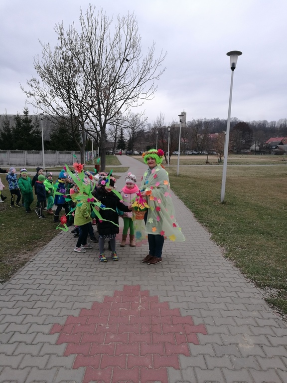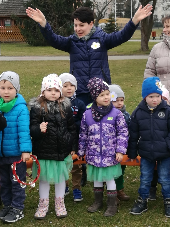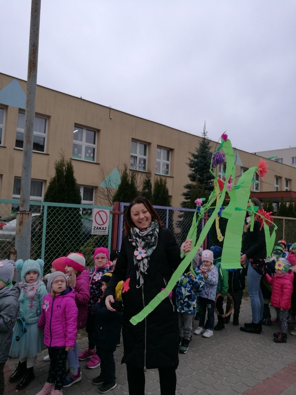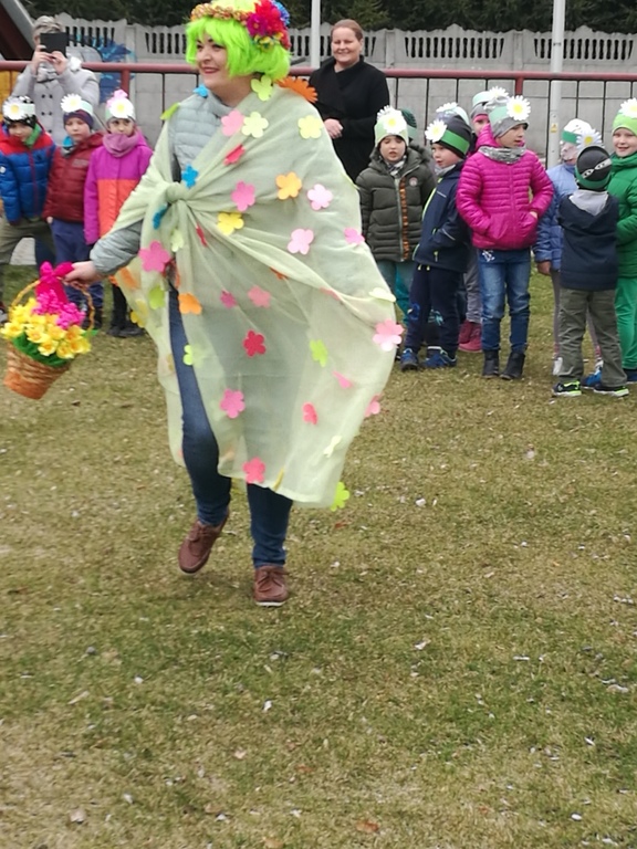 W czwartek 21.03.2019r dzieci z naszego przedszkola wzięły udział w uroczystym Powitaniu Wiosny. Wszystkie grupy z przedszkola oraz szkoły podstawowej udały się na MGOSiR w prawdziwie wiosennym korowodzie. Dzieci pożegnały Panią Zimę, której symbolem była kukła "Marzanna". Przegoniły Zimę specjalnie przygotowanym wierszem oraz piosenką, a także w ten sam sposób zaprosiły Panią Wiosnę, by na dobre zagościła wśród nas. Dzieci oznajmiały wszystkim mieszkańcom przybycie Wiosny poprzez granie na intrumentach perkusyjnych oraz grzechotkach. W tym dniu większość dzieci ubrało się także w kolorze zielonym, symbolizującym nadejście Wiosny.