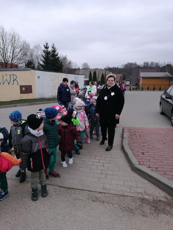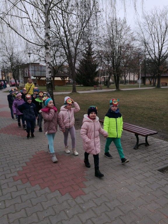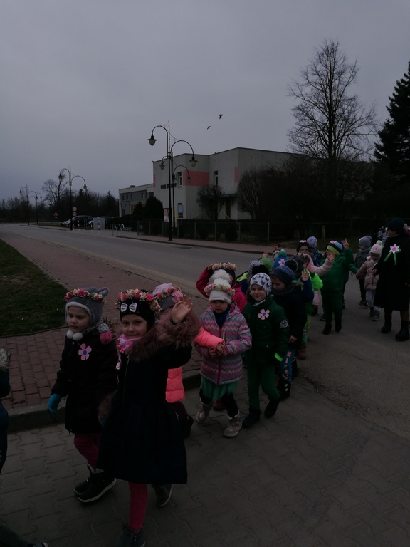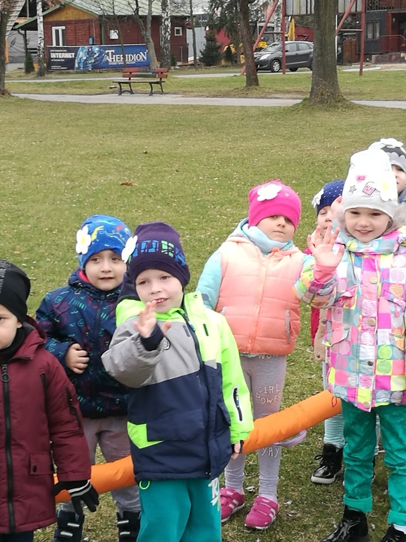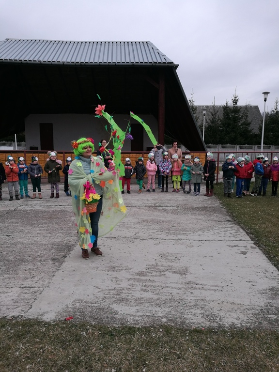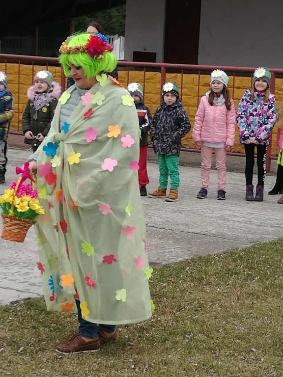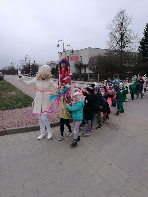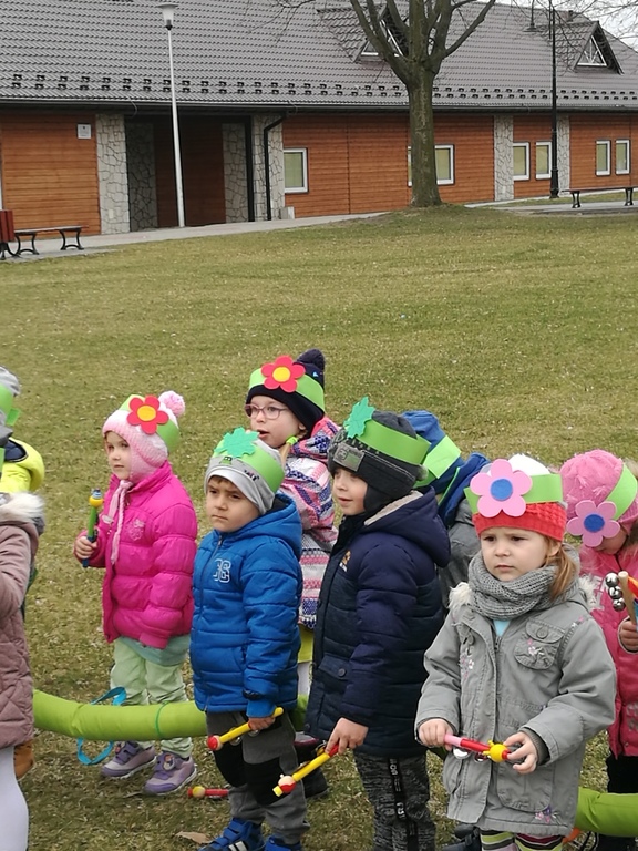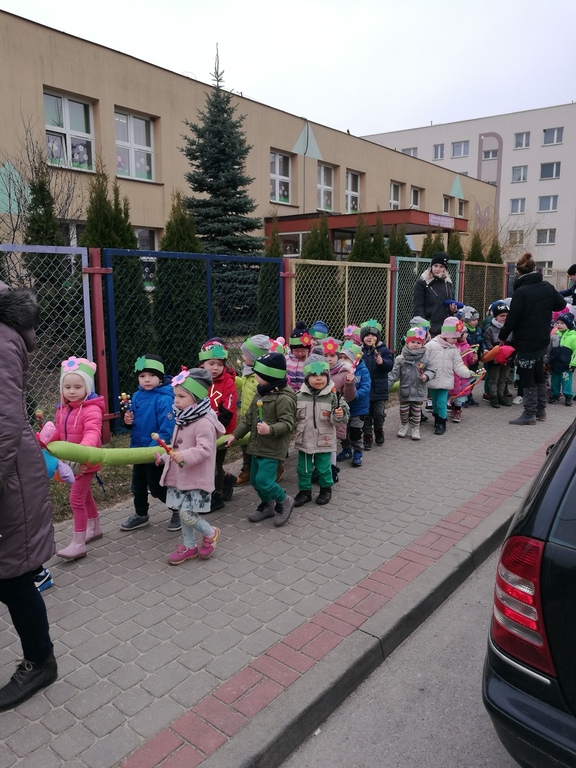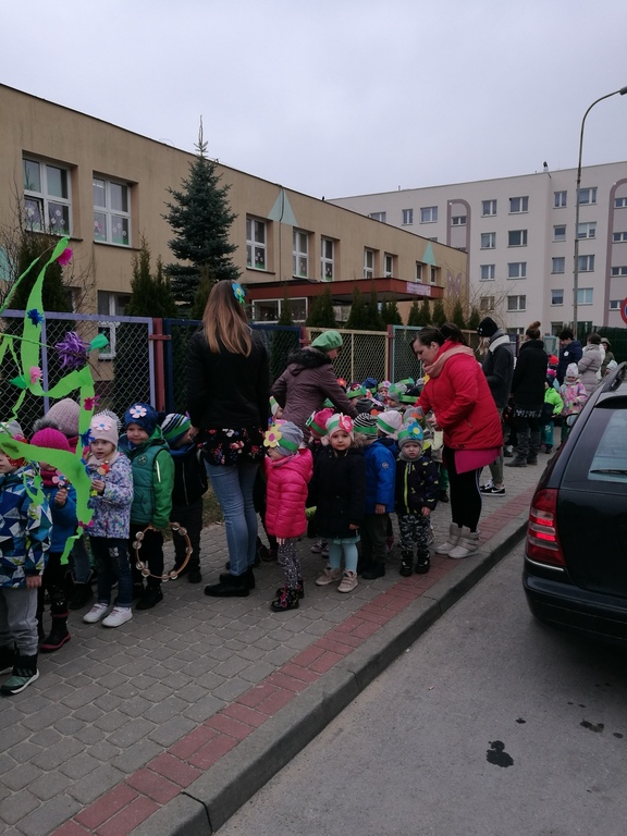 W czwartek 21.03.2019r dzieci z naszego przedszkola wzięły udział w uroczystym Powitaniu Wiosny. Wszystkie grupy z przedszkola oraz szkoły podstawowej udały się na MGOSiR w prawdziwie wiosennym korowodzie. Dzieci pożegnały Panią Zimę, której symbolem była kukła "Marzanna". Przegoniły Zimę specjalnie przygotowanym wierszem oraz piosenką, a także w ten sam sposób zaprosiły Panią Wiosnę, by na dobre zagościła wśród nas. Dzieci oznajmiały wszystkim mieszkańcom przybycie Wiosny poprzez granie na intrumentach perkusyjnych oraz grzechotkach. W tym dniu większość dzieci ubrało się także w kolorze zielonym, symbolizującym nadejście Wiosny.