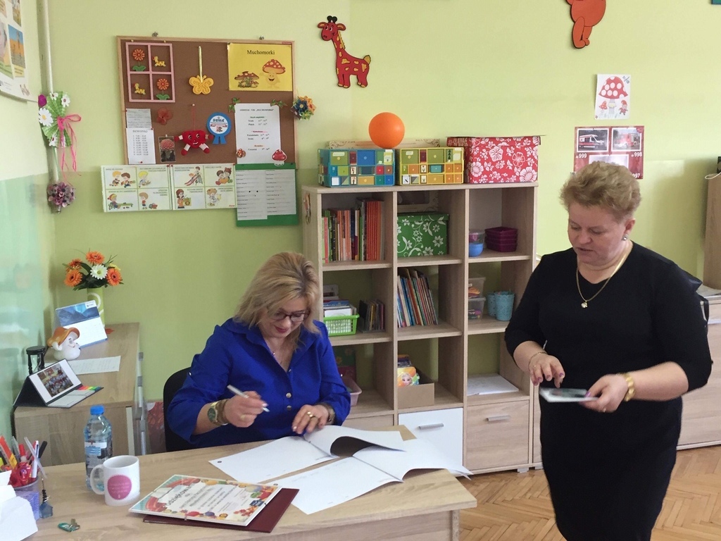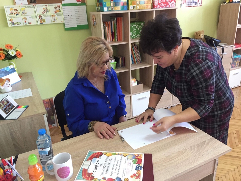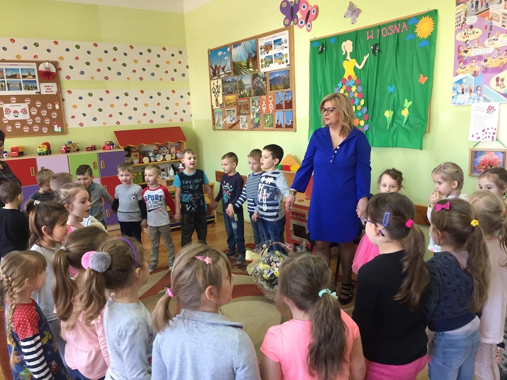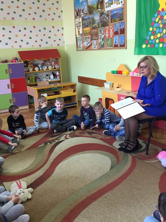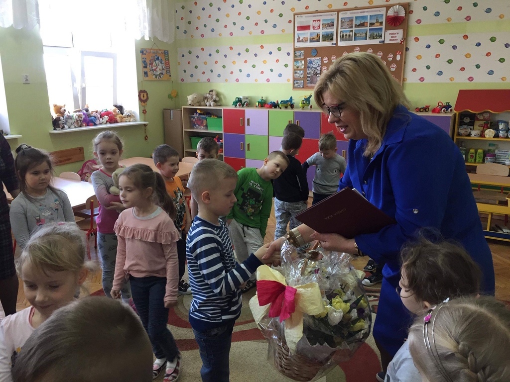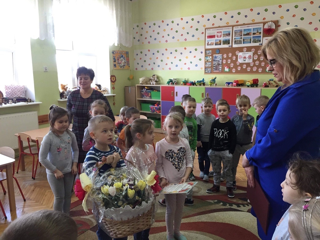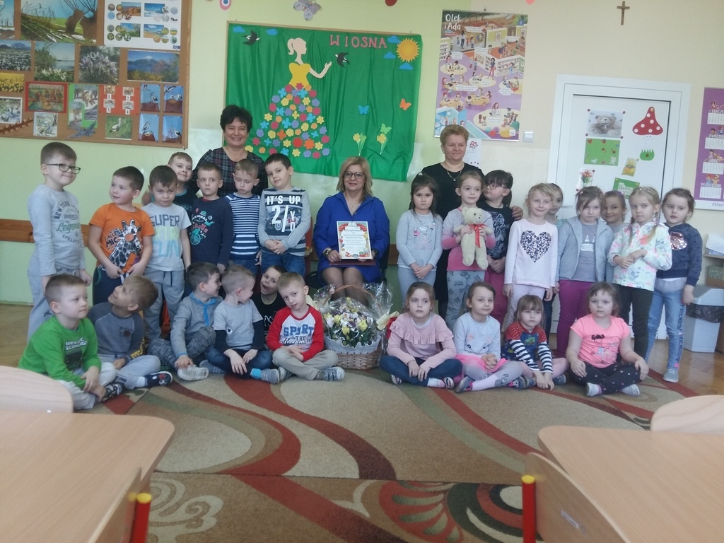W ramach realizacji projektu ,,Mały Miś w świecie wielkiej literatury"przedszkolaki z grupy VIII ,,Muchomorki" i XII ,,Stokrotki" wraz ze swoimi wychowawczyniami zaprosiły panią Dorotę Paczyńską, wiceburmistrz Iłży. Na powitanie dzieci zaśpiewały piosenkę ,,Czytaj z misiem" oraz opowiedziały o misiach, które odwiedzają ich w domach. Pani wiceburmistrz przeczytała opowiadanie A.Widzowskiej pt ,,Nauka pływania". Przedszkolaki uważnie słuchały utworu i odpowiadały na pytania związane z jego treścią. Wykazały się znajomością zwrotów grzecznościowych oraz wypowiadały się kolejno, co potrafią robić najlepiej. W podziękowaniu za wizytę dzieci przekazały pani wiceburmistrz dyplom oraz kosz wiosennych kwiatów z bibuły. Spotkanie przebiegło w miłej i serdecznej atmosferze. Jednym z celów projektu jest włączenie w życie przedszkola rodziców oraz przedstawicieli środowiska lokalnego.