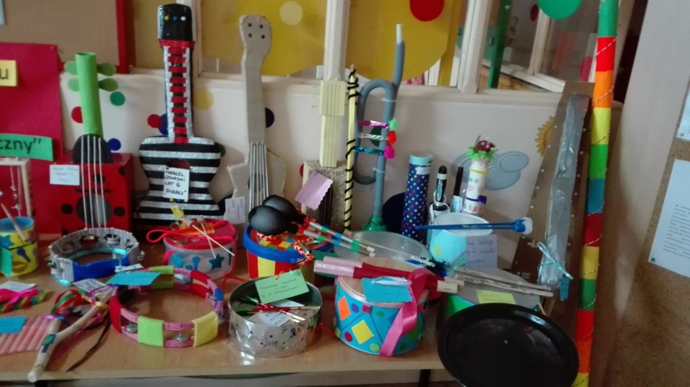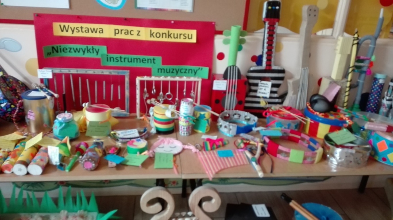 Konkurs pt. "Niezwykły instrument muzyczny" spotkał się z ogromnym zainteresowaniem. W konkursie wzięło udział aż 77 uczestników, którzy wykonali naprawdę niezwykłe instrumenty. Zgodnie z zasadami konkursu wiele z nich rzeczywiście spełnia funkcję instrumentu i wydaje dźwięk. W związku z powyższym wybór laureata konkursu okazał się niezykle trudny. Jury konkursu, na czele z panią dyrektor Marzeną Grudniewską ustaliło, że wszystkie prace otrzymają równorzędną nagrodę, gdyż nie sposób wybrać kilku najlepszych instrumentów wśród tylu wspaniałaych prac. Przedszkolaki, które wzięły udział w konkursie niebawem otrzymają nagrodę. Pragniemy serdecznie podziękować wszystkim uczestnikom, a przede wszystkim rodzicom za tak ogromne zaangażowanie we wspólną pracę z dzieckiem.