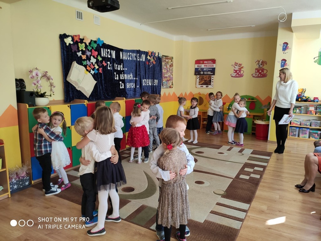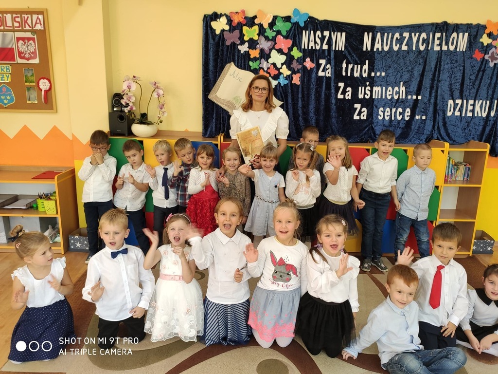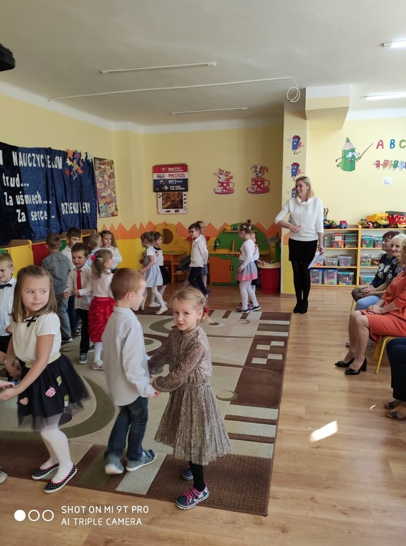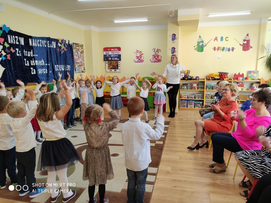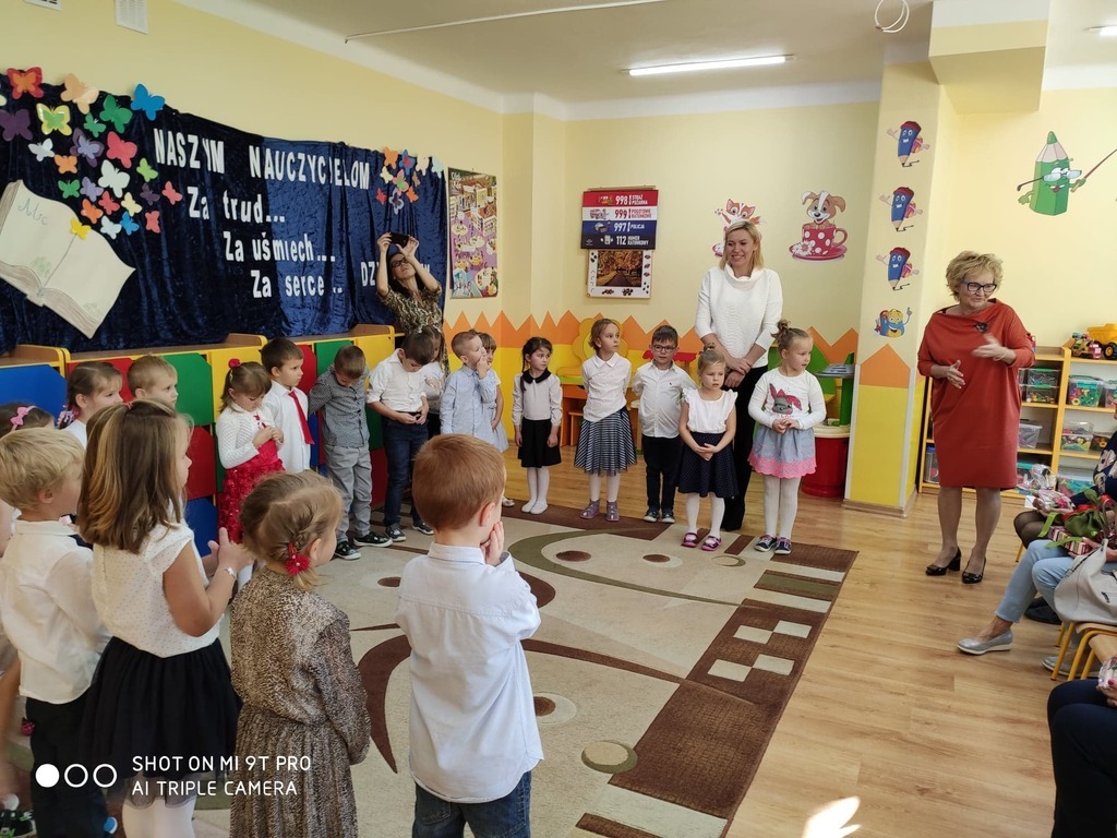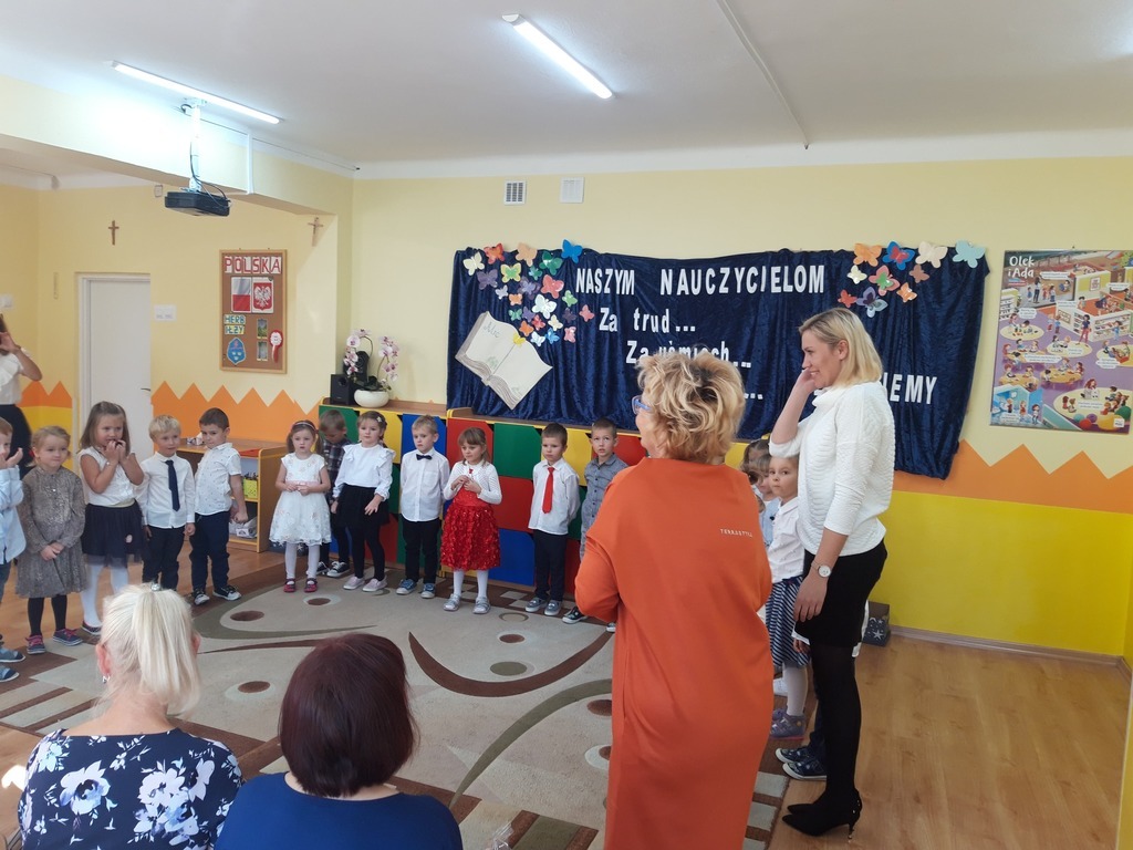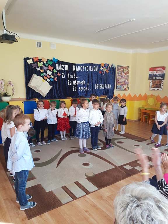 Dzień Edukacji Narodowej to wyjątkowe święto dla pracowników oświaty. W tym uroczystym dniu grupa „Pszczółki” wraz z Paniami przygotowała akademię, w której uczestniczyli zaproszeni goście. Swoją obecnością zaszczycił nas Pan Burmistrz Przemysław Burek, Pani Dyrektor, emerytowane nauczycielki oraz pracownicy przedszkola. Nasze przedszkolaki zaprezentowały się najlepiej jak umiały. Nie zabrakło wierszy, życzeń, piosenek, które w całości stworzyły piękne podziękowanie z codzienną troskę, oddanie, serdeczność oraz trud włożony w nauczanie i wychowanie. Zaproszeni goście świetnie się bawili. Za część artystyczną przedszkolaki zostały nagrodzone gromkimi brawami i słodkim upominkiem. Pani Danuta Kaźmierczyk w imieniu nauczycielek emerytek podziękowała Pani Dyrektor za zaproszenie oraz Paniom Kamili Kuterze i Luizie Stępień za przygotowanie dzieci do pięknej akademii. Na zakończenie dzieci wręczyły mały upominek zaproszonym gościom. Ten dzień upłynął w miłej i serdecznej atmosferze a wrażenia na długo pozostaną w naszej pamięci.