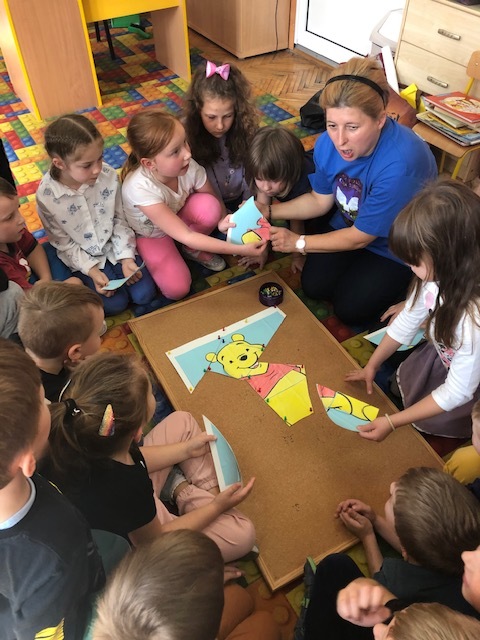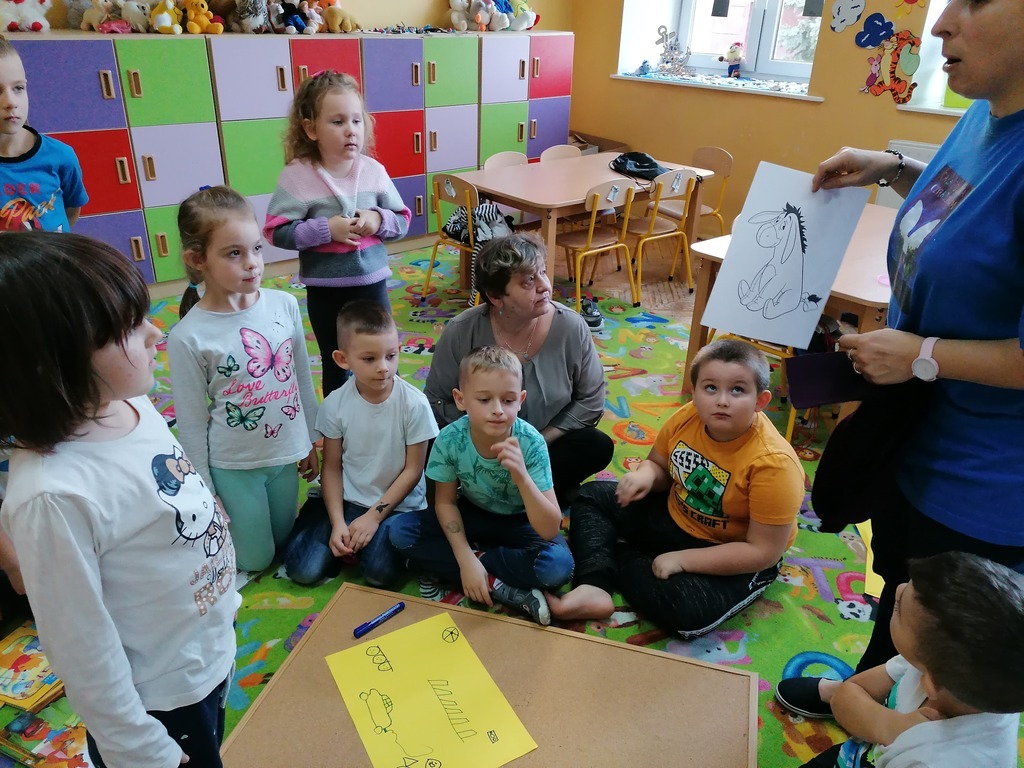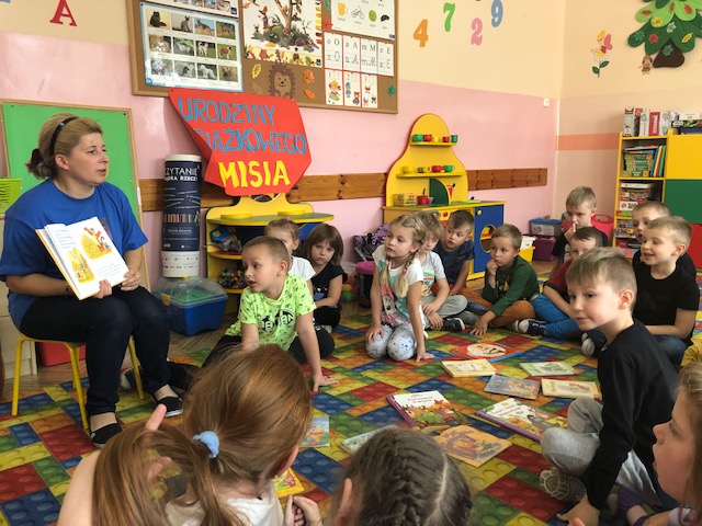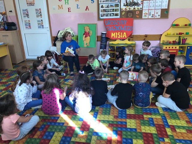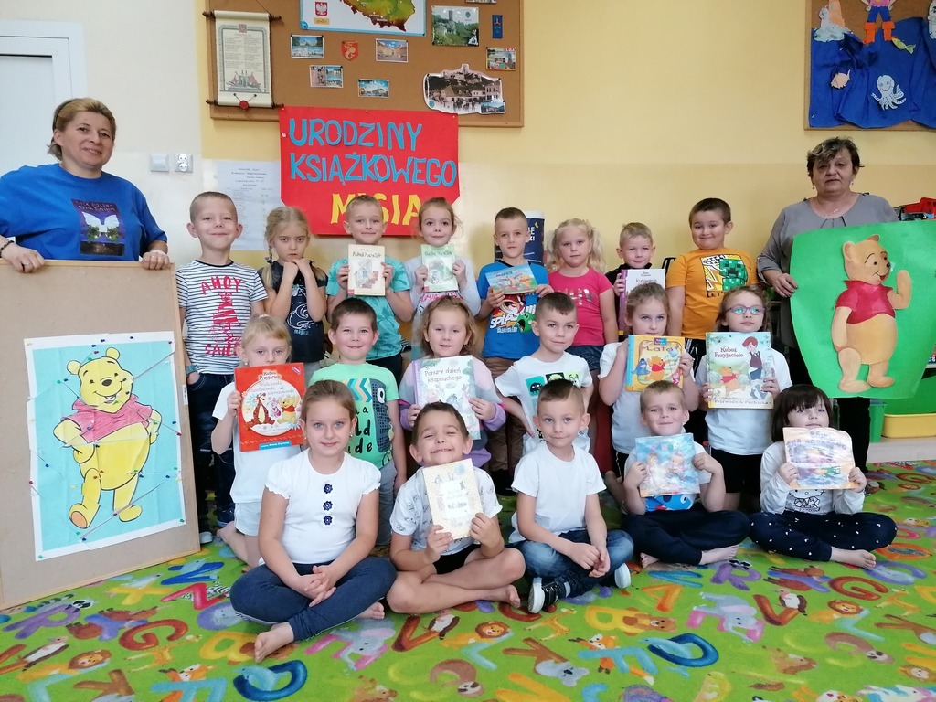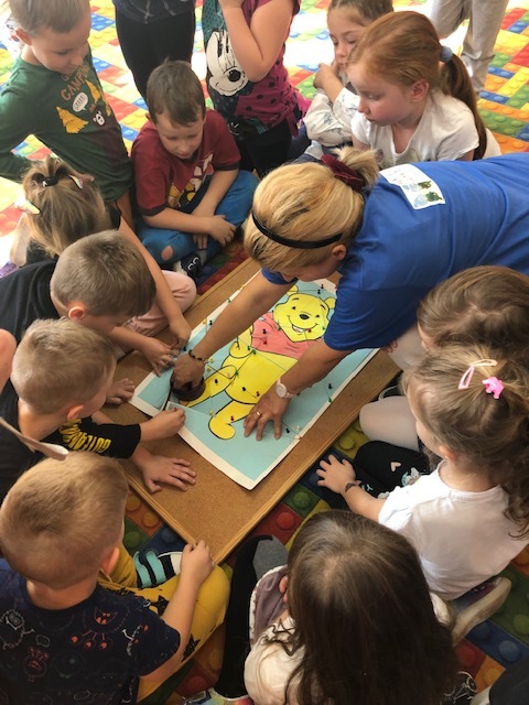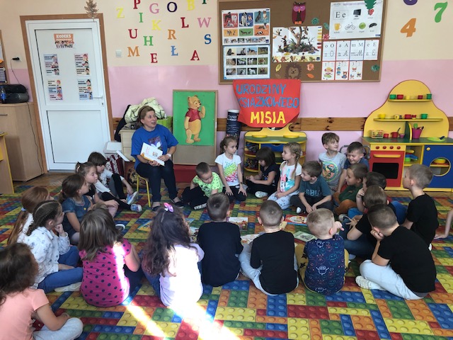 Z okazji urodzin Kubusia Puchatka nasze Przedszkole odwiedziły Panie z Miejsko-Gminnej Biblioteki w Iłży, które przygotowały mnóstwo atrakcji dla naszych przedszkolaków. Na początku spotkania Pani Małgosia opowiedziała dzieciom o książce „ Kubuś Puchatek”. Dzieci dowiedziały się, że przygody zabawnego misia o małym rozumku zostały wydane w 1926 roku w Londynie a autorem jest Alan Aleksander Milne. Przedszkolaki były zaskoczone, że Kubuś ma już 93 lata. Dzieci z zaciekawieniem wysłuchały opowiadania „Puchatkowa sterta liści” oraz z chęcią odpowiadały na zadawane pytania. Wiele radości sprawiło przedszkolakom rozwiązywanie Kubusiowych zagadek, układanie puzzli z wizerunkiem Kubusia oraz szukanie ogonka dla zapominalskiego Kłapouchego. Na zakończenie dzieci dostały słodkie „co nieco” od jubilata. Bardzo dziękujemy Paniom za przygotowanie tylu wspaniałych atrakcji. To był dzień pełen wrażeń.