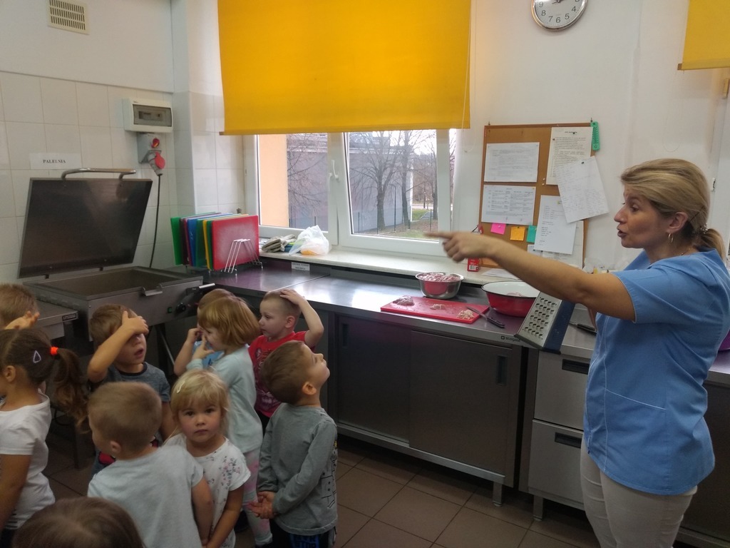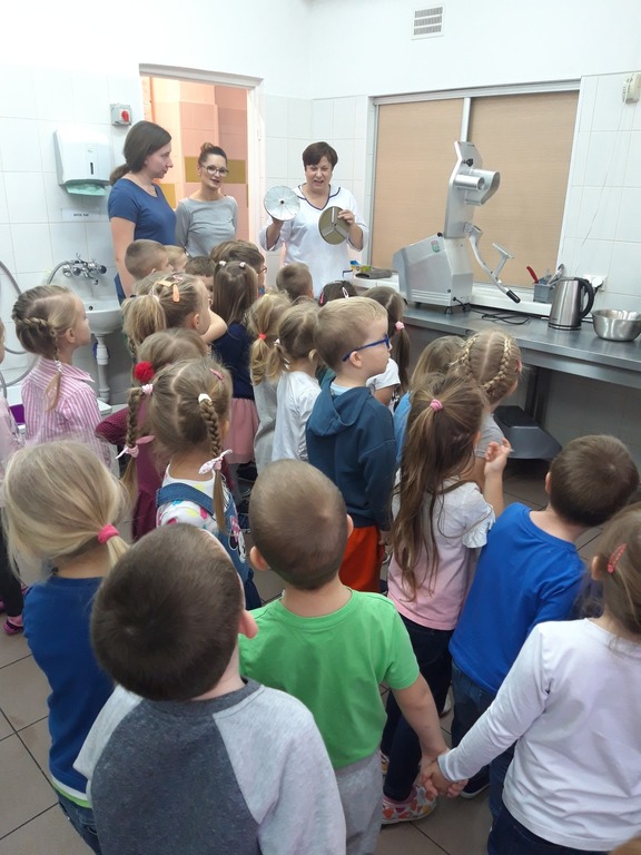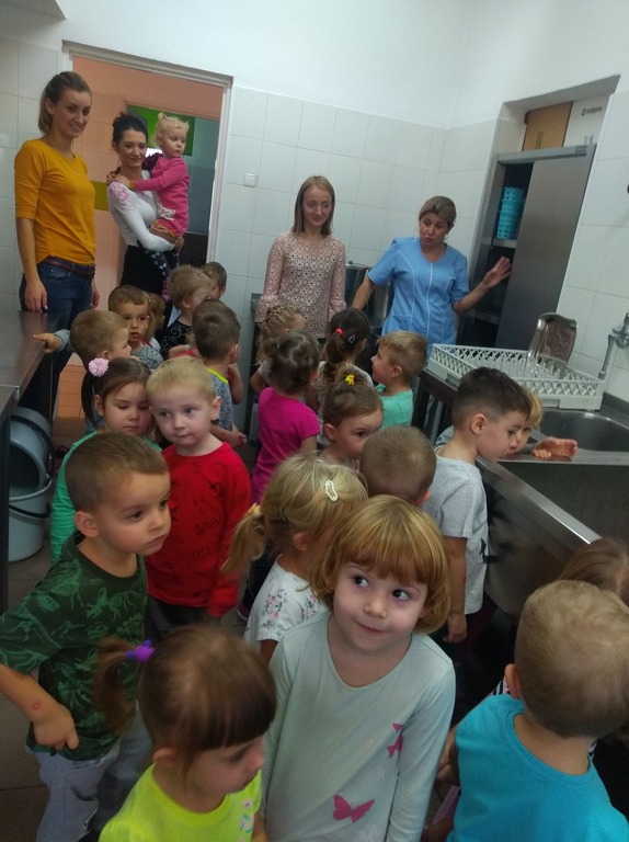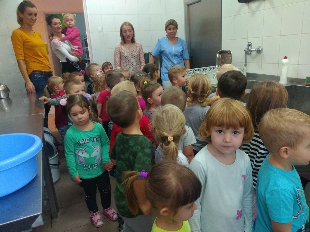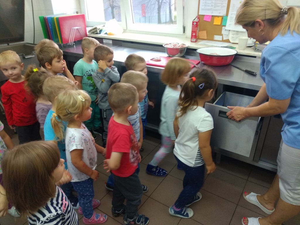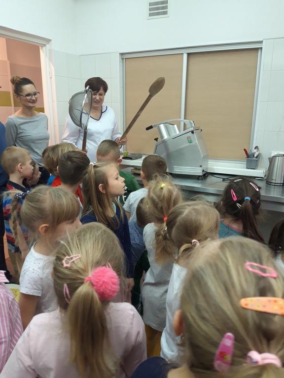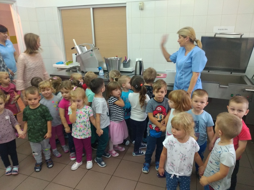 Dzieci z grupy „Jagódki” , „Krasnoludki”, „Biedronki” i „Pszczółki” w dniu 13 listopada 2019 roku odwiedziły przedszkolną kuchnię. Przedszkolaki zostały bardzo miło przywitane przez panie kucharki i oprowadzone po kuchni. Panie zapoznały dzieci ze sprzętami, których używa się do przygotowania smacznych posiłków. Dużą radością dla przedszkolaków było oglądanie ogromnych garnków, łyżek oraz innych akcesoriów niezbędnych w pracy kucharza. Dzieci z niezwykłym zaciekawieniem zwiedzały kuchnię zadając wiele pytań. Na zakończenie panie kucharki poczęstowały przedszkolaków zdrową przekąską.