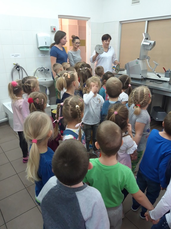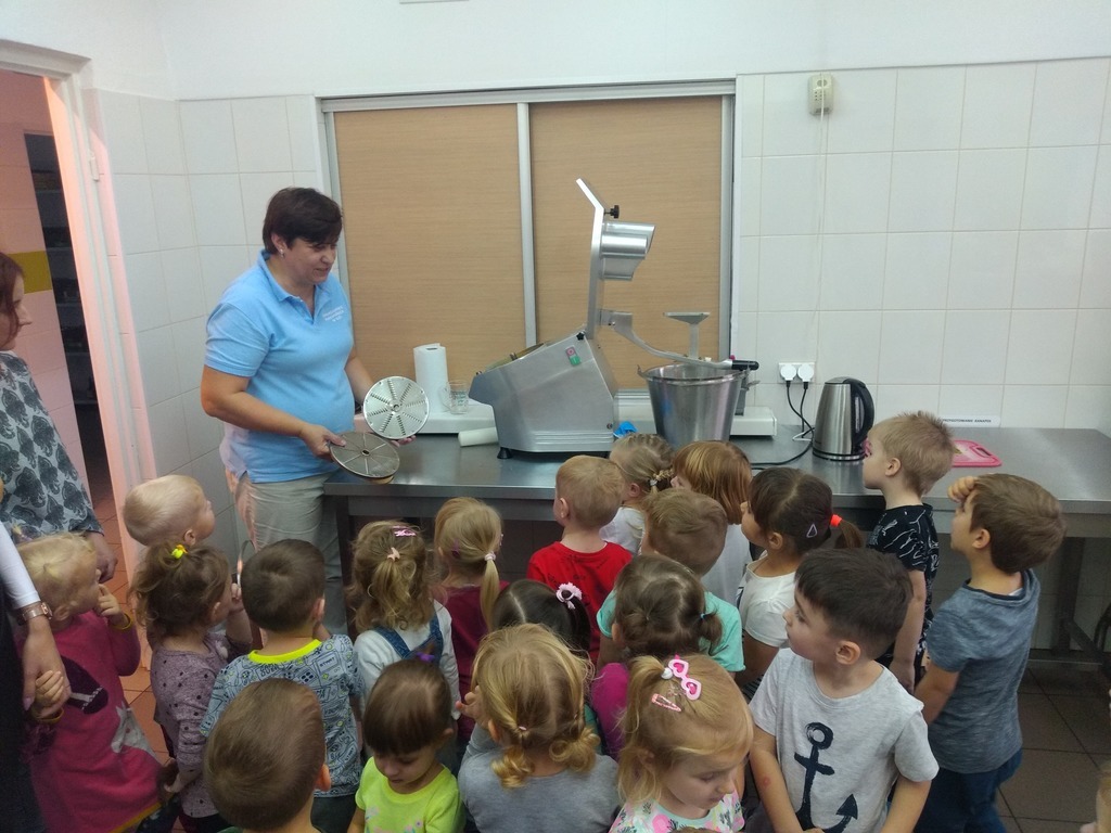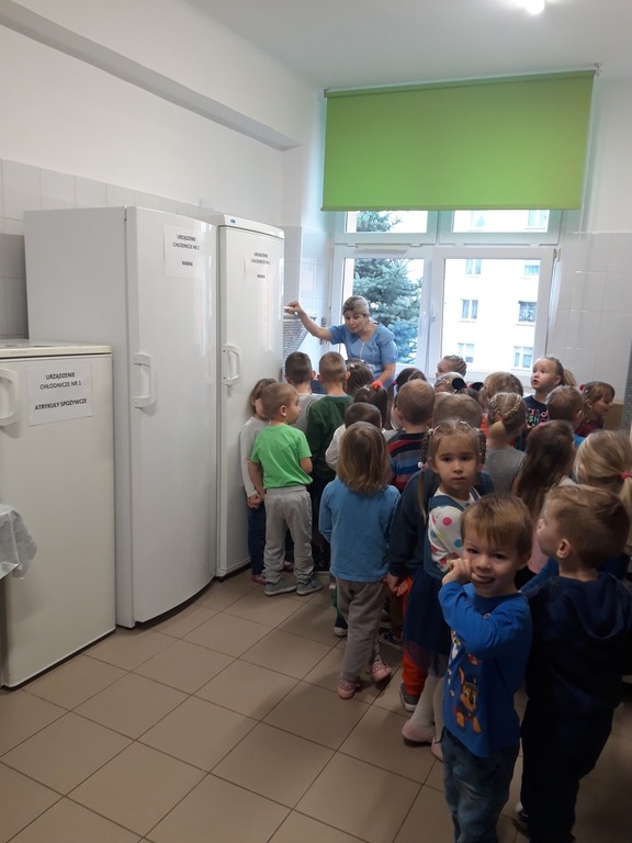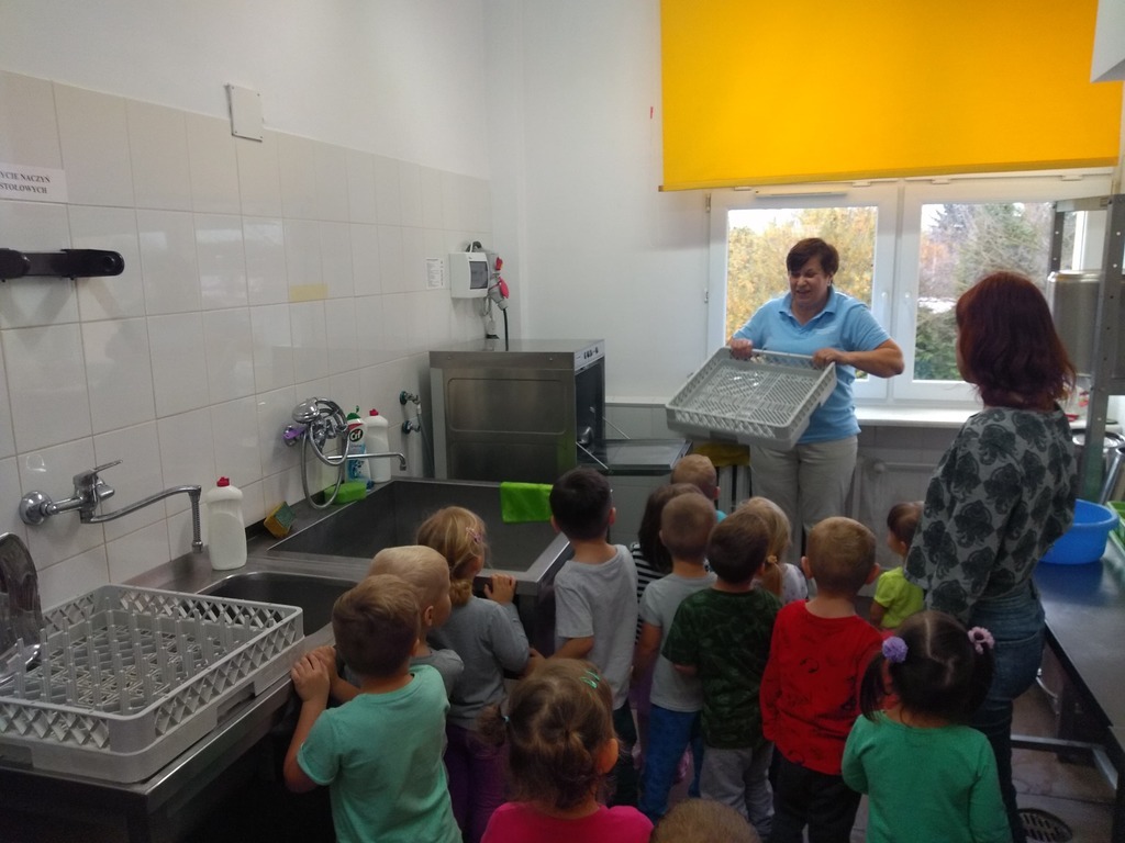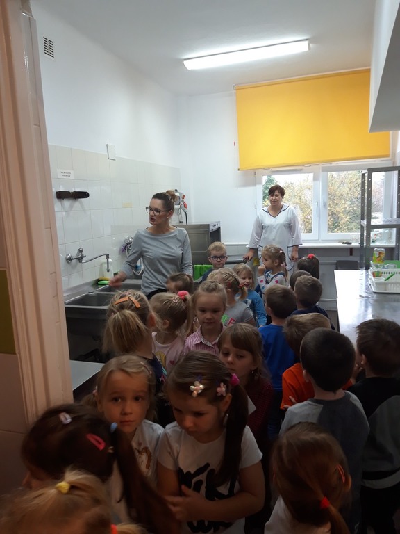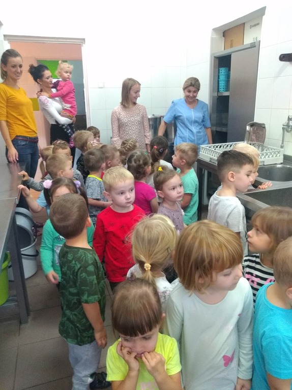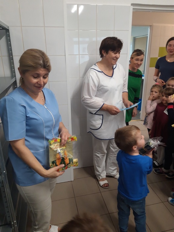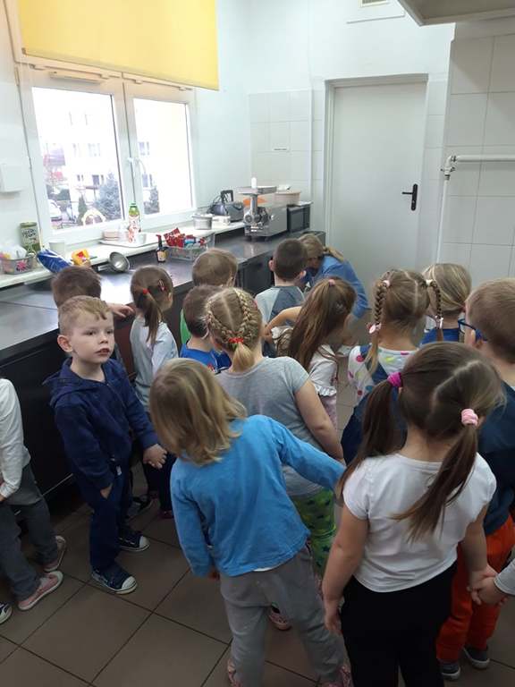 Dzieci z grupy „Jagódki” , „Krasnoludki”, „Biedronki” i „Pszczółki” w dniu 13 listopada 2019 roku odwiedziły przedszkolną kuchnię. Przedszkolaki zostały bardzo miło przywitane przez panie kucharki i oprowadzone po kuchni. Panie zapoznały dzieci ze sprzętami, których używa się do przygotowania smacznych posiłków. Dużą radością dla przedszkolaków było oglądanie ogromnych garnków, łyżek oraz innych akcesoriów niezbędnych w pracy kucharza. Dzieci z niezwykłym zaciekawieniem zwiedzały kuchnię zadając wiele pytań. Na zakończenie panie kucharki poczęstowały przedszkolaków zdrową przekąską.