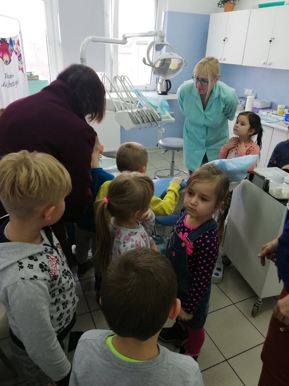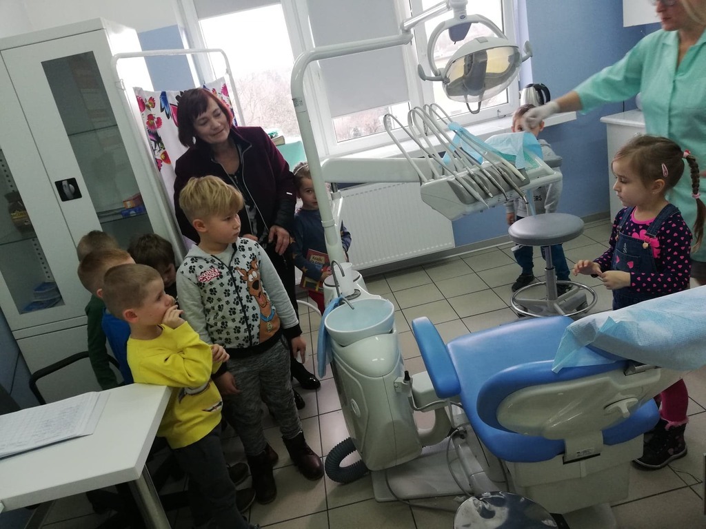 W dniu 30 XI 2019 grupa „Stokrotki” wraz ze swoją panią wybrała się do gabinetu stomatologicznego, aby dowiedzieć się jak należy dbać o higienę jamy ustnej. Dzieci dowiedziały się jak należy i ile razy dziennie prawidłowo szczotkować zęby. Przedszkolaki obiecały, że będą systematycznie badać ząbki u stomatologa.