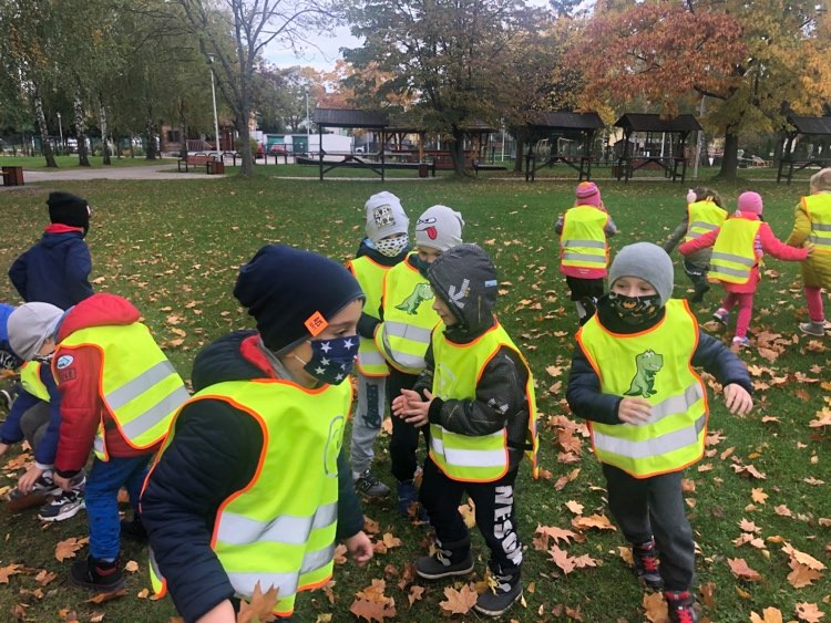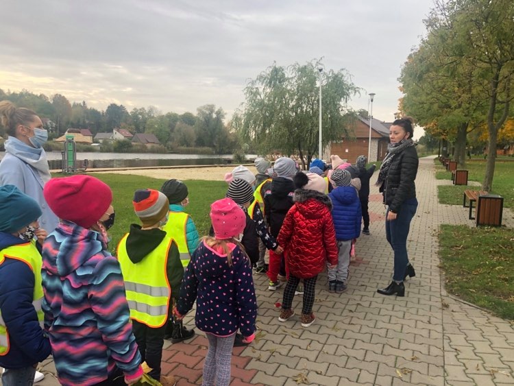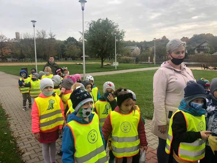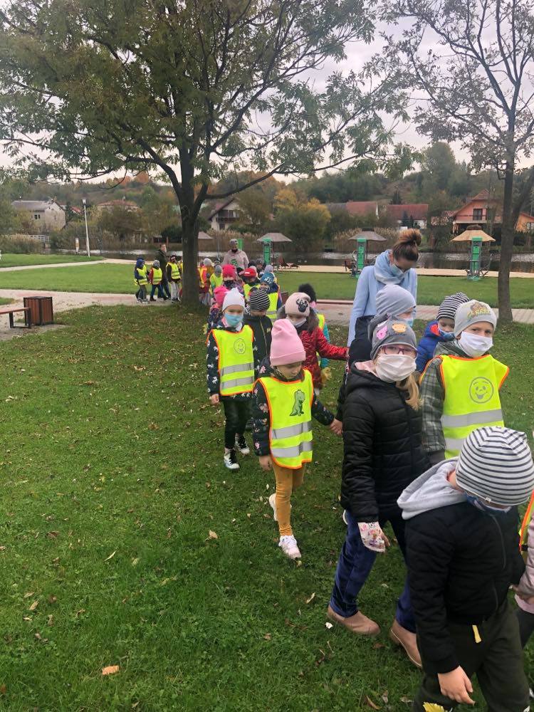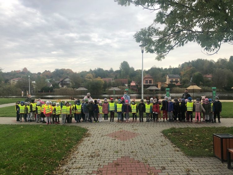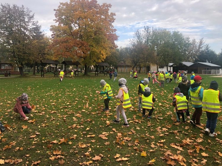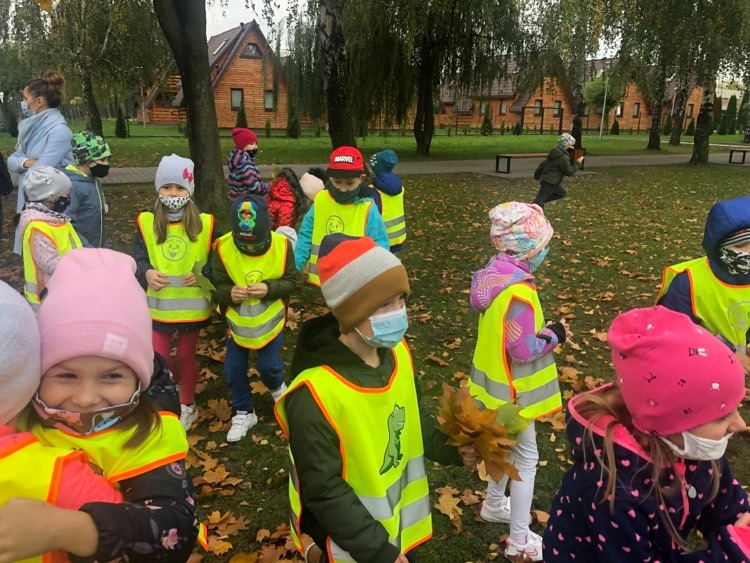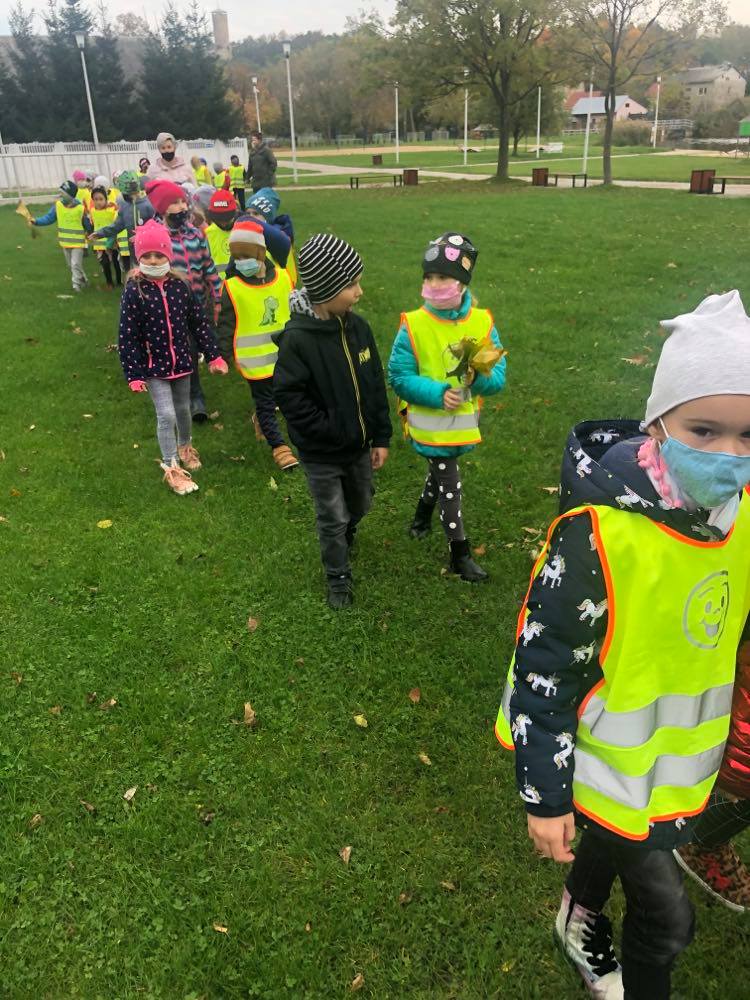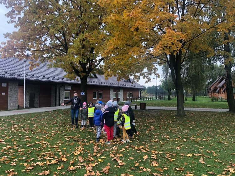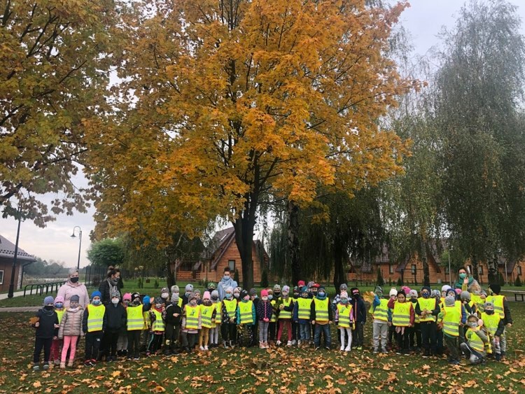 Korzystając z pięknej pogody starszaki z grup „Słoneczka”, „Piraci” i „Leśne Duszki” wraz ze swoimi paniami wybrały się na jesienny spacer. Podczas spaceru dzieci podziwiały piękno naszej okolicy i obserwowały otaczającą przyrodę. Na „Przystani” gdzie znajduje się wiele gatunków drzew dzieci miały okazję przyjrzeć się ich liściom, porównać je pod względem kształtu, wielkości i koloru. Najwięcej radości sprawiła przedszkolakom swobodna zabawa wśród miękkich i pachnących liści oraz zbieranie „jesiennych skarbów”.