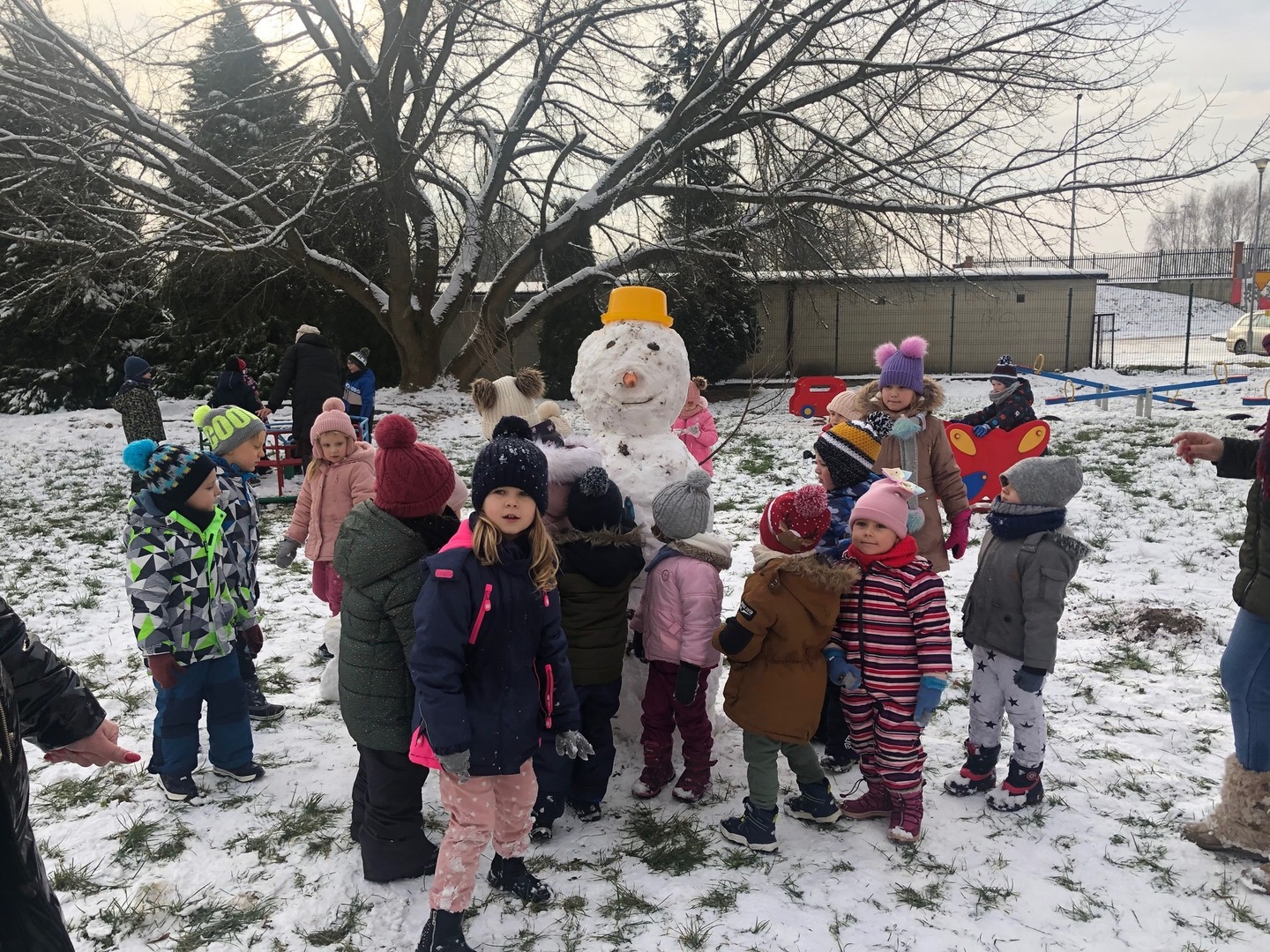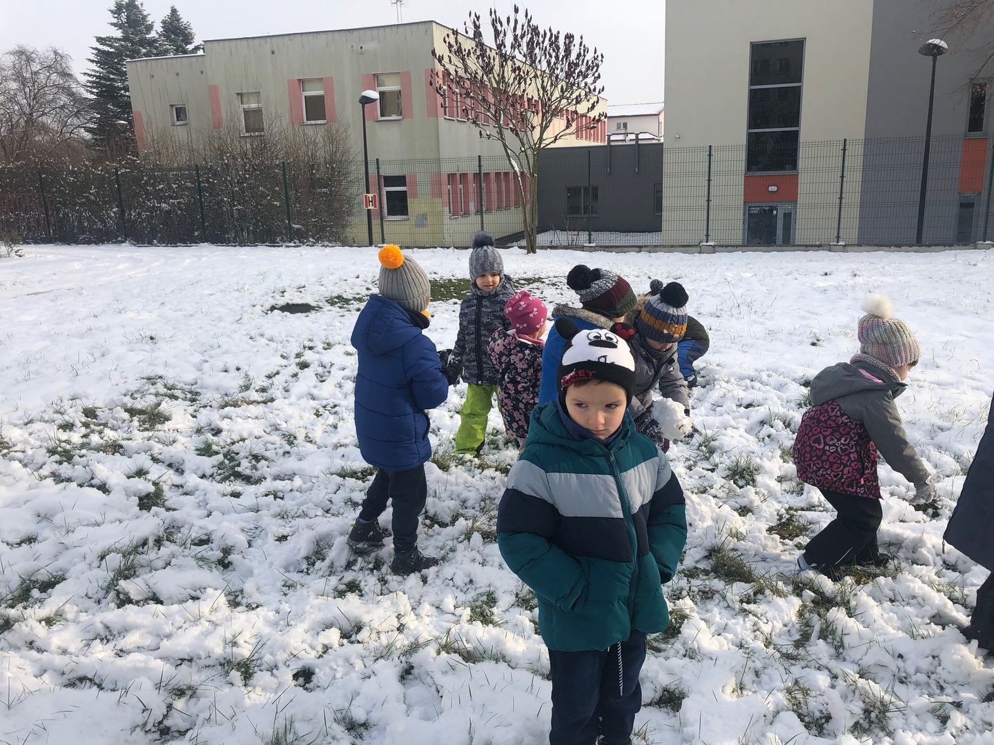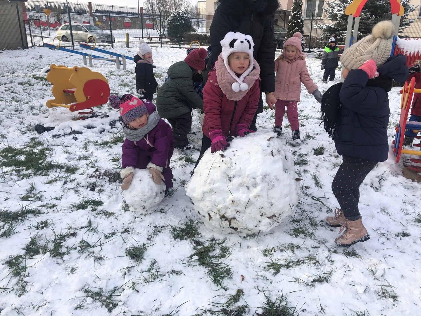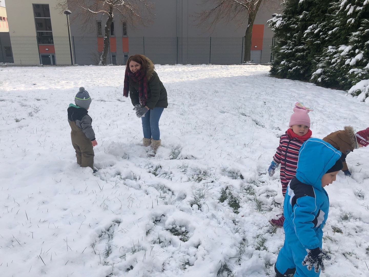 Korzystając z pierwszych uroków zimy, nasze przedszkolaki wybrały się do ogrodu przedszkolnego, aby pobawic sie na śniegu. Dzieci z wielką radością ulepiły bałwankową rodzinę, rzucały sie śnieżkami i podziwiały uroki pięknej zimy. Z czerwonymi noskami i z uśmiechem na buzi wróciły do przedszkola na ciepły posiłek.