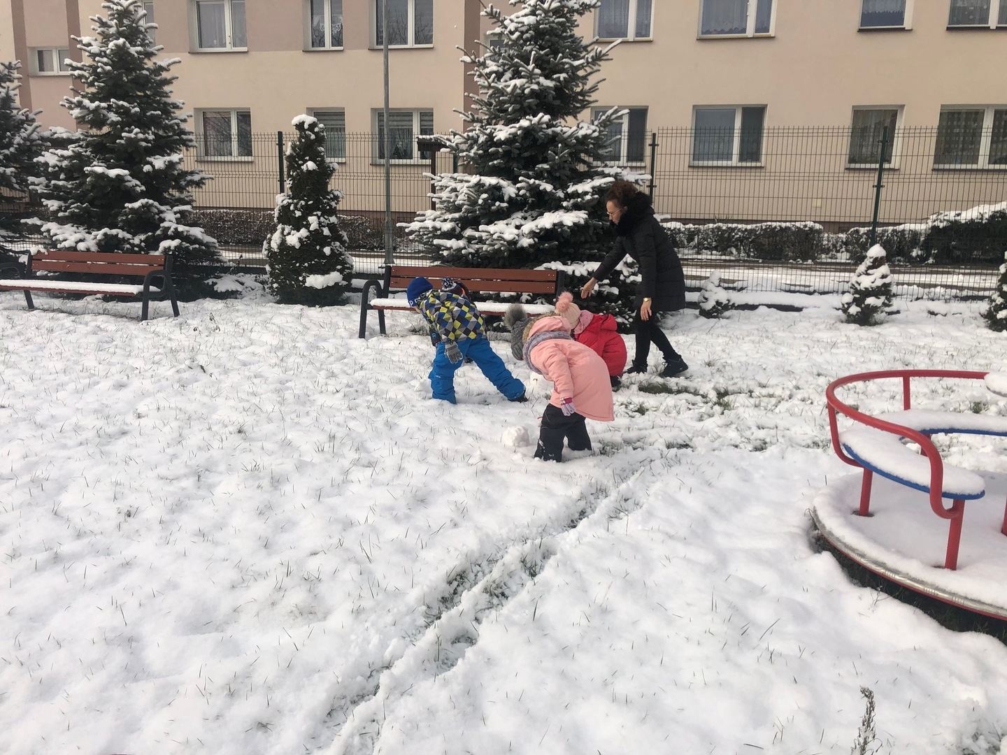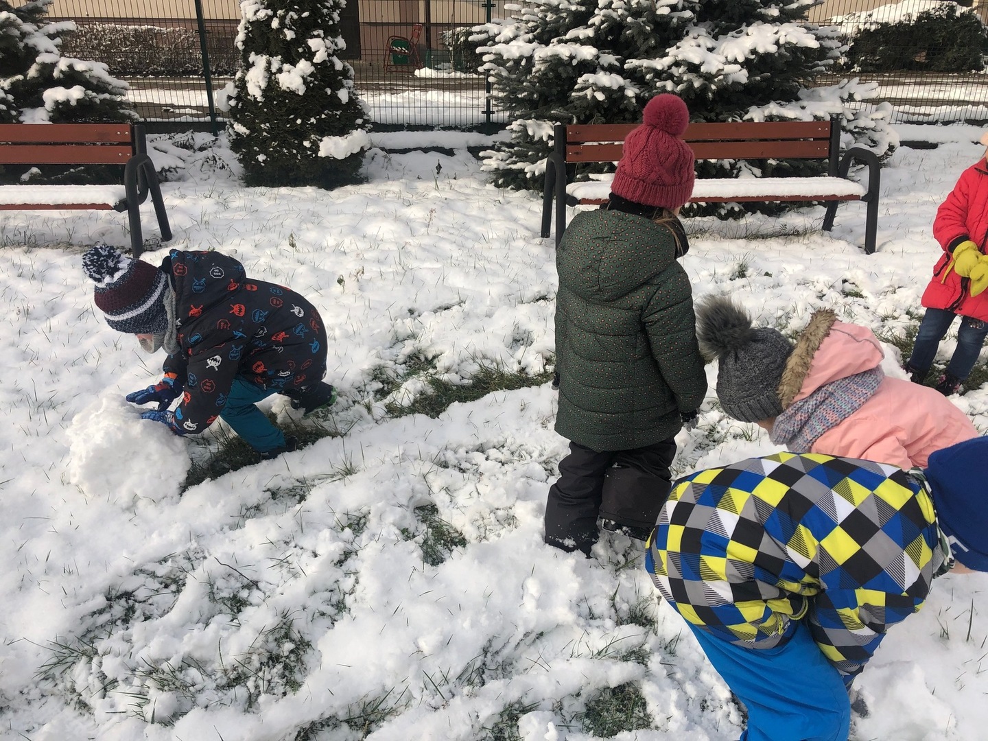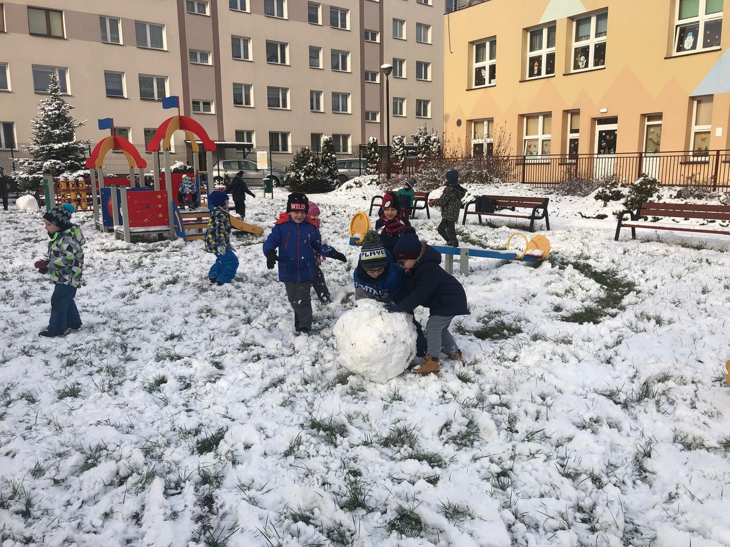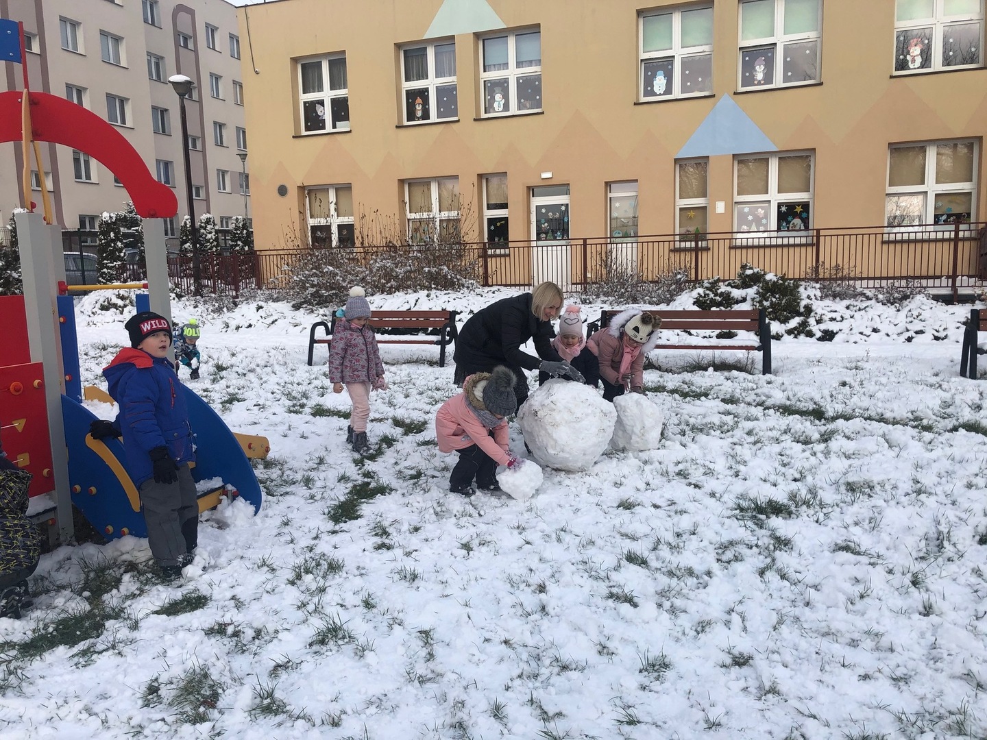 Korzystając z pierwszych uroków zimy, nasze przedszkolaki wybrały się do ogrodu przedszkolnego, aby pobawic sie na śniegu. Dzieci z wielką radością ulepiły bałwankową rodzinę, rzucały sie śnieżkami i podziwiały uroki pięknej zimy. Z czerwonymi noskami i z uśmiechem na buzi wróciły do przedszkola na ciepły posiłek.