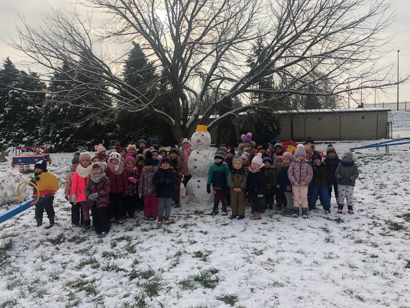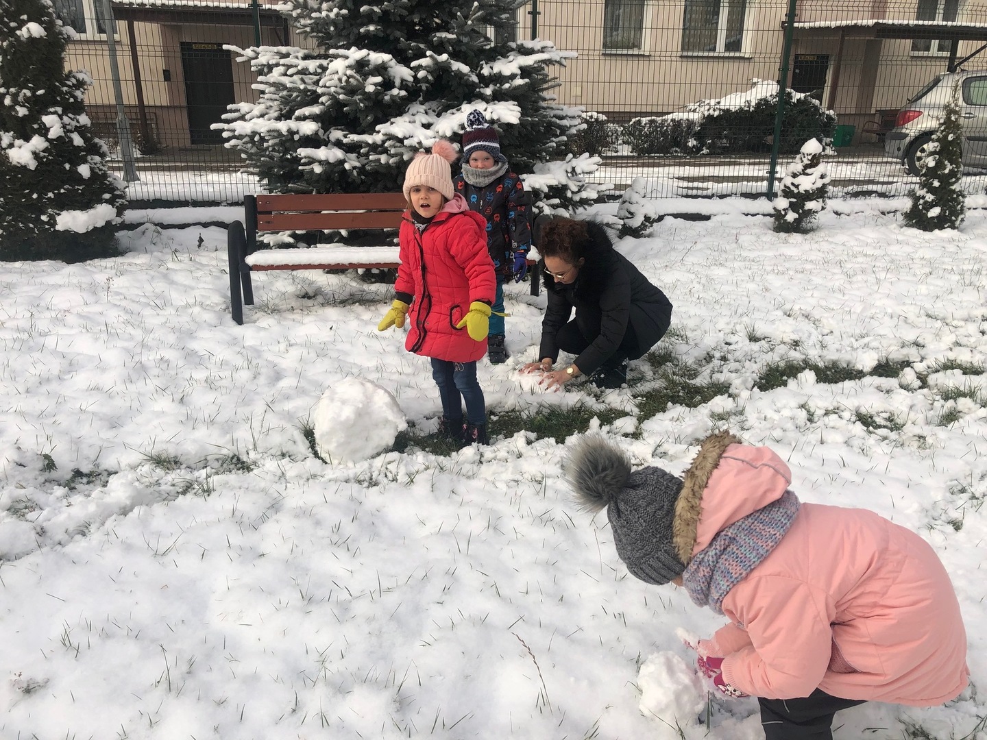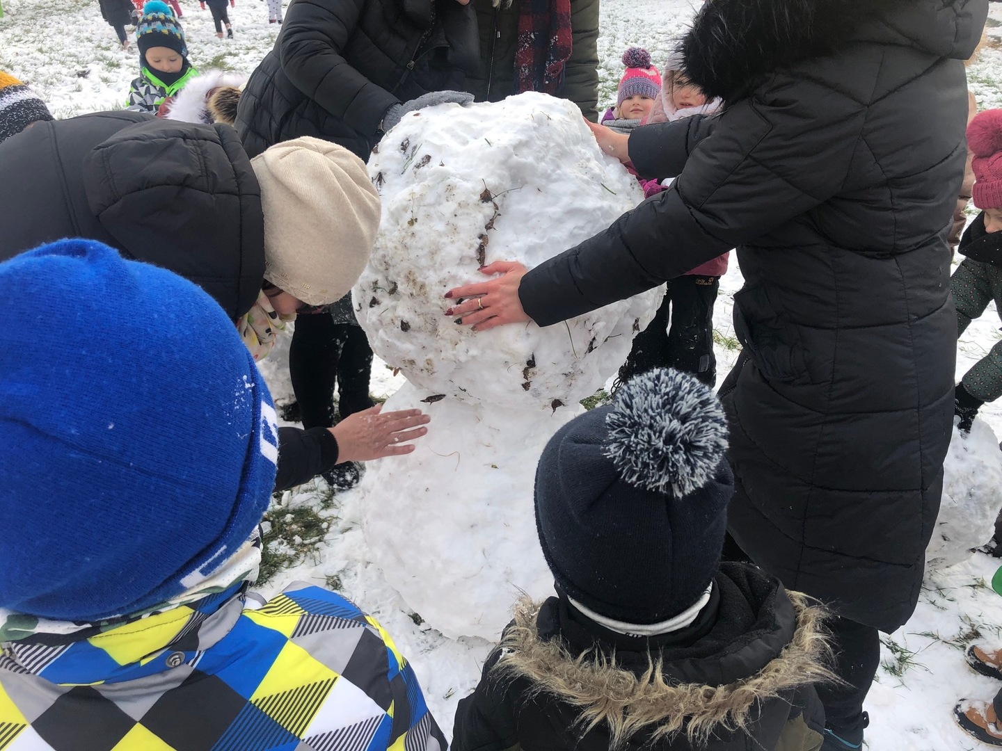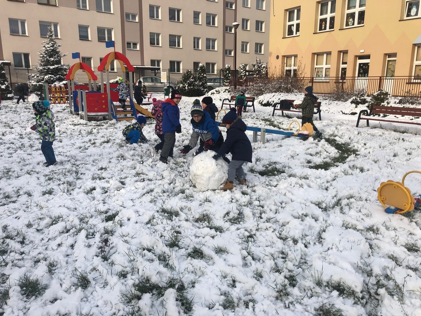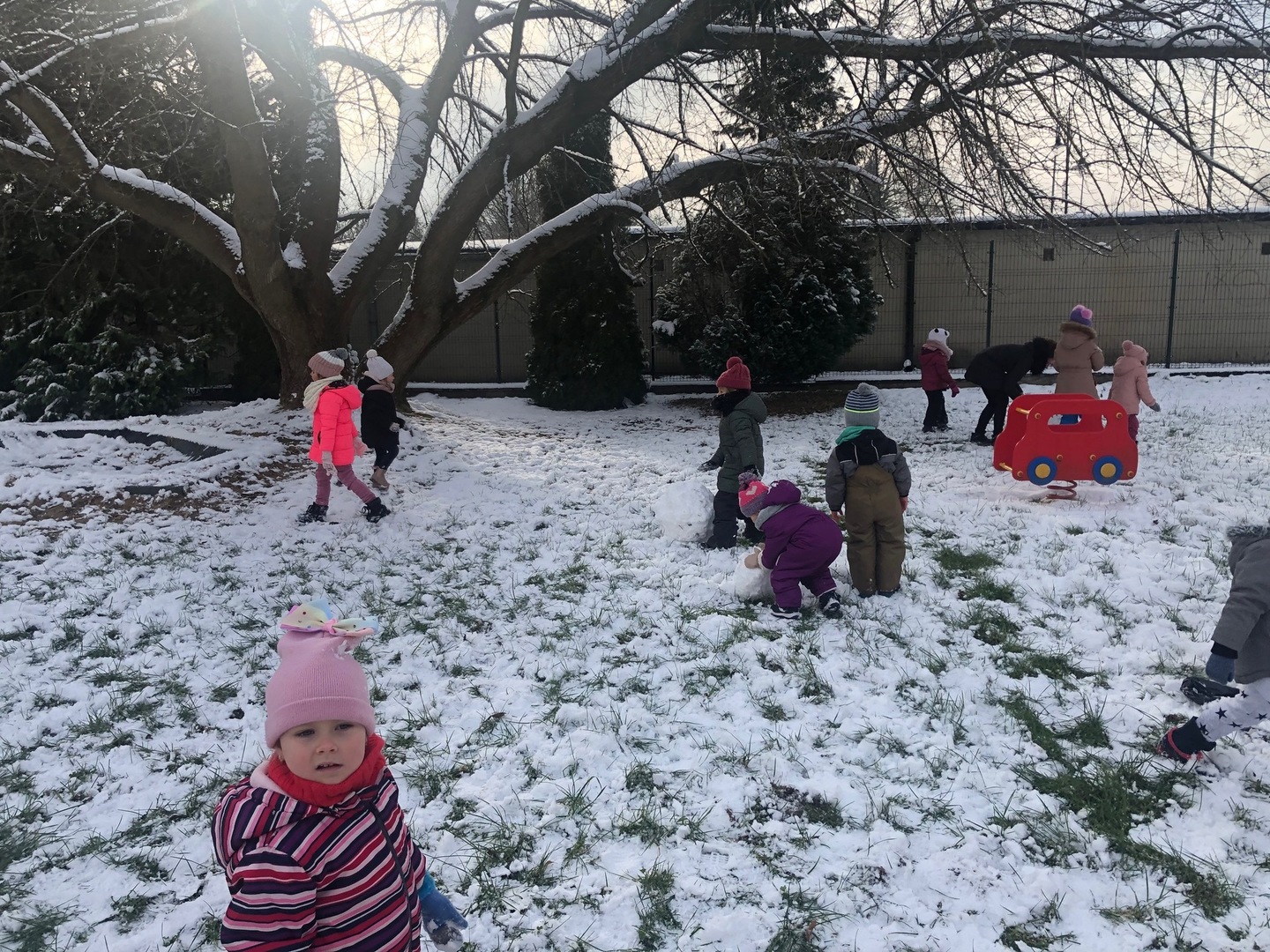 Korzystając z pierwszych uroków zimy, nasze przedszkolaki wybrały się do ogrodu przedszkolnego, aby pobawic sie na śniegu. Dzieci z wielką radością ulepiły bałwankową rodzinę, rzucały sie śnieżkami i podziwiały uroki pięknej zimy. Z czerwonymi noskami i z uśmiechem na buzi wróciły do przedszkola na ciepły posiłek.