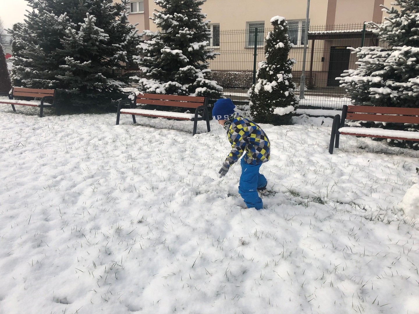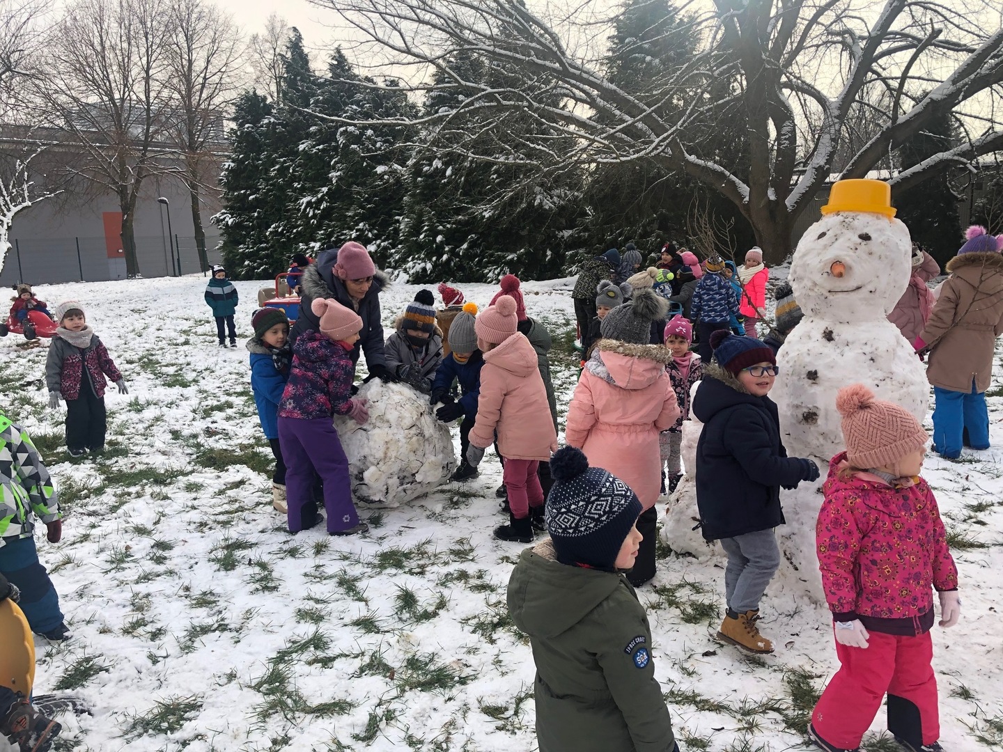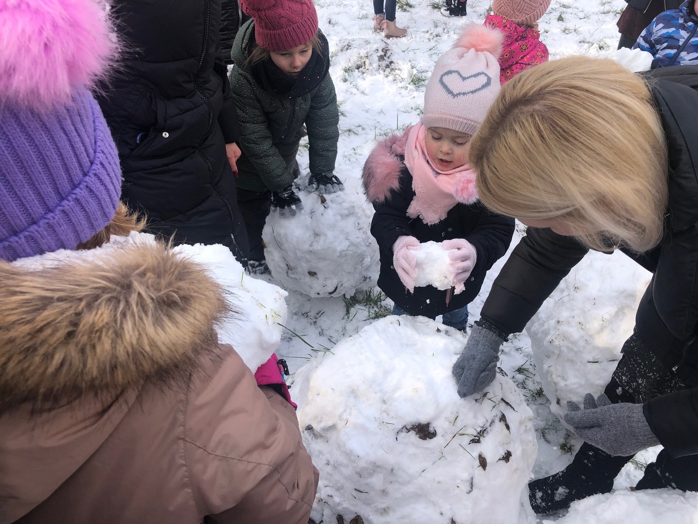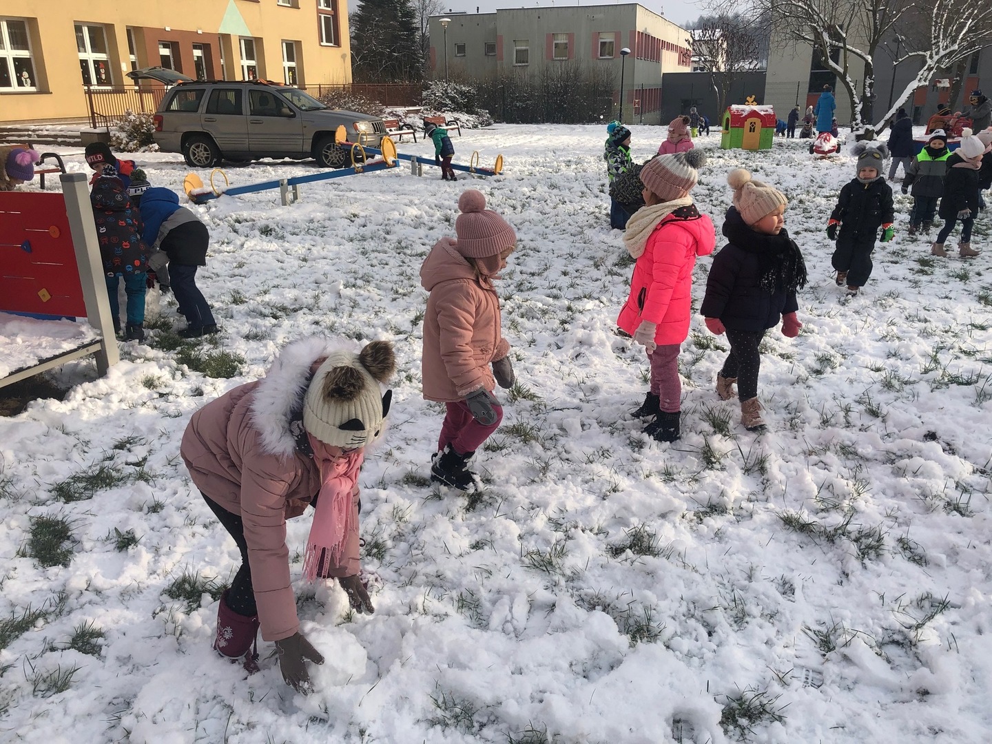 Korzystając z pierwszych uroków zimy, nasze przedszkolaki wybrały się do ogrodu przedszkolnego, aby pobawic sie na śniegu. Dzieci z wielką radością ulepiły bałwankową rodzinę, rzucały sie śnieżkami i podziwiały uroki pięknej zimy. Z czerwonymi noskami i z uśmiechem na buzi wróciły do przedszkola na ciepły posiłek.