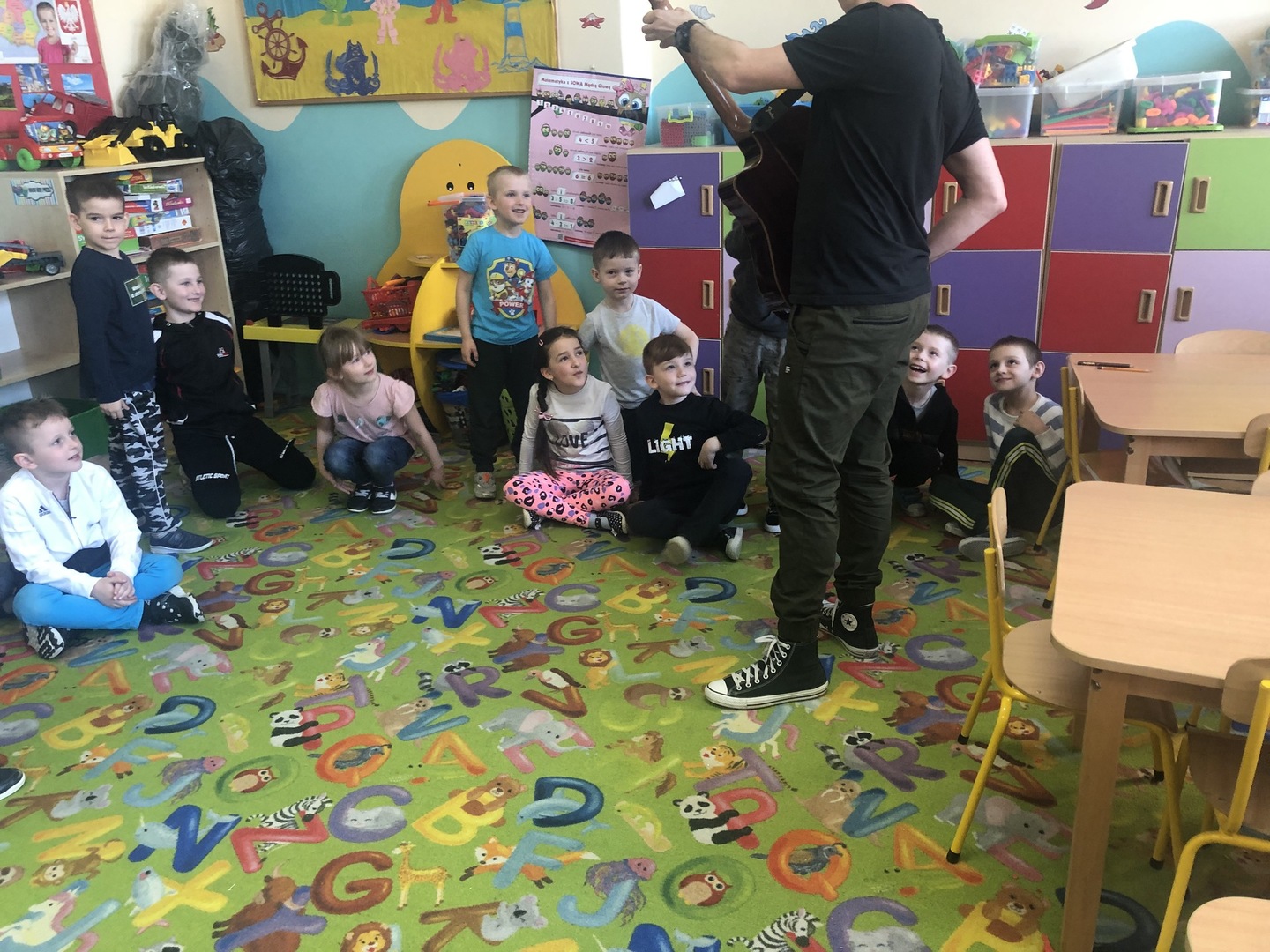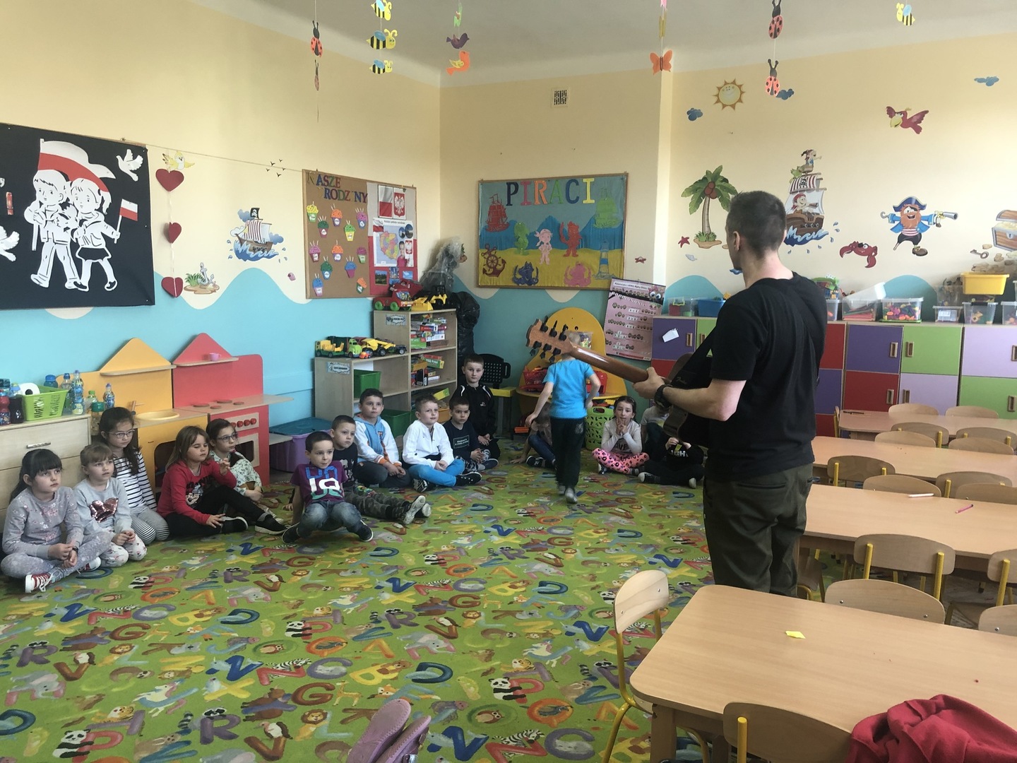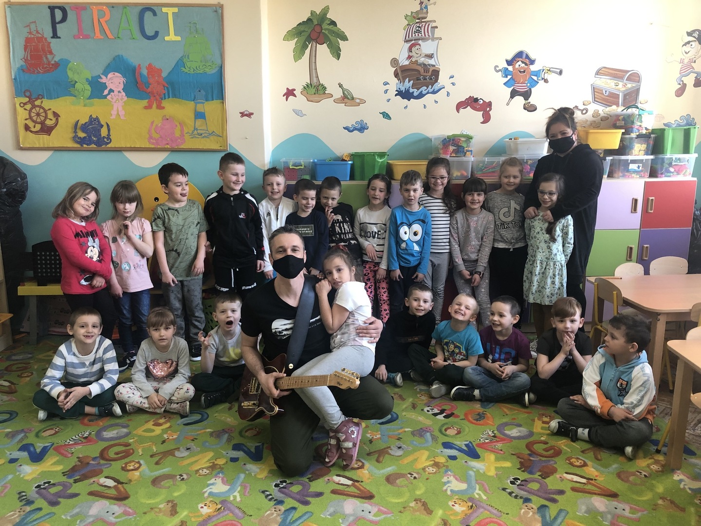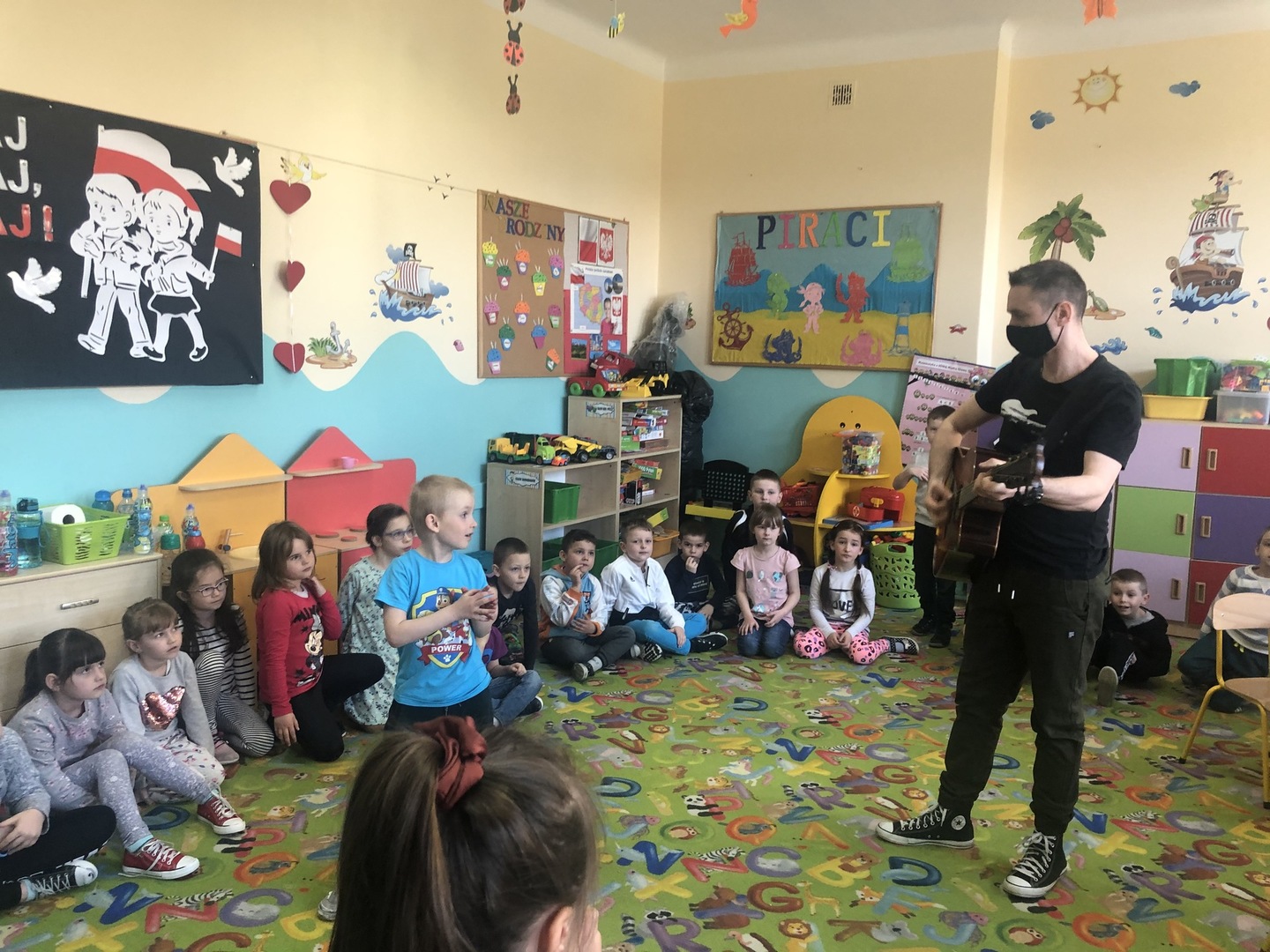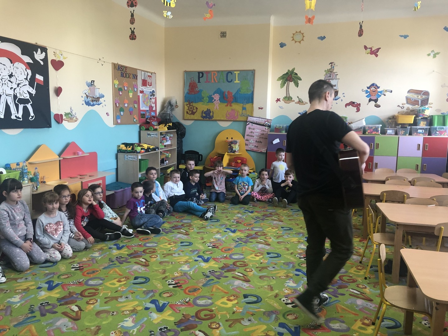 W ramach realizowanego tematu tygodniowego „W świecie muzyki”, grupę „Piraci” odwiedził tata Matyldy Pan Dominik Kot, który poprowadził zajęcia muzyczne. Dzieci dowiedziały się czym różni się gitara klasyczna od elektrycznej. Z zaciekawieniem słuchały informacji na temat instrumentów muzycznych oraz gry na gitarze. Najwięcej radości sprawiła przedszkolakom możliwość dotknięcia i uderzenia w struny instrumentu. W czasie spotkania dzieci miały okazję do wspólnego muzykowania. Hitem okazały się zagrane i zaśpiewane wspólnie z dziećmi piosenki, które dzieci nucą na co dzień w przedszkolu. Serdecznie dziękujemy Panu Dominikowi za poświęcony nam czas. To była ekscytująca i magiczna wycieczka po krainie muzyki. Bardzo dziękujemy za kontakt z żywą muzyką i zapoznanie dzieci z instrumentami.