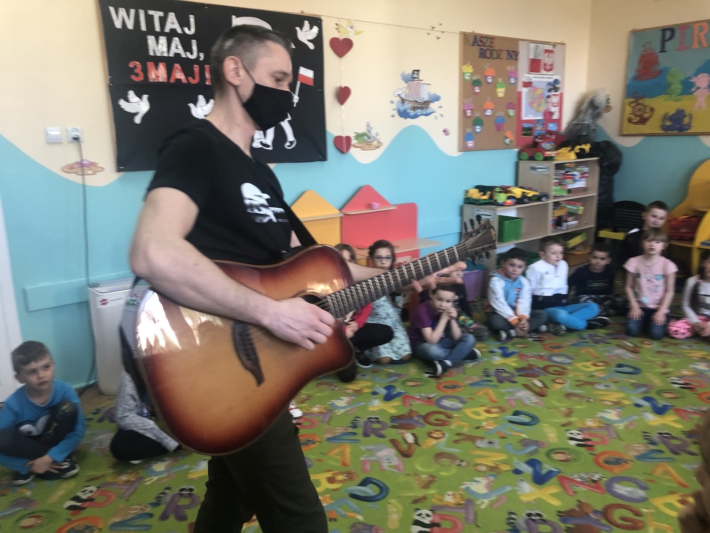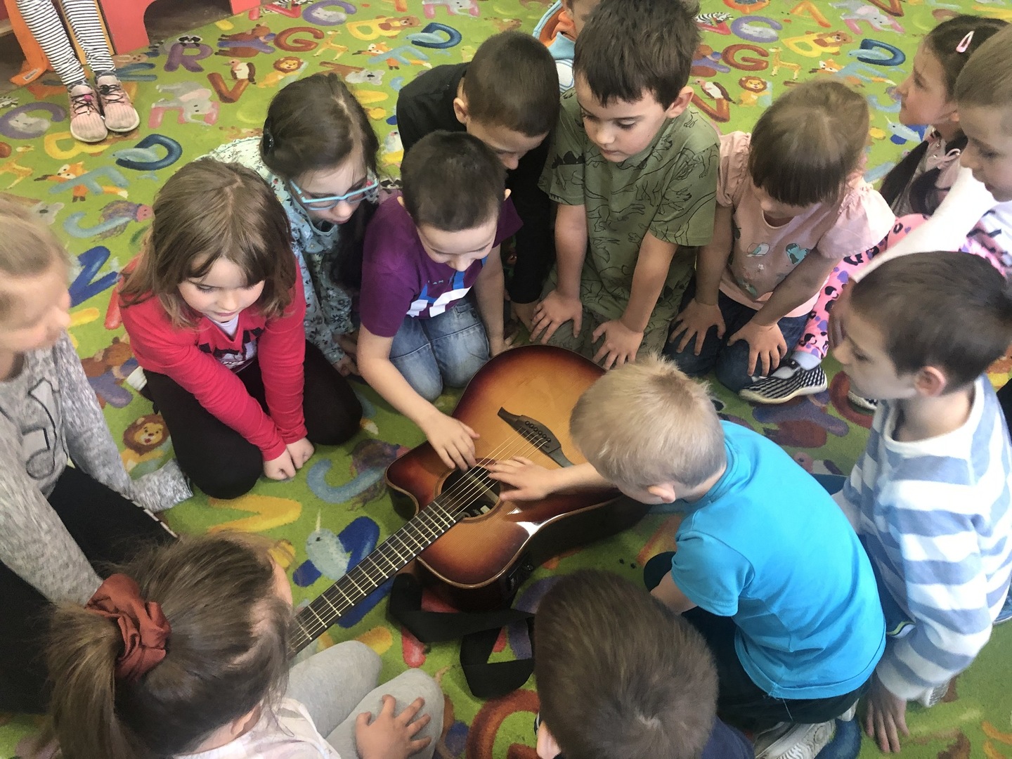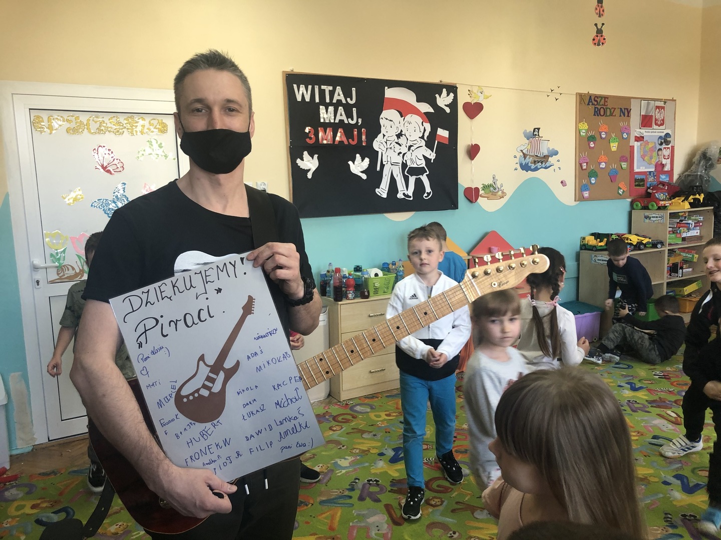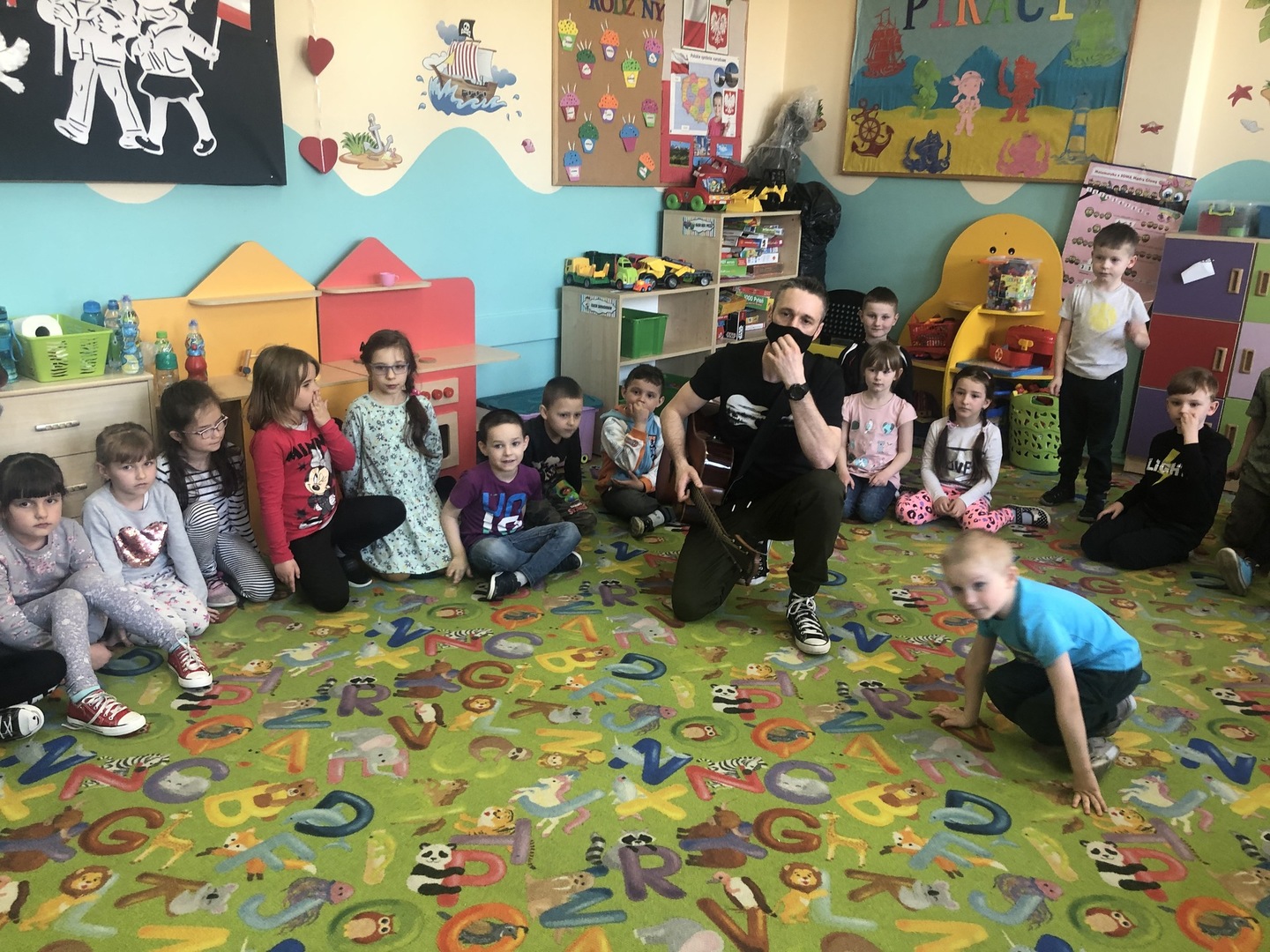 W ramach realizowanego tematu tygodniowego „W świecie muzyki”, grupę „Piraci” odwiedził tata Matyldy Pan Dominik Kot, który poprowadził zajęcia muzyczne. Dzieci dowiedziały się czym różni się gitara klasyczna od elektrycznej. Z zaciekawieniem słuchały informacji na temat instrumentów muzycznych oraz gry na gitarze. Najwięcej radości sprawiła przedszkolakom możliwość dotknięcia i uderzenia w struny instrumentu. W czasie spotkania dzieci miały okazję do wspólnego muzykowania. Hitem okazały się zagrane i zaśpiewane wspólnie z dziećmi piosenki, które dzieci nucą na co dzień w przedszkolu. Serdecznie dziękujemy Panu Dominikowi za poświęcony nam czas. To była ekscytująca i magiczna wycieczka po krainie muzyki. Bardzo dziękujemy za kontakt z żywą muzyką i zapoznanie dzieci z instrumentami.