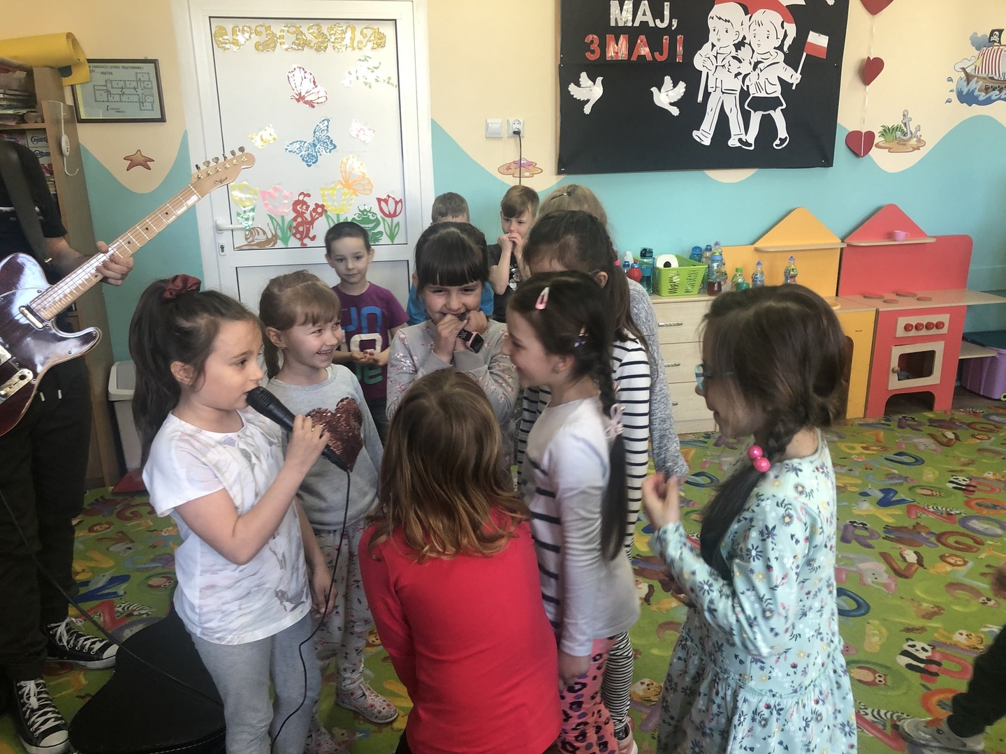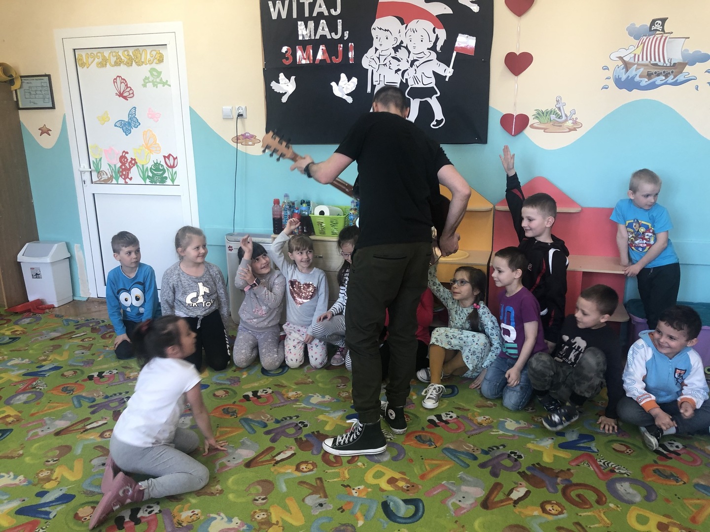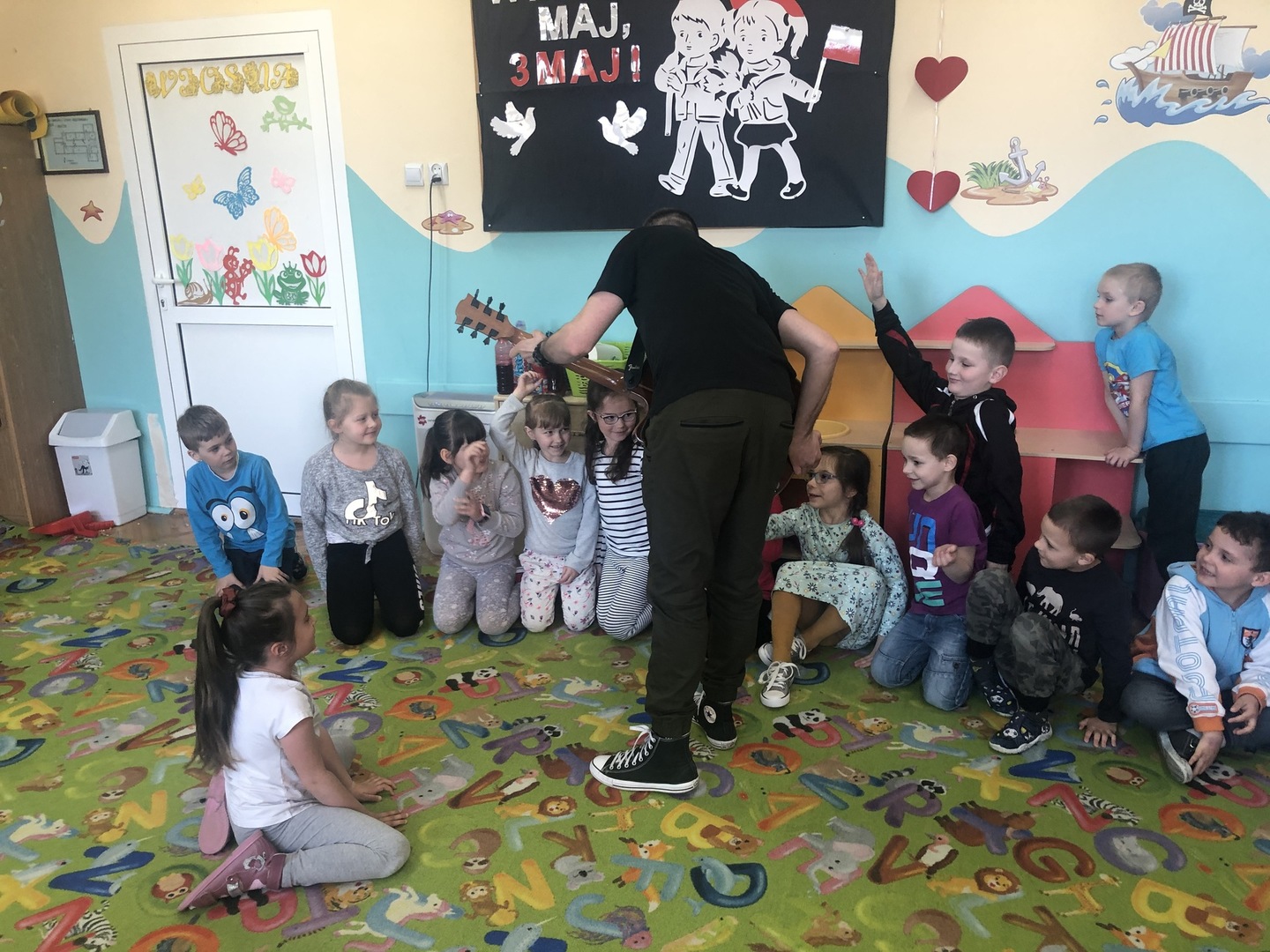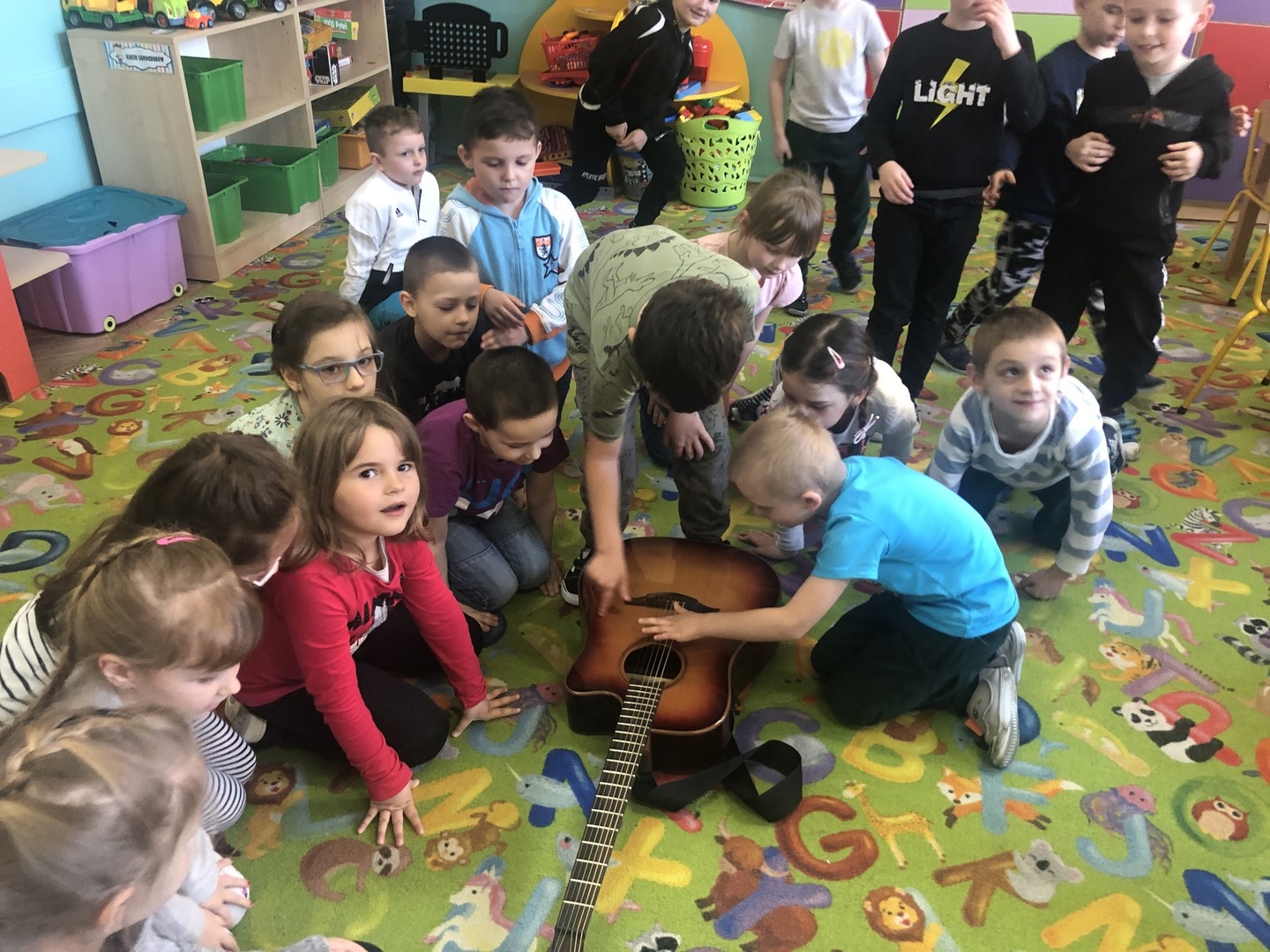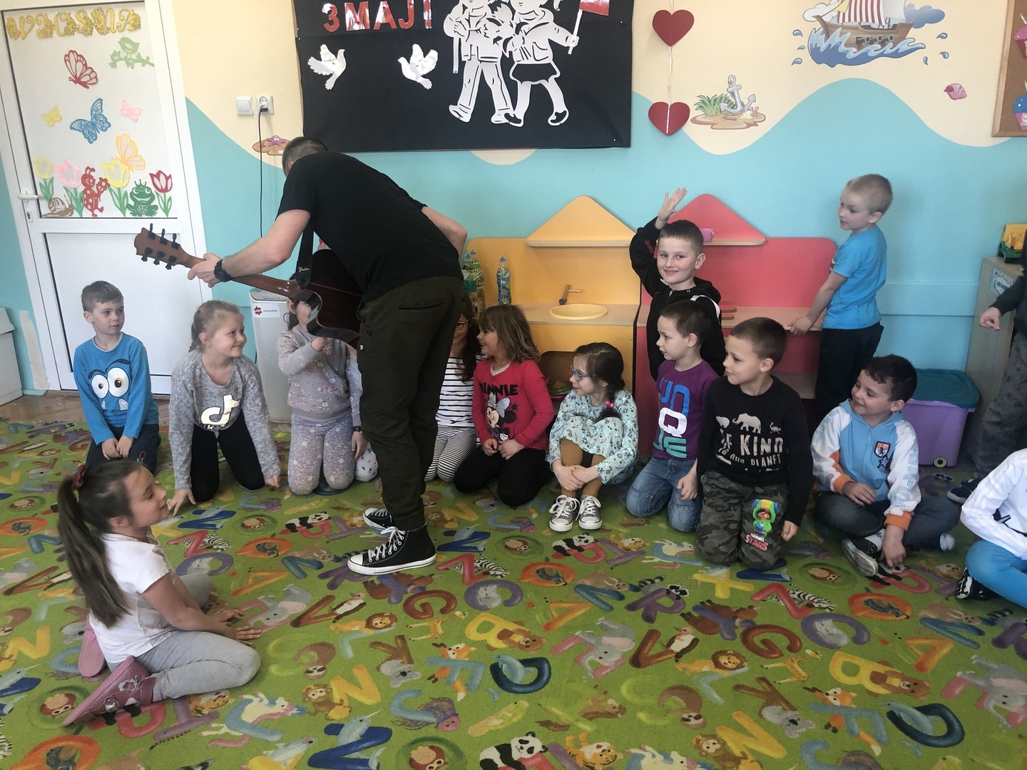 W ramach realizowanego tematu tygodniowego „W świecie muzyki”, grupę „Piraci” odwiedził tata Matyldy Pan Dominik Kot, który poprowadził zajęcia muzyczne. Dzieci dowiedziały się czym różni się gitara klasyczna od elektrycznej. Z zaciekawieniem słuchały informacji na temat instrumentów muzycznych oraz gry na gitarze. Najwięcej radości sprawiła przedszkolakom możliwość dotknięcia i uderzenia w struny instrumentu. W czasie spotkania dzieci miały okazję do wspólnego muzykowania. Hitem okazały się zagrane i zaśpiewane wspólnie z dziećmi piosenki, które dzieci nucą na co dzień w przedszkolu. Serdecznie dziękujemy Panu Dominikowi za poświęcony nam czas. To była ekscytująca i magiczna wycieczka po krainie muzyki. Bardzo dziękujemy za kontakt z żywą muzyką i zapoznanie dzieci z instrumentami.