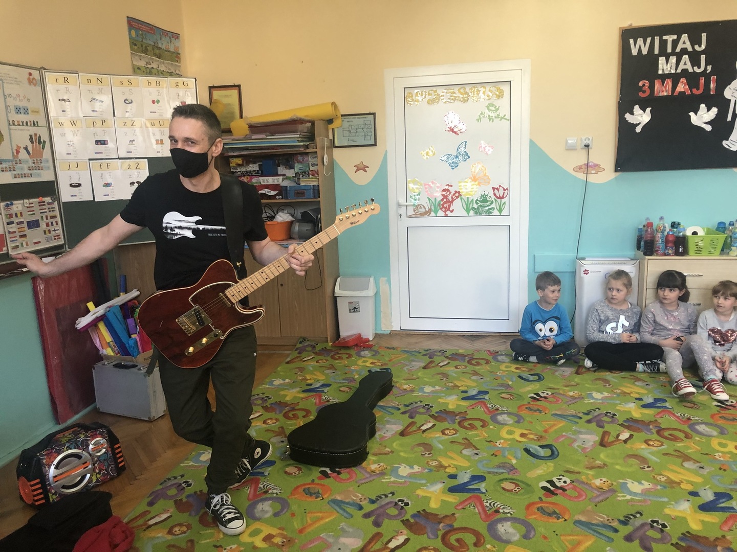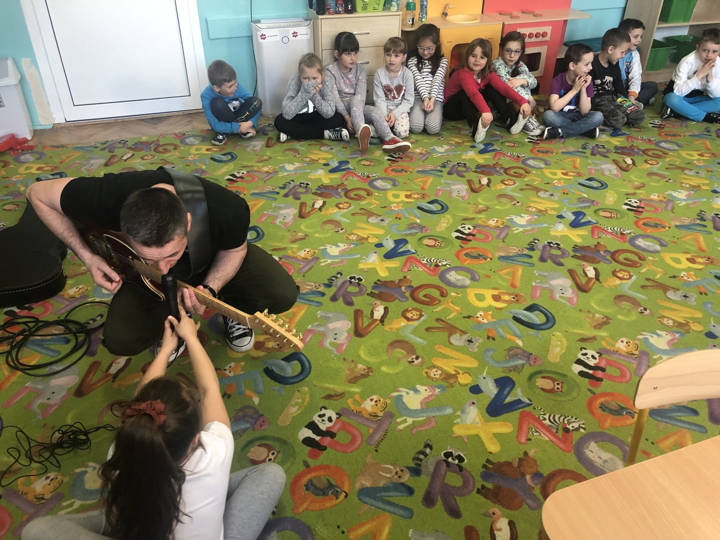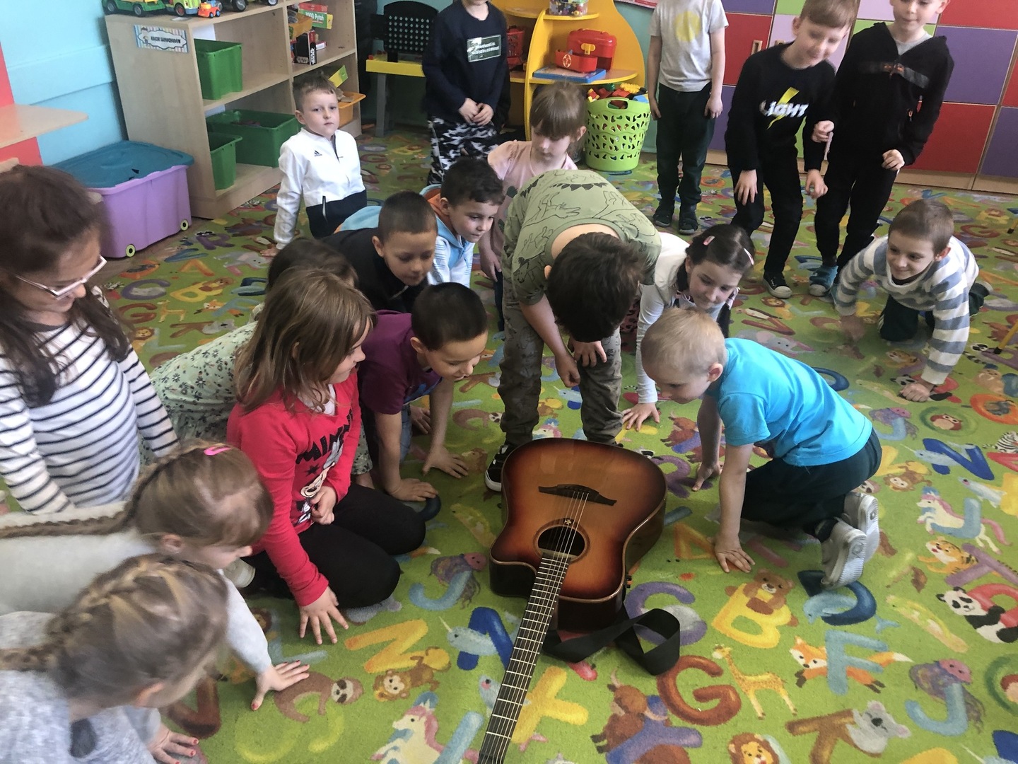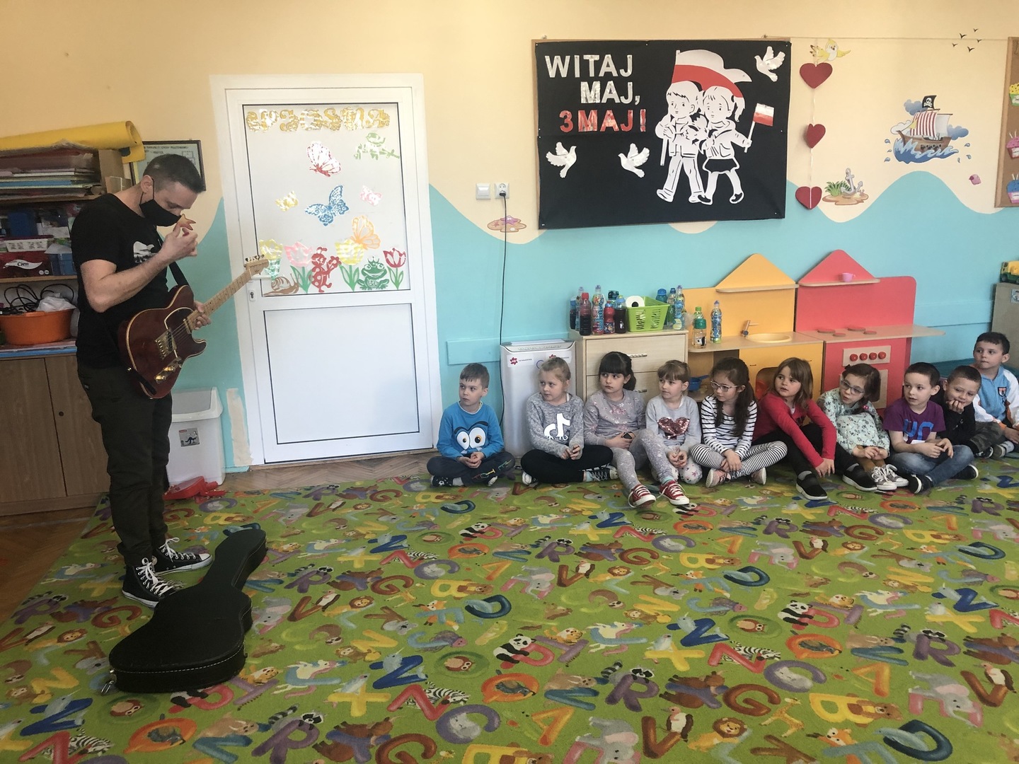 W ramach realizowanego tematu tygodniowego „W świecie muzyki”, grupę „Piraci” odwiedził tata Matyldy Pan Dominik Kot, który poprowadził zajęcia muzyczne. Dzieci dowiedziały się czym różni się gitara klasyczna od elektrycznej. Z zaciekawieniem słuchały informacji na temat instrumentów muzycznych oraz gry na gitarze. Najwięcej radości sprawiła przedszkolakom możliwość dotknięcia i uderzenia w struny instrumentu. W czasie spotkania dzieci miały okazję do wspólnego muzykowania. Hitem okazały się zagrane i zaśpiewane wspólnie z dziećmi piosenki, które dzieci nucą na co dzień w przedszkolu. Serdecznie dziękujemy Panu Dominikowi za poświęcony nam czas. To była ekscytująca i magiczna wycieczka po krainie muzyki. Bardzo dziękujemy za kontakt z żywą muzyką i zapoznanie dzieci z instrumentami.