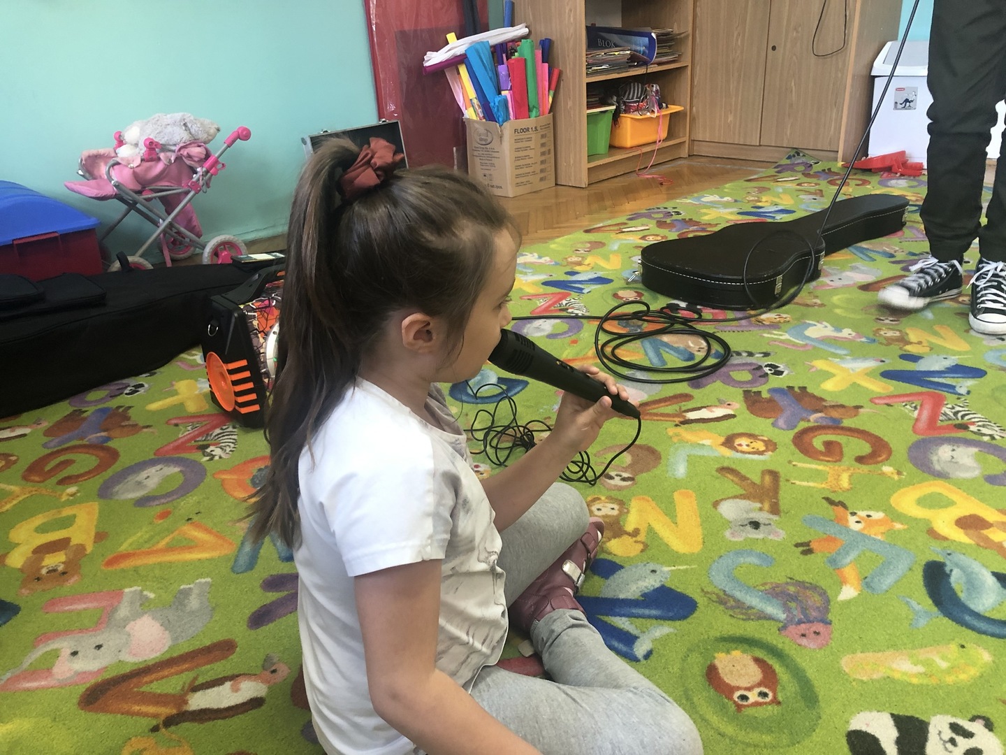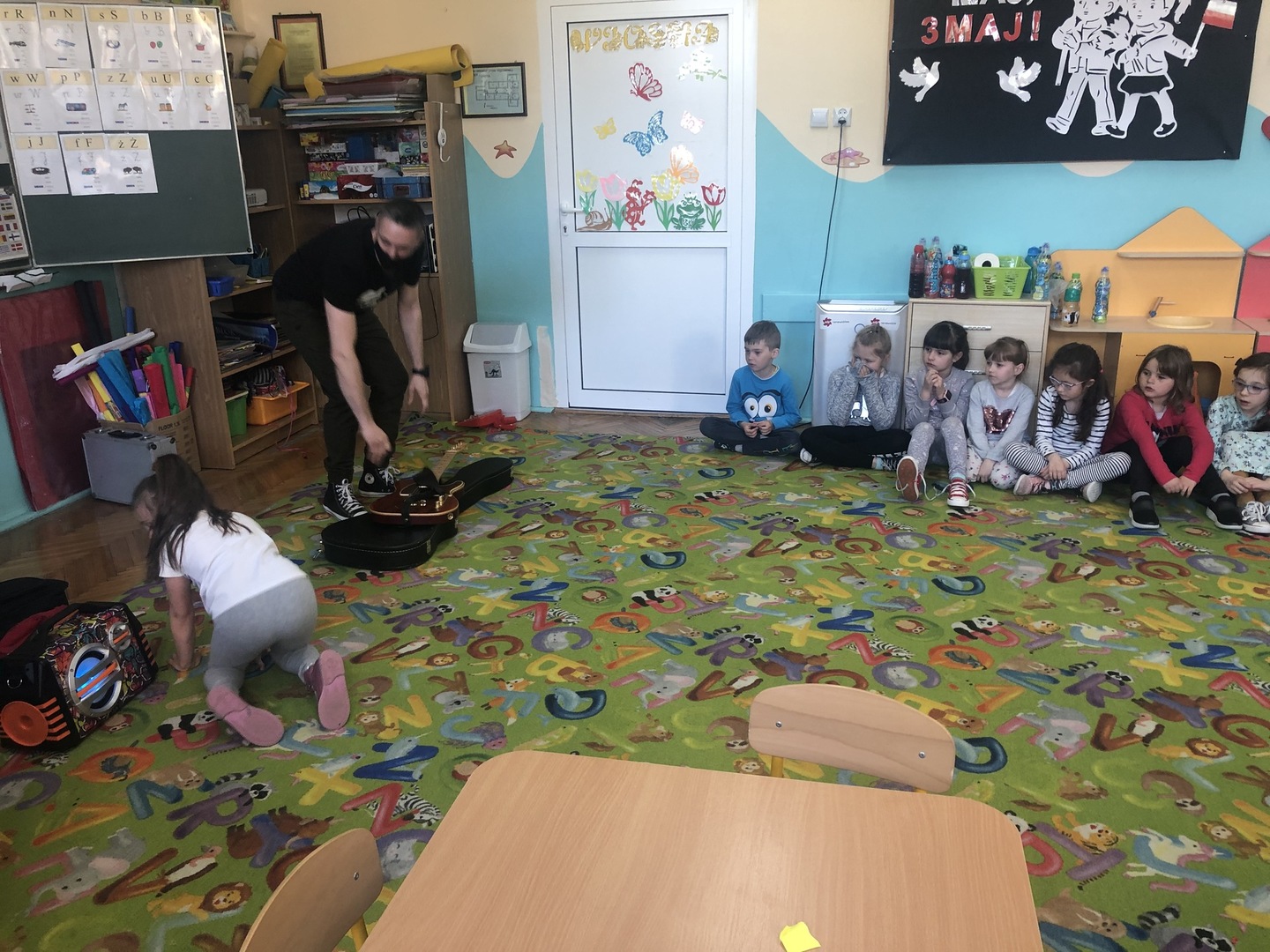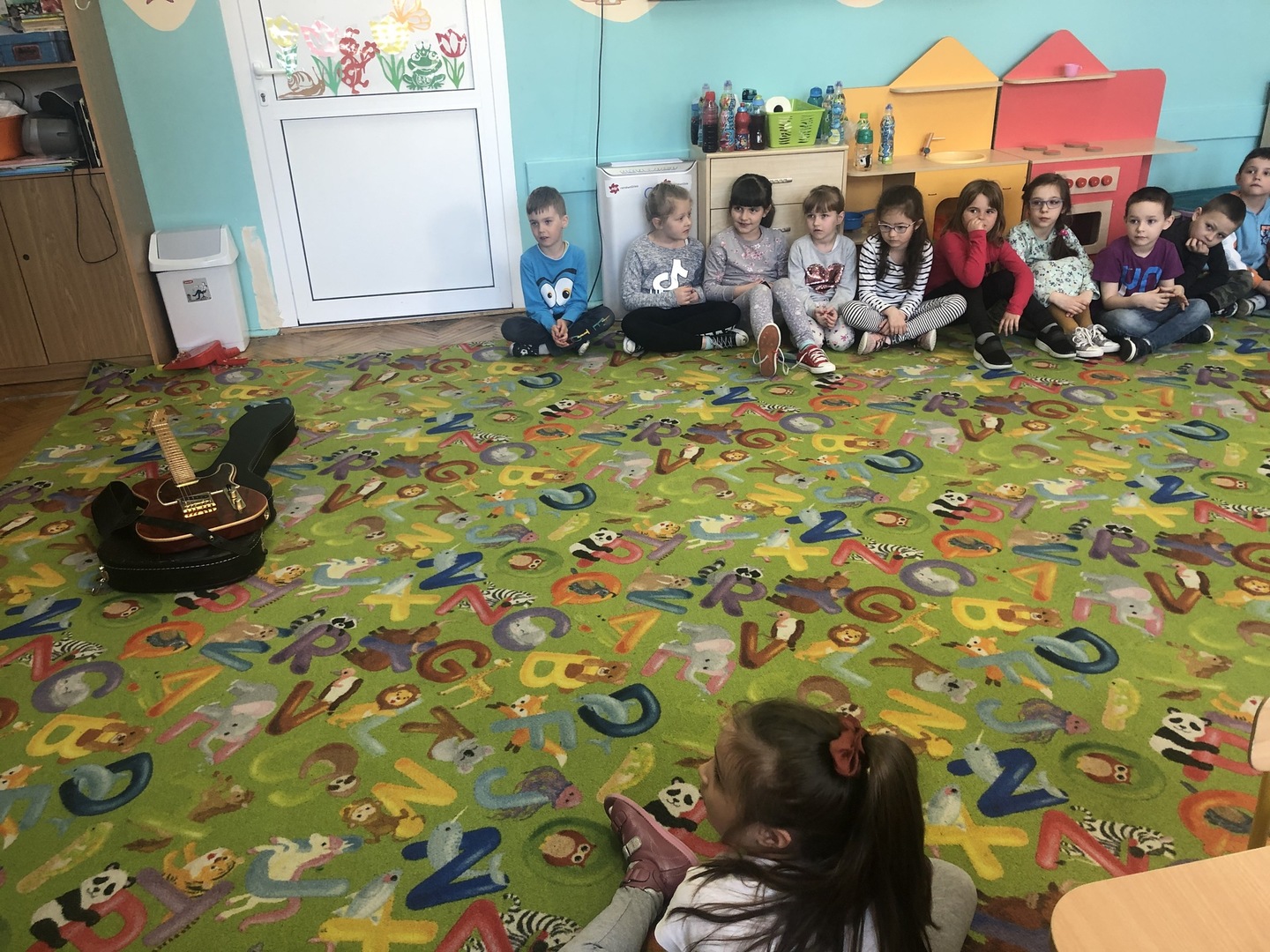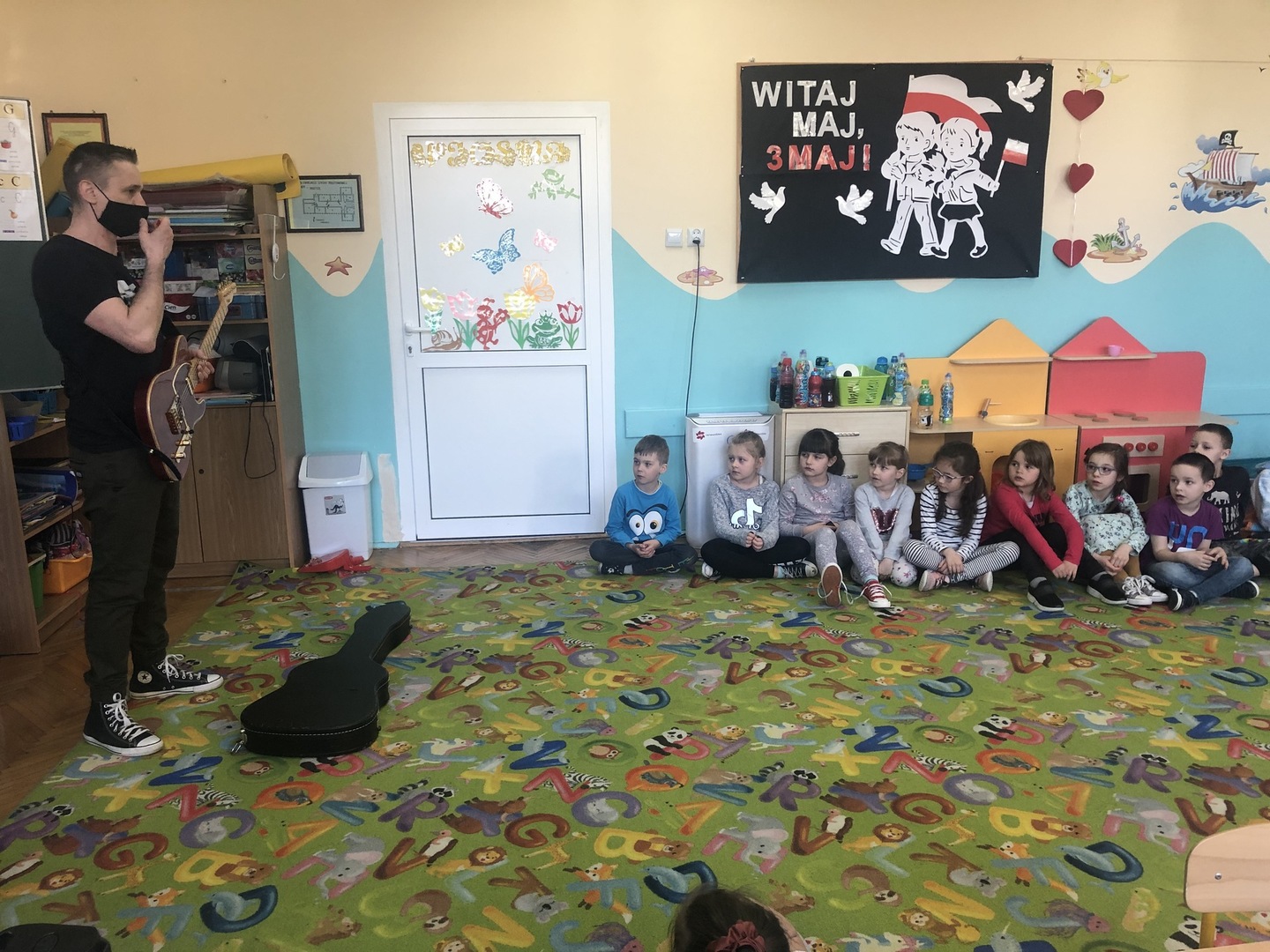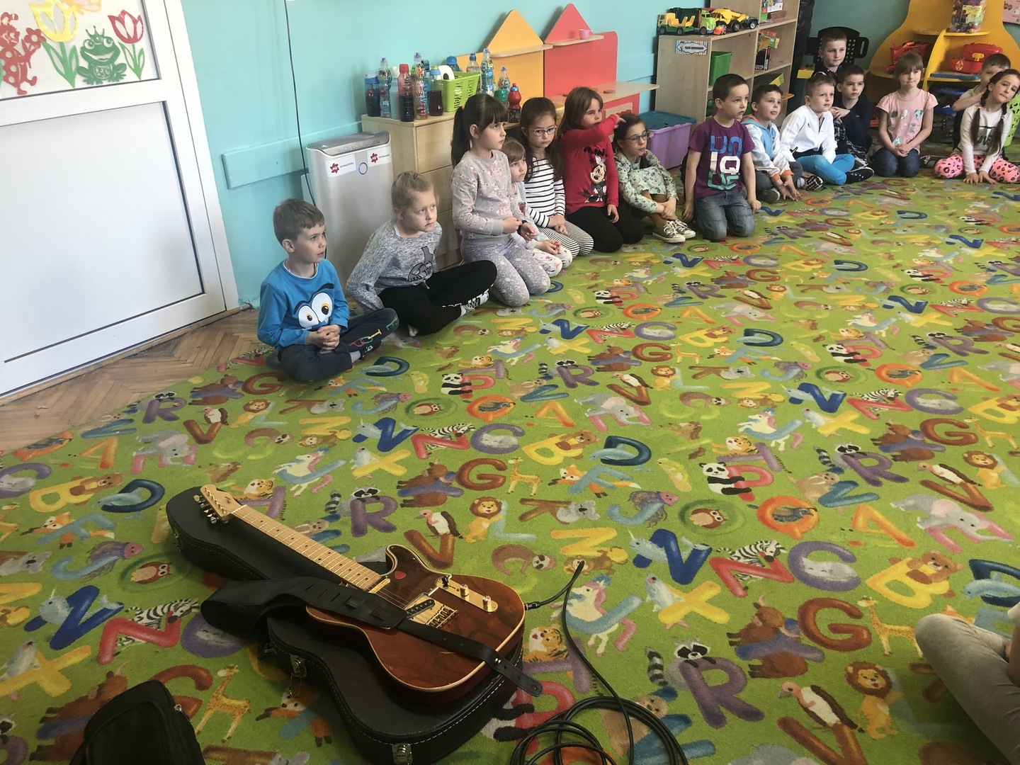 W ramach realizowanego tematu tygodniowego „W świecie muzyki”, grupę „Piraci” odwiedził tata Matyldy Pan Dominik Kot, który poprowadził zajęcia muzyczne. Dzieci dowiedziały się czym różni się gitara klasyczna od elektrycznej. Z zaciekawieniem słuchały informacji na temat instrumentów muzycznych oraz gry na gitarze. Najwięcej radości sprawiła przedszkolakom możliwość dotknięcia i uderzenia w struny instrumentu. W czasie spotkania dzieci miały okazję do wspólnego muzykowania. Hitem okazały się zagrane i zaśpiewane wspólnie z dziećmi piosenki, które dzieci nucą na co dzień w przedszkolu. Serdecznie dziękujemy Panu Dominikowi za poświęcony nam czas. To była ekscytująca i magiczna wycieczka po krainie muzyki. Bardzo dziękujemy za kontakt z żywą muzyką i zapoznanie dzieci z instrumentami.