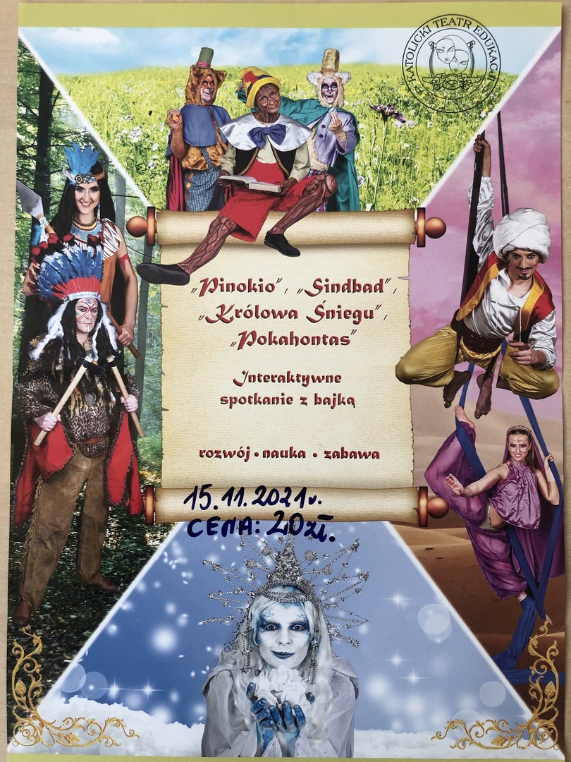 Zapraszamy dzieci na interaktywne spotkanie z bajką w dniu 15.11.2021r. (tj. poniedziałek) w wykonaniu Katolickiego Teatru Edukacji.