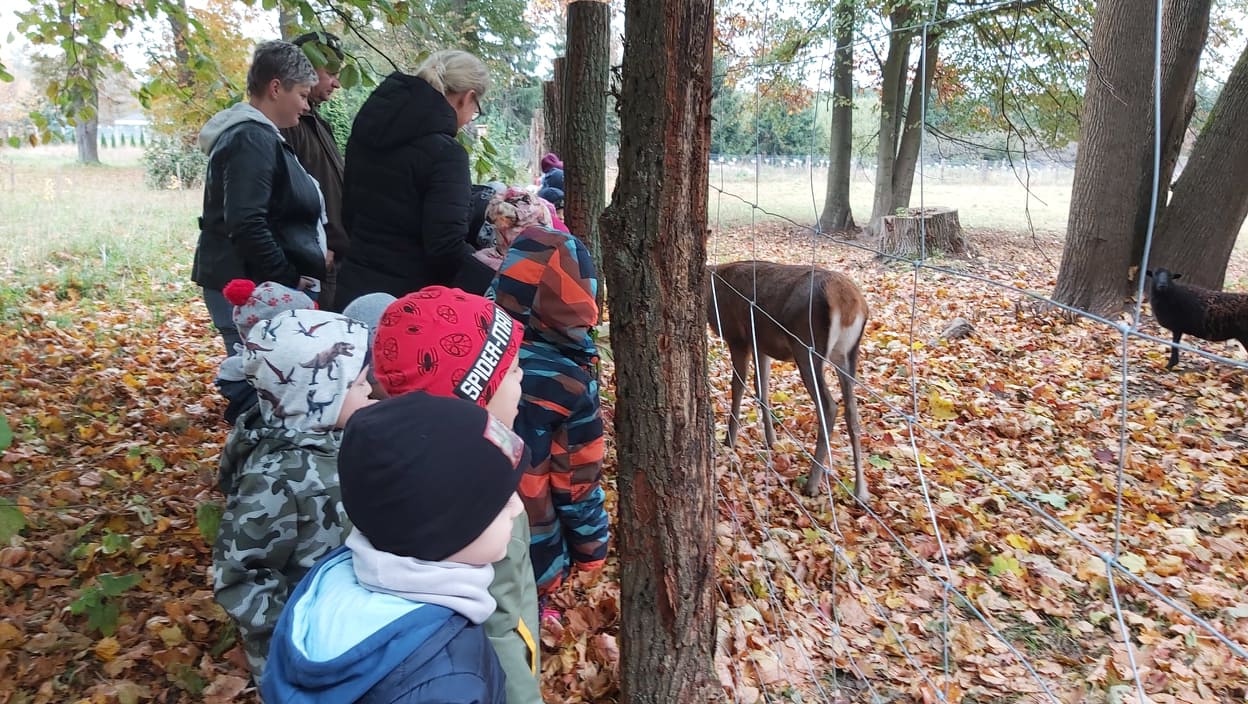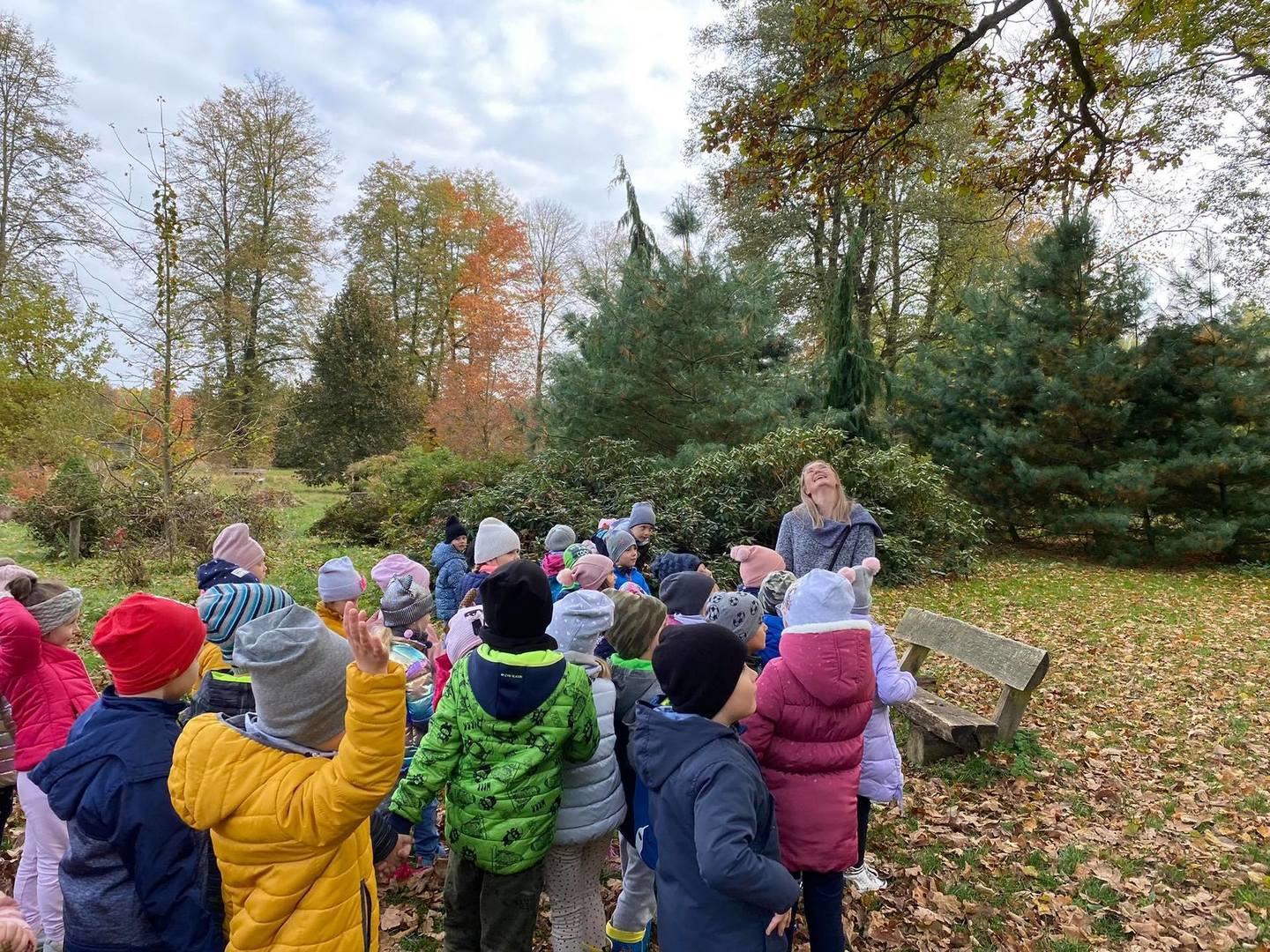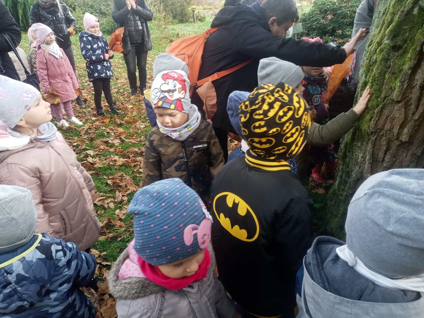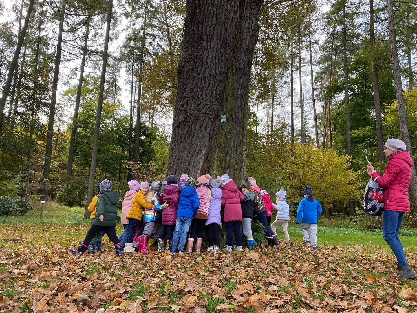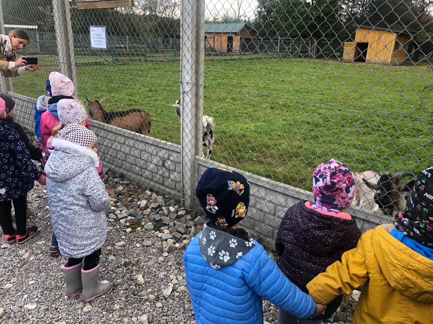 i krzewach znajdujących się w tym niezwykłym miejscu. Na dzieci czekało także wiele wspaniałych atrakcji, m.in. „wspinaczka” po Alpinarium, zabawa wokół największego dębu, Marcela, zbieranie wielu ciekawych okazów liści i poznawanie owoców krzewów jadalnych. Ostatnim punktem i zwieńczeniem wycieczki było zwiedzanie Zwierzyńca, w którym dzieci nie tylko podziwiały wspaniałe zwierzęta, ale także miały okazje nakarmić je przygotowanymi przez leśniczego smakołykami.