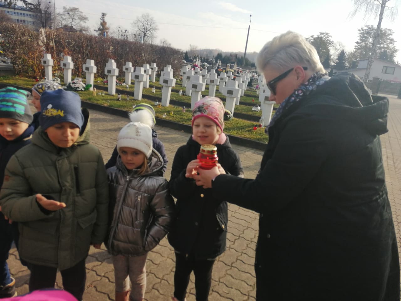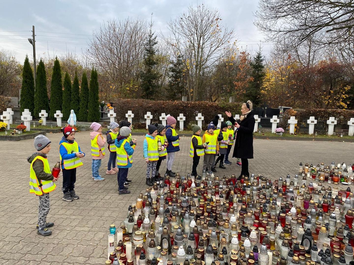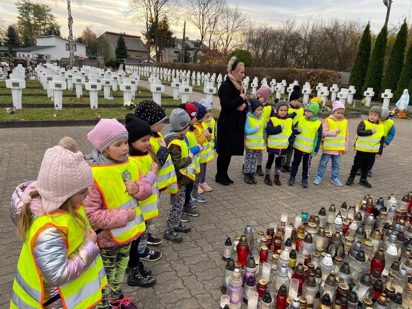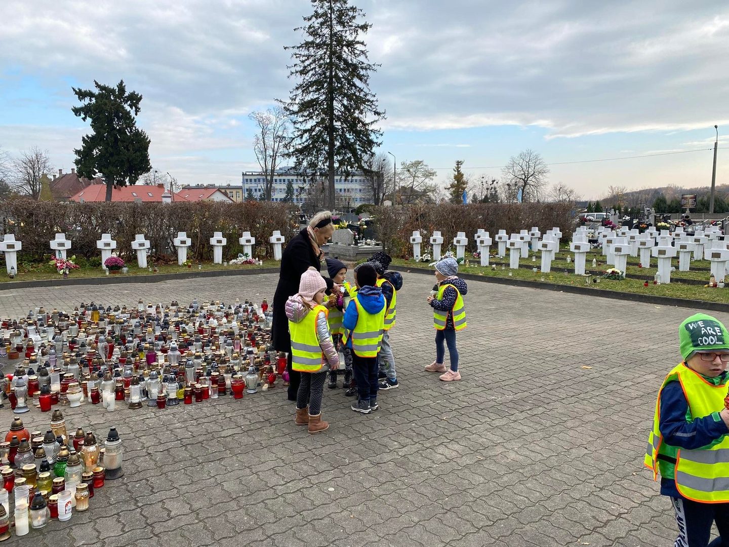 W dniu 02 listopada 2021 roku sześciolatki z naszego przedszkola wraz z wychowawczyniami wybrały się na cmentarz, celem uczczenia pamięci zmarłych. Dzieci wspólnie z paniami pomodliły się i zapaliły znicze przed tablicą nagrobkową upamiętniającą żołnierzy polskich poległych podczas wojny. Przedszkolaki mogły w ciszy, zadumie, posłuchać opowieści wychowawcy na temat przeszłości naszej ojczyzny. Spacer alejkami cmentarza był dla dzieci ogromnym przeżyciem, szły skupione i bardzo zaciekawione. W czasie wycieczki, dzieci poznawały tradycje, zwyczaje związane ze świętem zmarłych w naszej kulturze i religii. Zrozumiały też jak należy zachowywać się na cmentarzu, by nie zakłócać spokoju zmarłych i osób odwiedzających to miejsce. To była bardzo ważna lekcja wychowania rodzinnego, obywatelskiego i patriotycznego, która pozostanie dzieciom w pamięci.