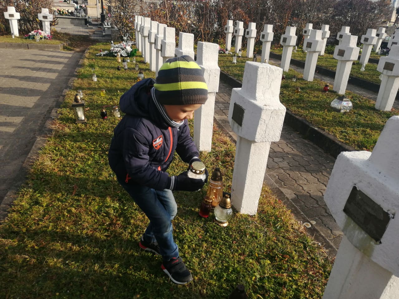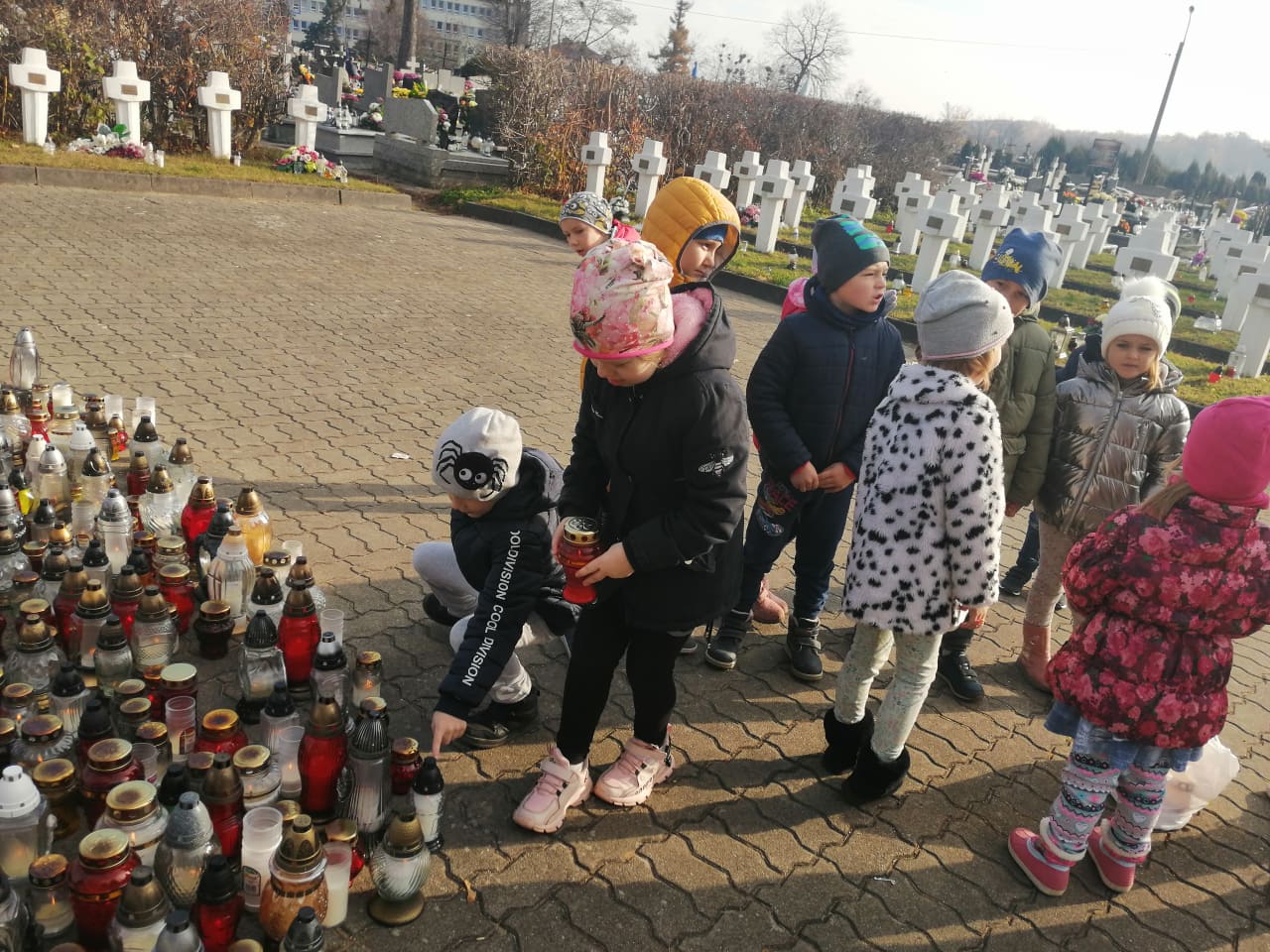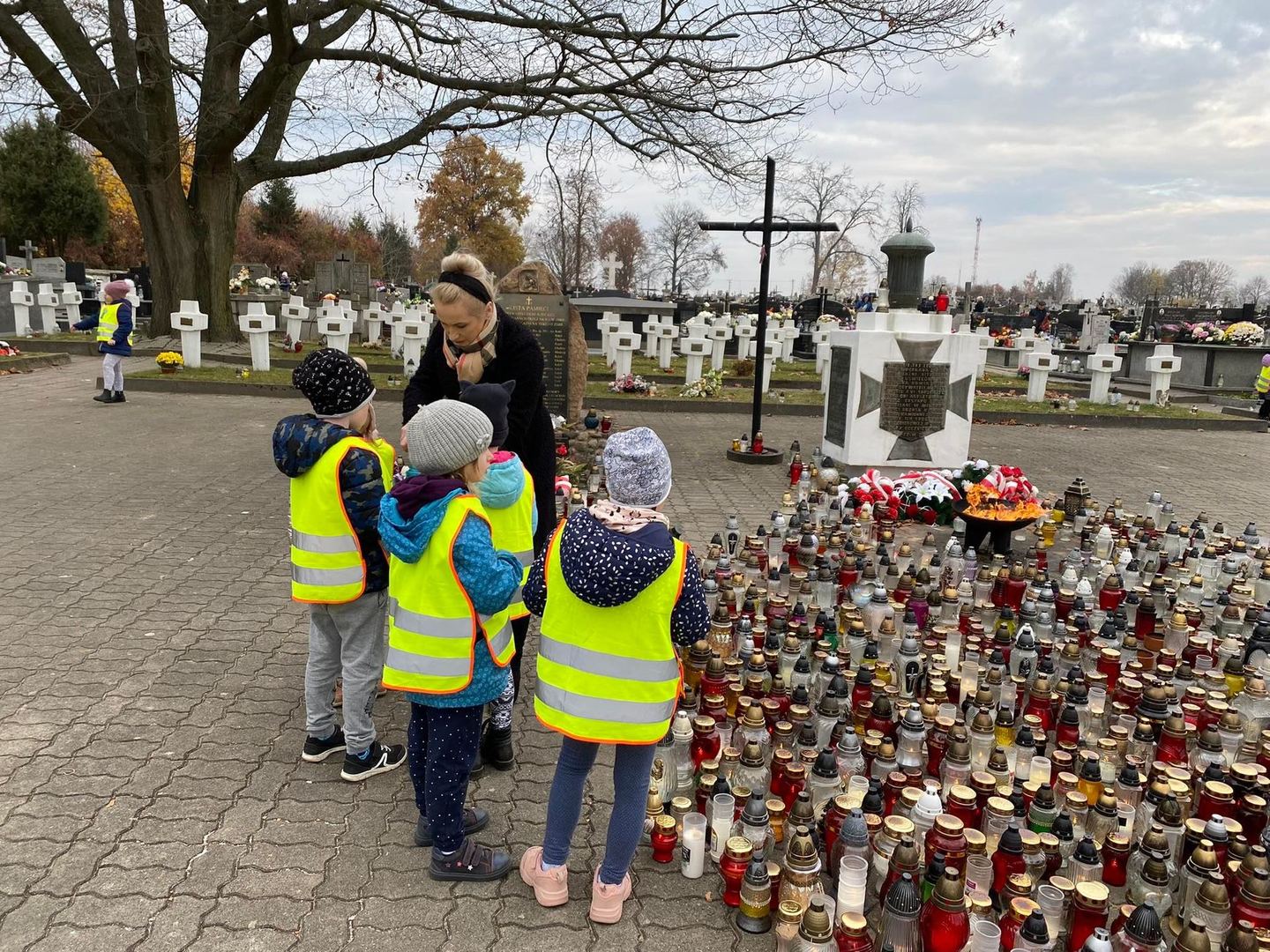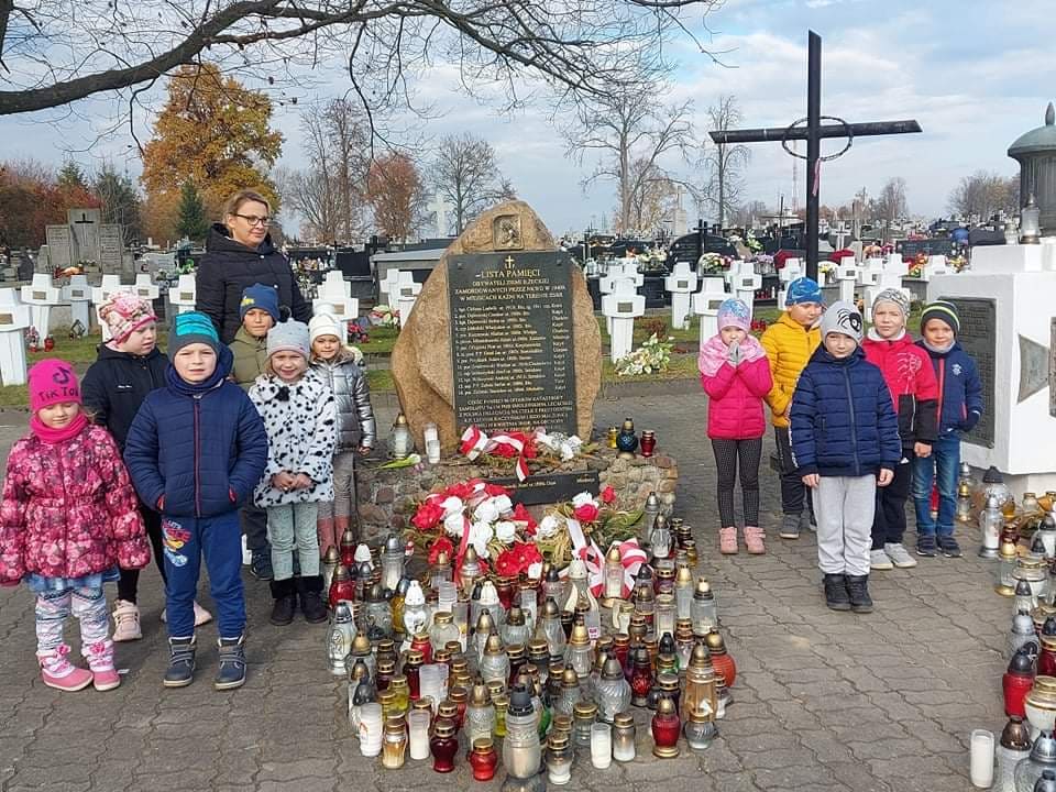 W dniu 02 listopada 2021 roku sześciolatki z naszego przedszkola wraz z wychowawczyniami wybrały się na cmentarz, celem uczczenia pamięci zmarłych. Dzieci wspólnie z paniami pomodliły się i zapaliły znicze przed tablicą nagrobkową upamiętniającą żołnierzy polskich poległych podczas wojny. Przedszkolaki mogły w ciszy, zadumie, posłuchać opowieści wychowawcy na temat przeszłości naszej ojczyzny. Spacer alejkami cmentarza był dla dzieci ogromnym przeżyciem, szły skupione i bardzo zaciekawione. W czasie wycieczki, dzieci poznawały tradycje, zwyczaje związane ze świętem zmarłych w naszej kulturze i religii. Zrozumiały też jak należy zachowywać się na cmentarzu, by nie zakłócać spokoju zmarłych i osób odwiedzających to miejsce. To była bardzo ważna lekcja wychowania rodzinnego, obywatelskiego i patriotycznego, która pozostanie dzieciom w pamięci.