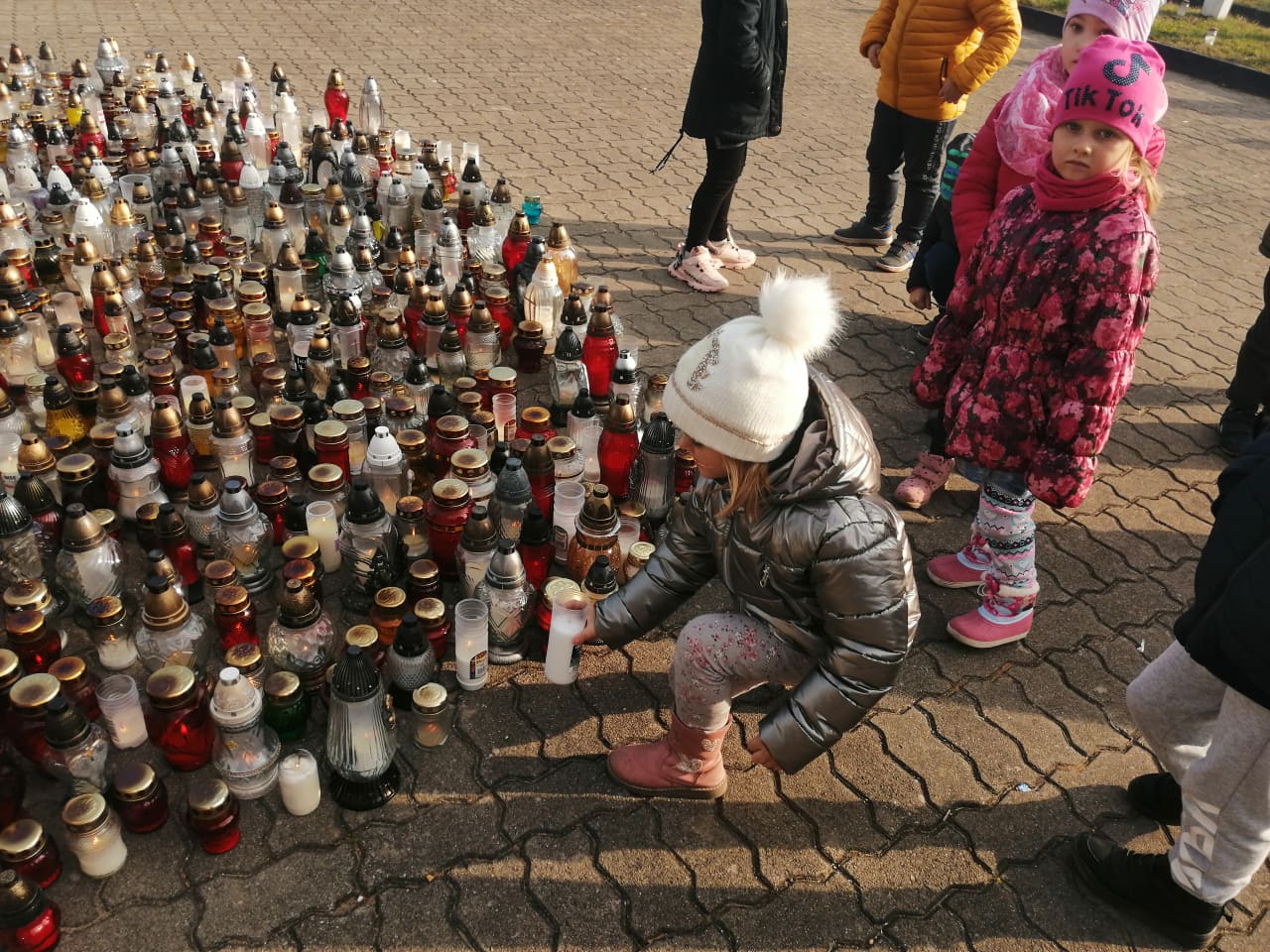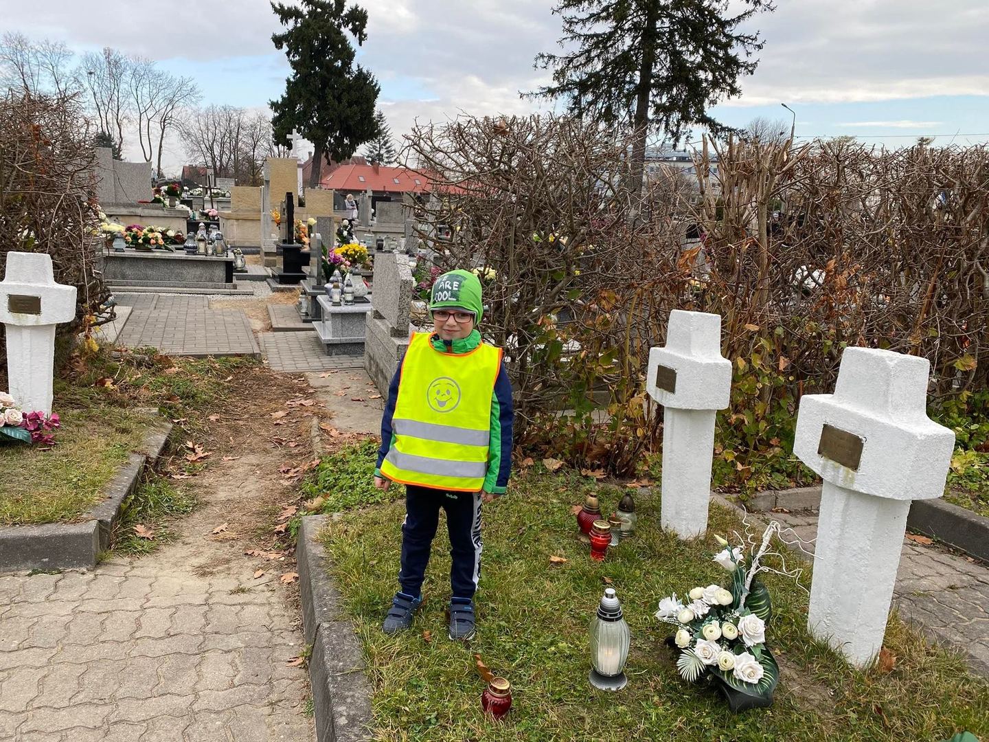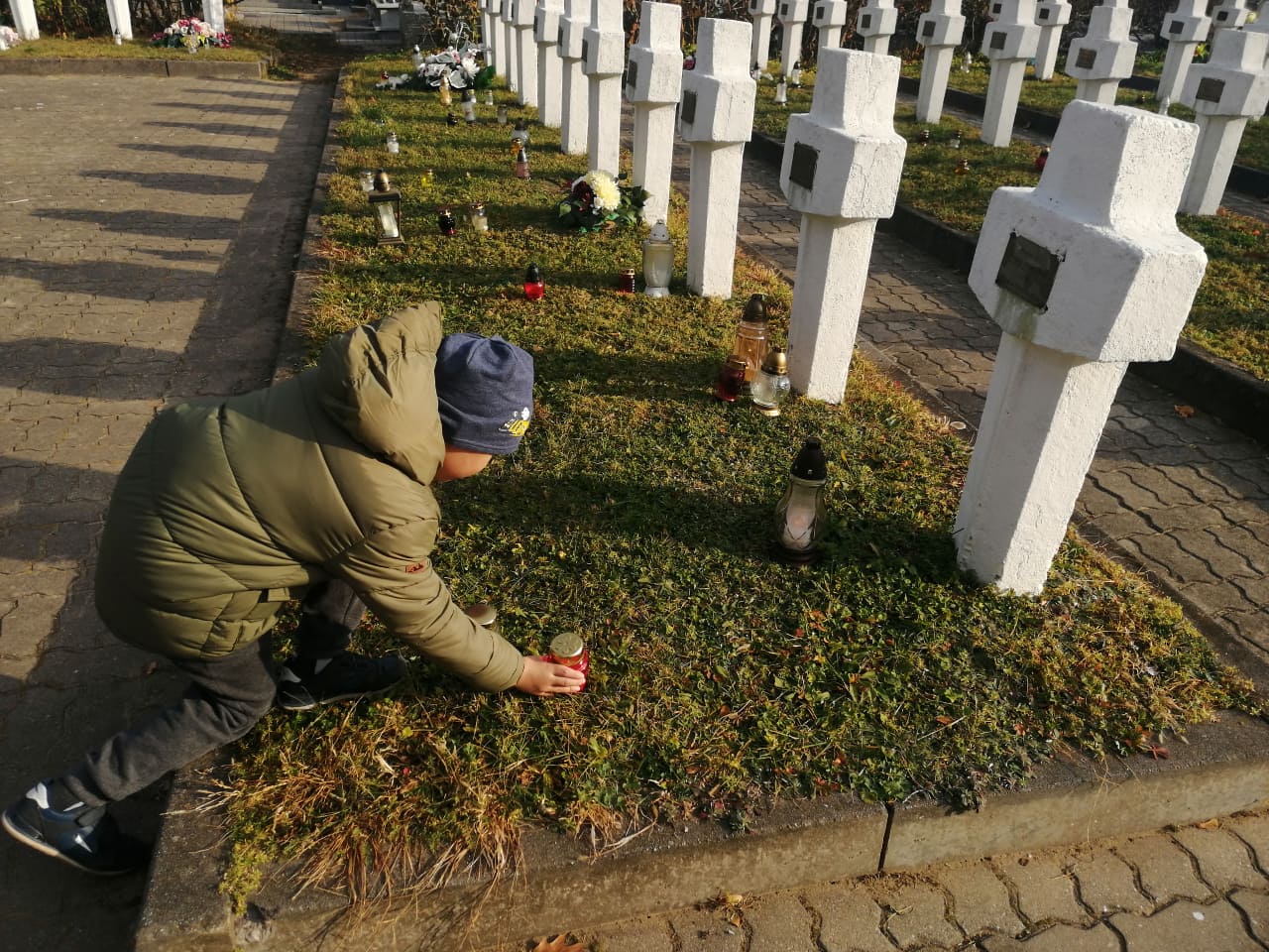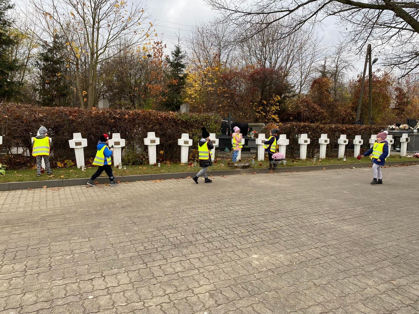W dniu 02 listopada 2021 roku sześciolatki z naszego przedszkola wraz z wychowawczyniami wybrały się na cmentarz, celem uczczenia pamięci zmarłych. Dzieci wspólnie z paniami pomodliły się i zapaliły znicze przed tablicą nagrobkową upamiętniającą żołnierzy polskich poległych podczas wojny. Przedszkolaki mogły w ciszy, zadumie, posłuchać opowieści wychowawcy na temat przeszłości naszej ojczyzny. Spacer alejkami cmentarza był dla dzieci ogromnym przeżyciem, szły skupione i bardzo zaciekawione. W czasie wycieczki, dzieci poznawały tradycje, zwyczaje związane ze świętem zmarłych w naszej kulturze i religii. Zrozumiały też jak należy zachowywać się na cmentarzu, by nie zakłócać spokoju zmarłych i osób odwiedzających to miejsce. To była bardzo ważna lekcja wychowania rodzinnego, obywatelskiego i patriotycznego, która pozostanie dzieciom w pamięci.