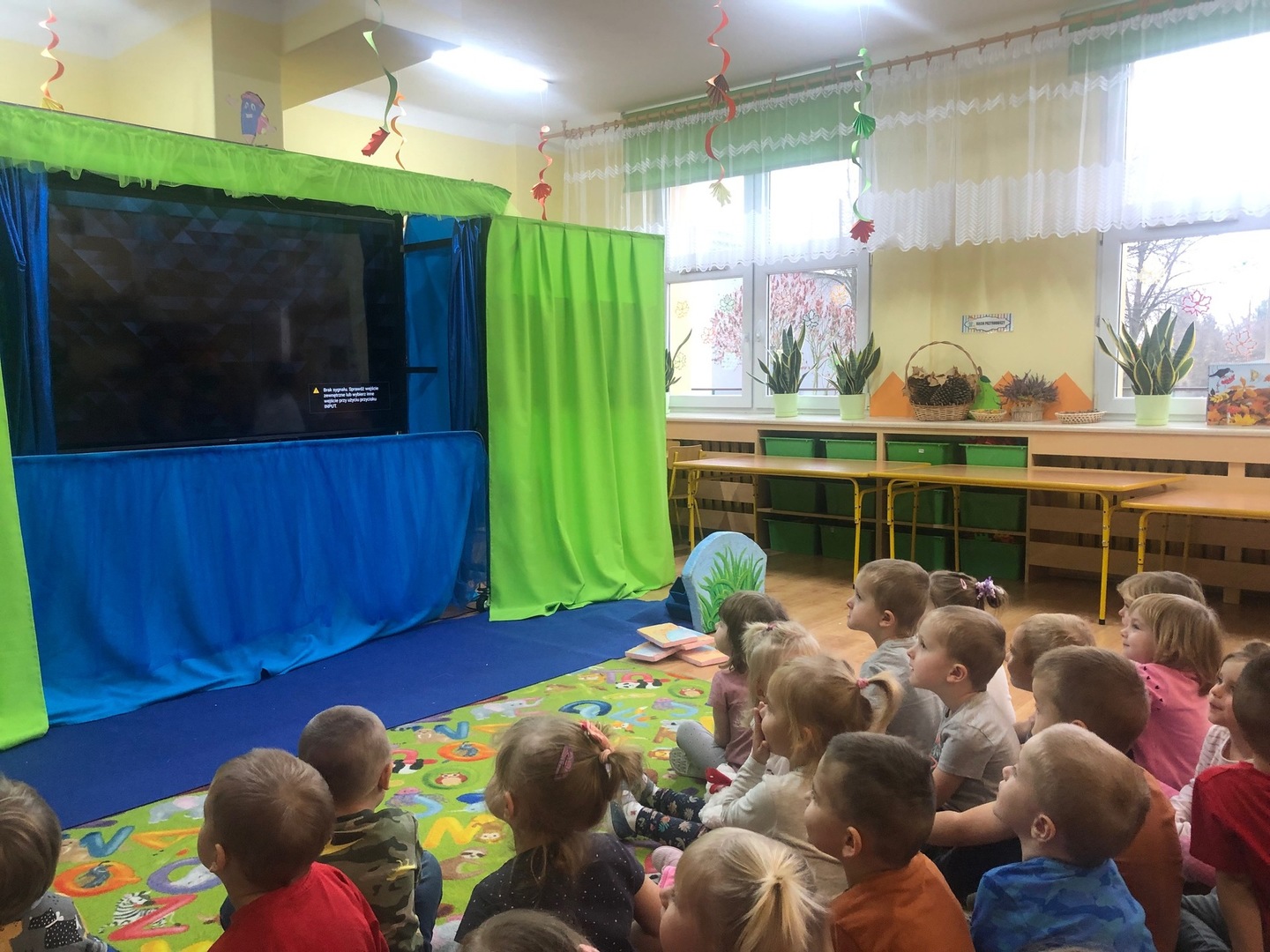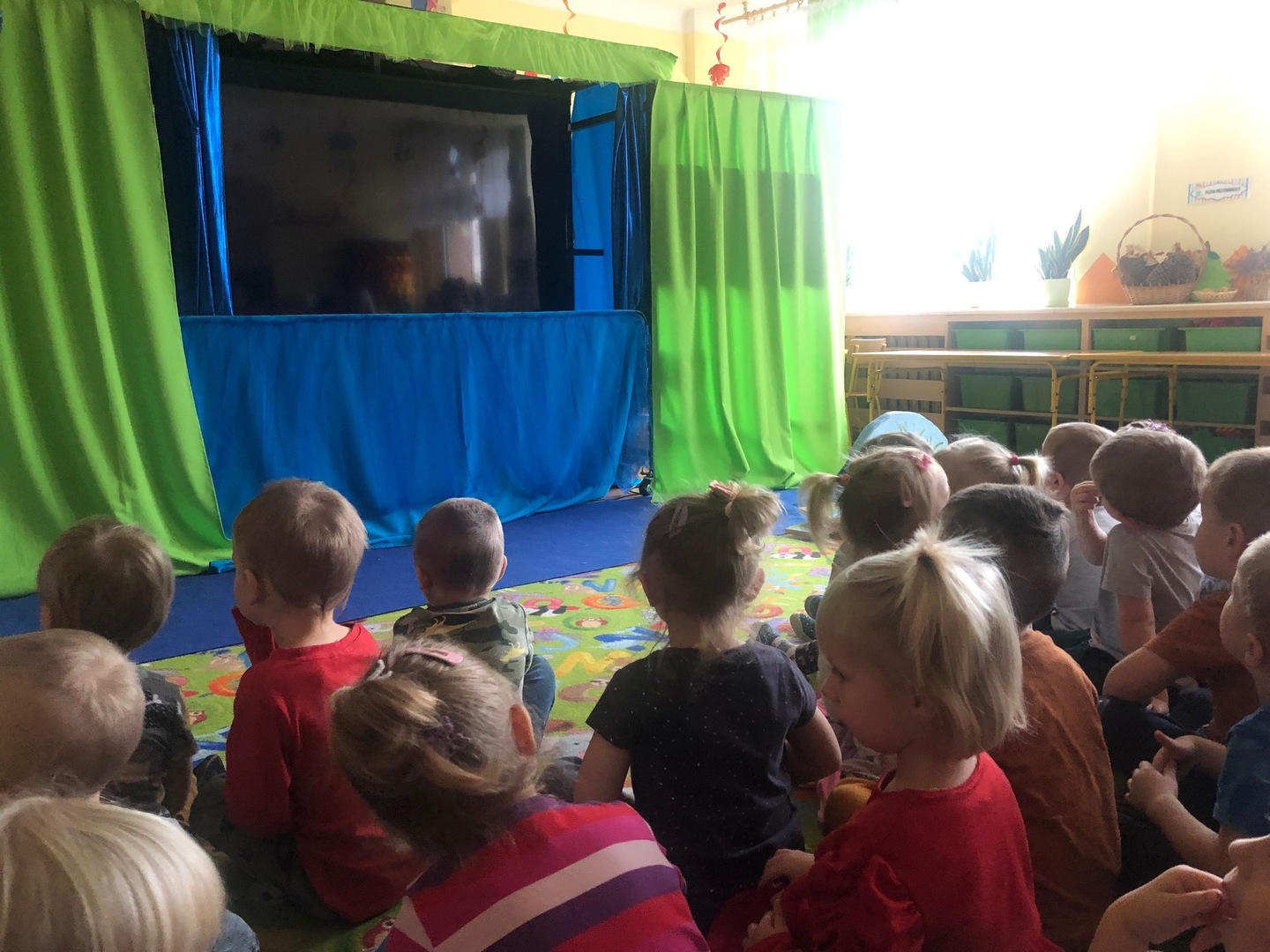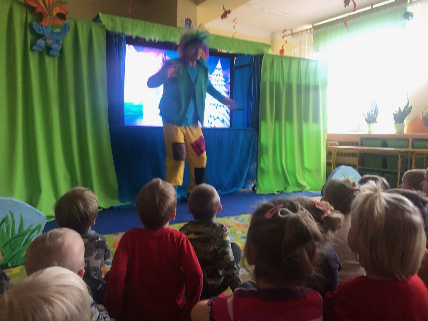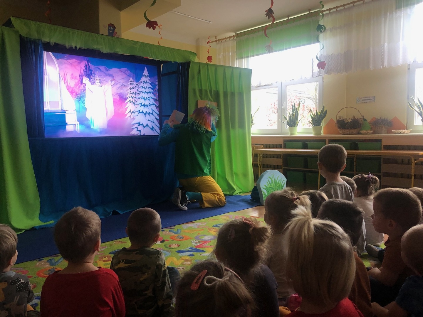 W poniedziałek 15 listopada nasze przedszkolaki obejrzały spektakl teatralny pt. "Interaktywne spotkanie z bajką". Dzieci poznały bohaterów bajek: „Pinokio”, „Sindbad”, „Królowa Śniegu” i „Pocahontas”. Projekcja dostarczyła dzieciom wielu emocji. Z zaciekawieniem słuchały narratora, odpowiadały na jego pytania oraz obserwowały iluminację i łapały bańki mydlane. Na zakończenie każde dziecko otrzymało książeczkę wraz z zakładkami z wizerunkiem bohaterów obejrzanych bajek.