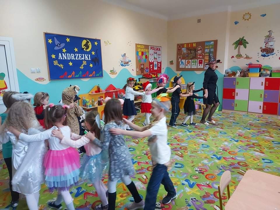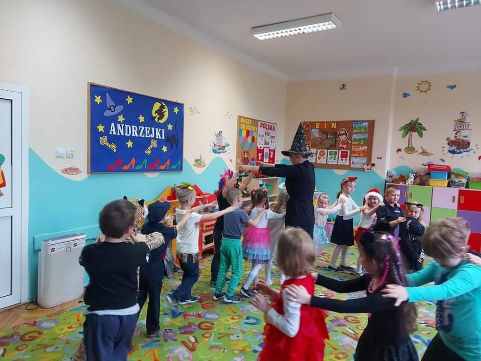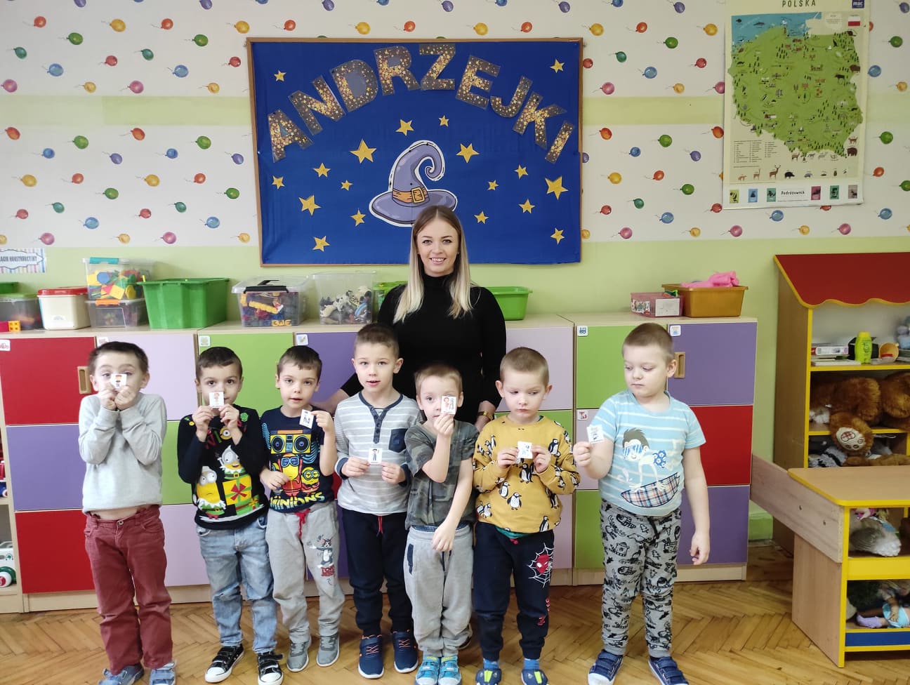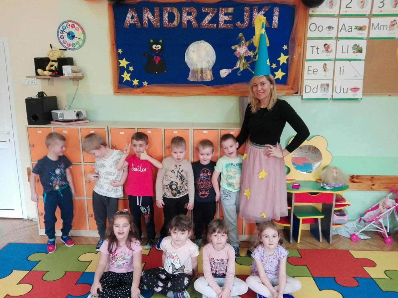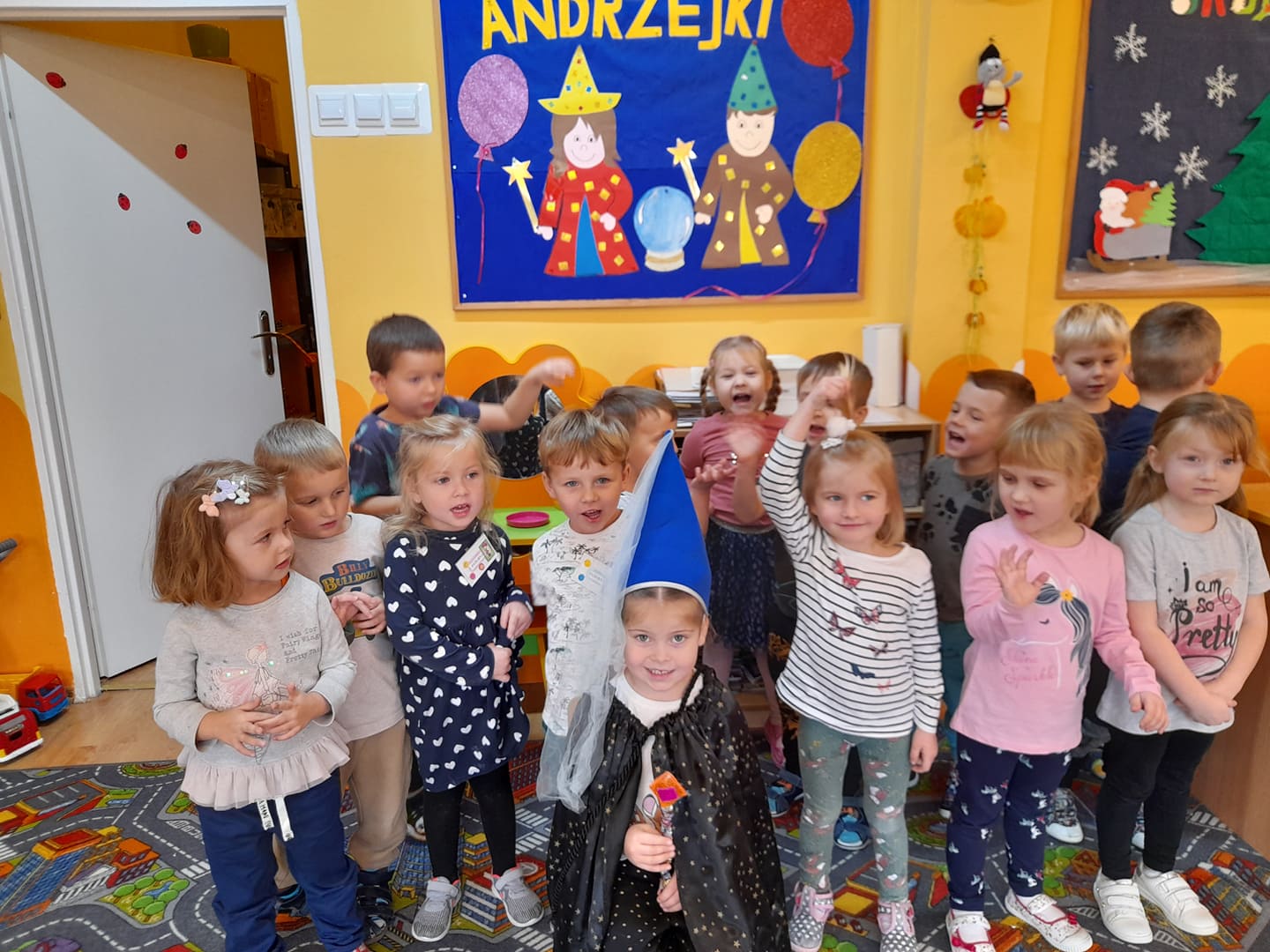 30 listopada nasze Starszaki przeniosły się w magiczny świat wróżb i zabaw andrzejkowych. W każdej grupie przedszkolaki chciały zajrzeć w przyszłość, sprawdzić co je czeka. Poznały zwyczaje i tradycje andrzejkowe, integrowały się w zabawie, współdziałały z grupą kolegów i koleżanek. Ten dzień był dniem radosnych zabaw i wróżb, w których dzieci mogły poznać swoją bliższą i dalszą przyszłość. Nie zabrakło przekłuwania serduszek z imionami, losowania swoich przyszłych zawodów, a także ustawiania butów, aby sprawdzić, który chłopiec pierwszy się ożeni i która dziewczynka pierwsza wyjdzie za mąż. Wróżby przeplatane były tańcami oraz zabawami przy skocznej muzyce. Pod koniec zabawy przedszkolaki częstowały się słodkim poczęstunkiem. Czy wróżby się spełnią? Przyszłość nam pokaże. Jednego możemy być pewni, że dały one naszym Starszakom wiele radości i po raz kolejny były okazją do wspólnej, wesołej zabawy.