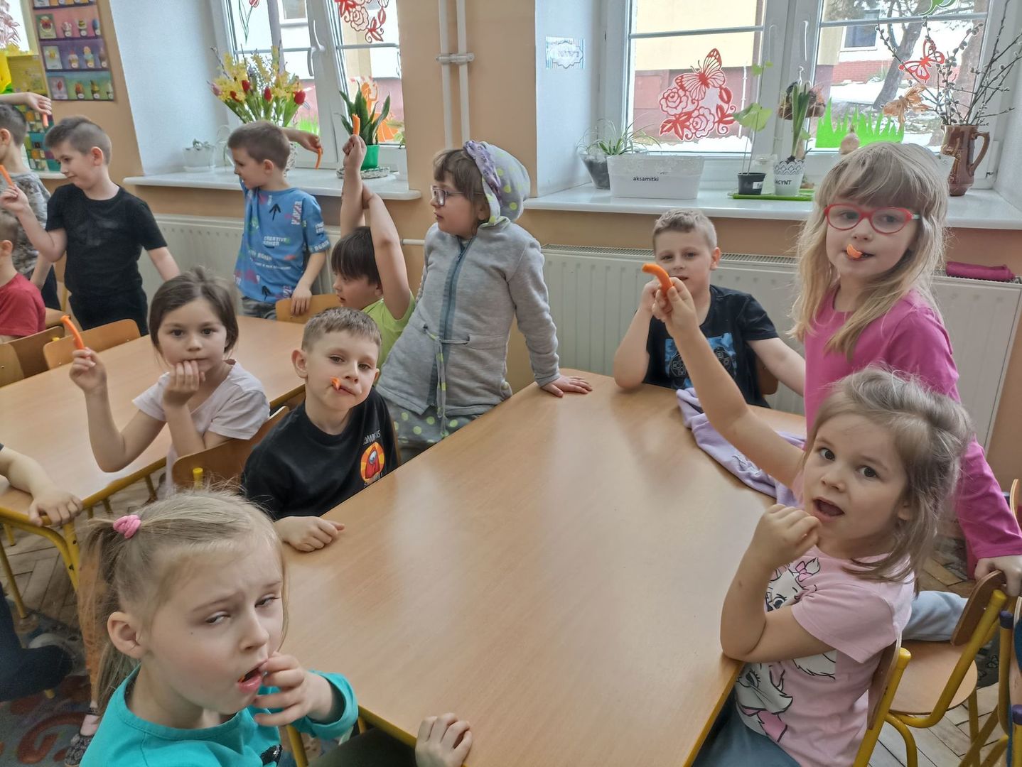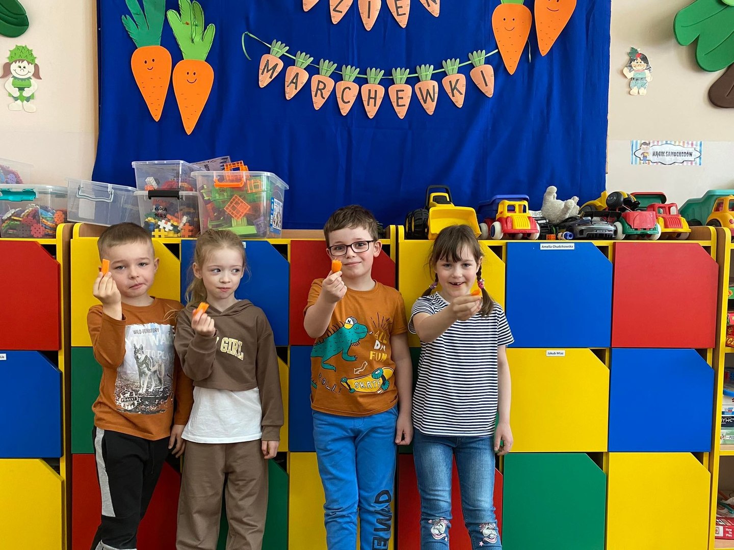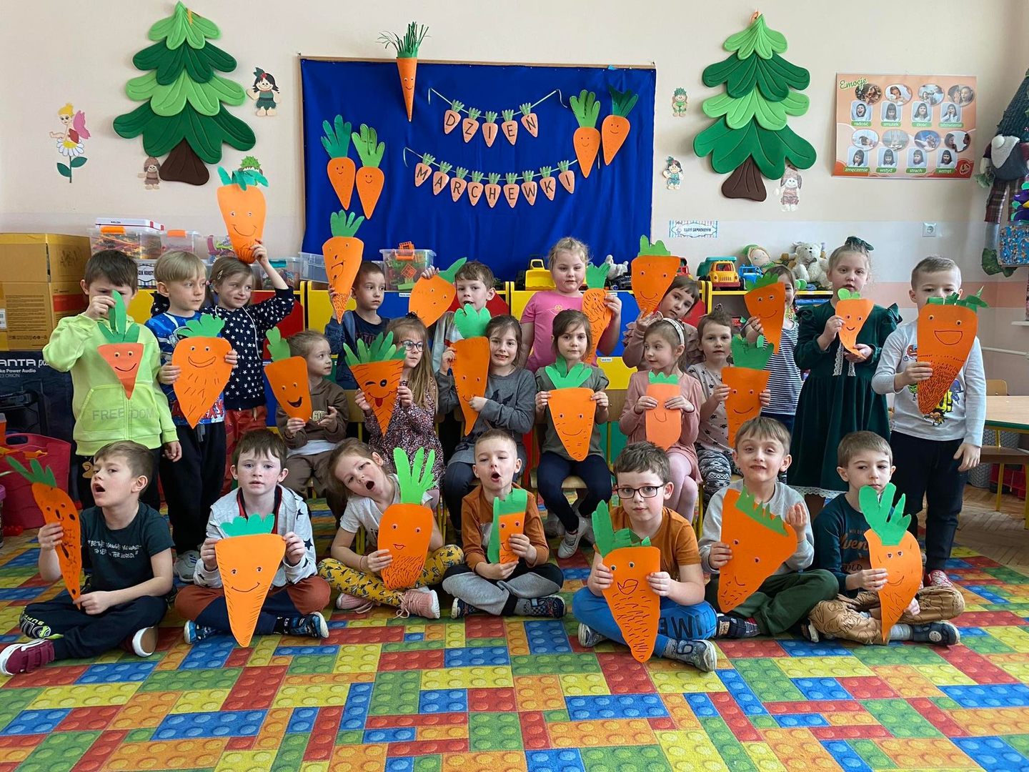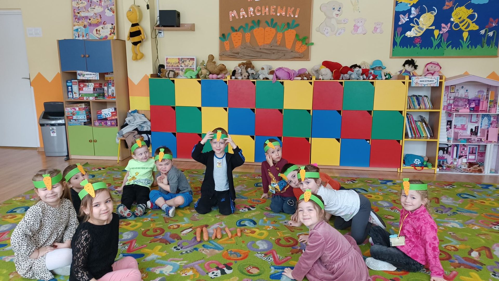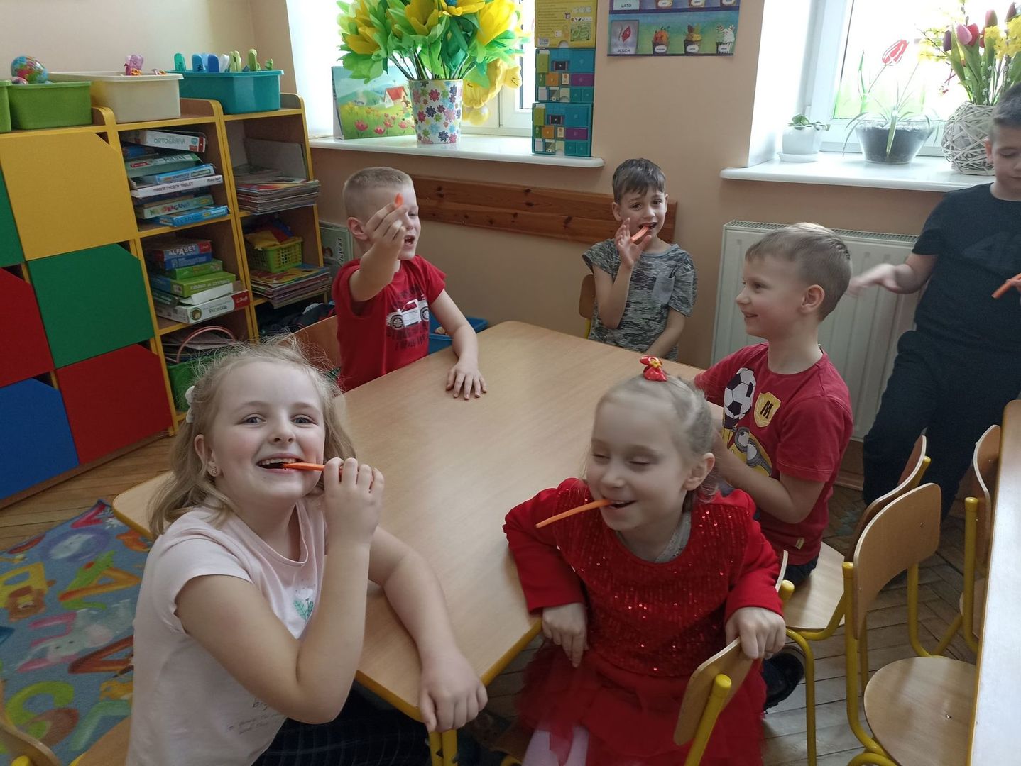 Dzień 04.04.2022r. był dniem wyjątkowo- pomarańczowym, marchewkowym, zdrowym i witaminowym. W tym dniu przedszkolaki poznały zalety i walory marchewki. Dzieci mogły się dowiedzieć wiele ciekawych rzeczy: jak bardzo jest zdrowa, zawiera wiele cennych witamin i składników odżywczych, korzystnie wpływa na skórę, włosy oraz wzrok. Warto pić także sok z marchwi, bo to witaminowa „bomba”. Ten dzień wypełniony był zabawami przy piosenkach o marchewce, pracami plastycznymi, chrupaniem surowych marchewek, próbowaniem marchewkowego soku a także degustacją marchewkowego ciasta. Dzięki takim działaniom prowadzonym już od najmłodszych lat, rozbudzamy u dzieci zainteresowanie własnym zdrowiem, potrzebę prawidłowego odżywiania się i rozróżniania produktów warunkujących zdrowie.