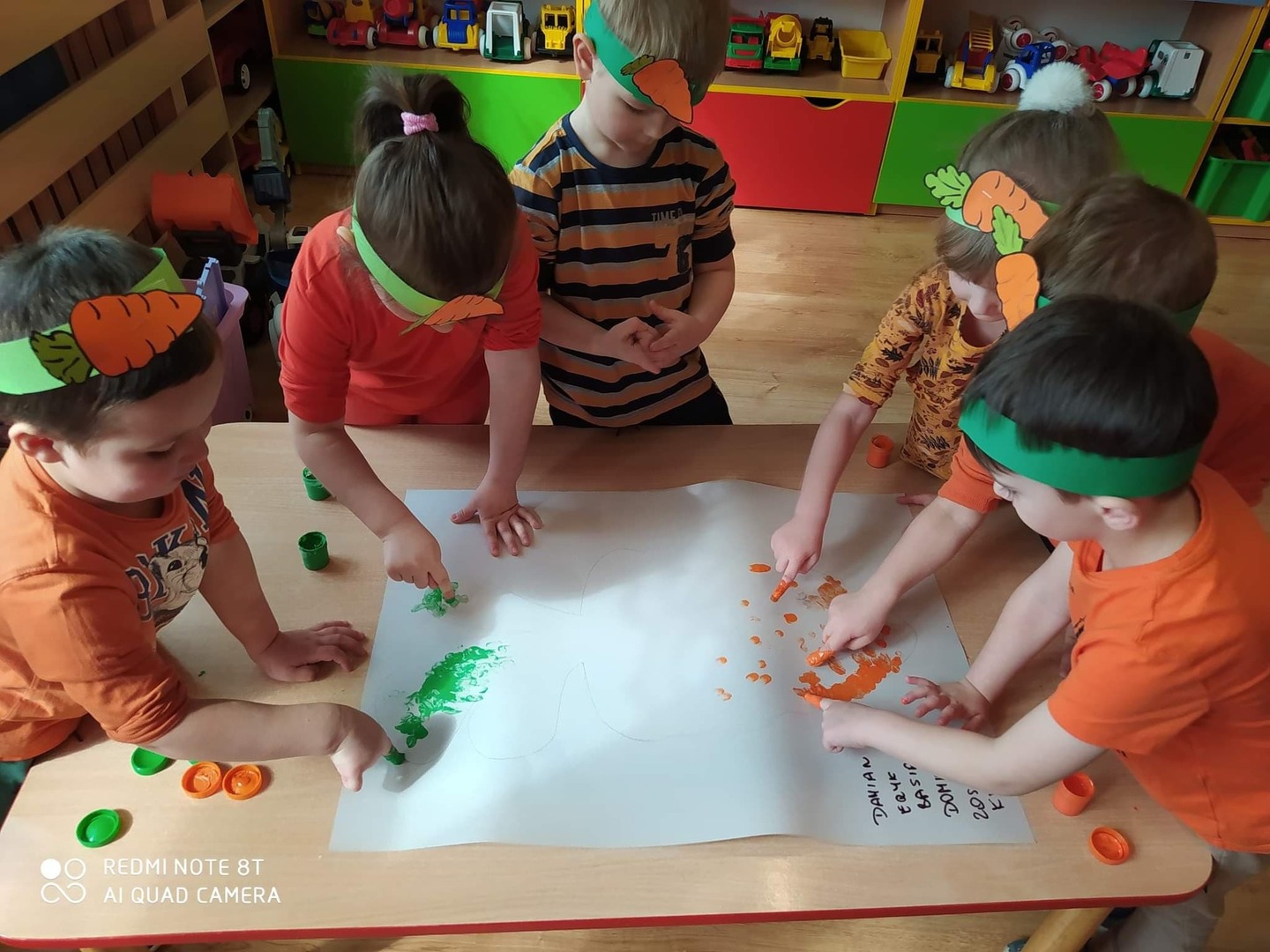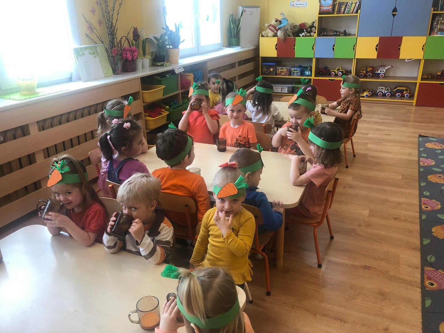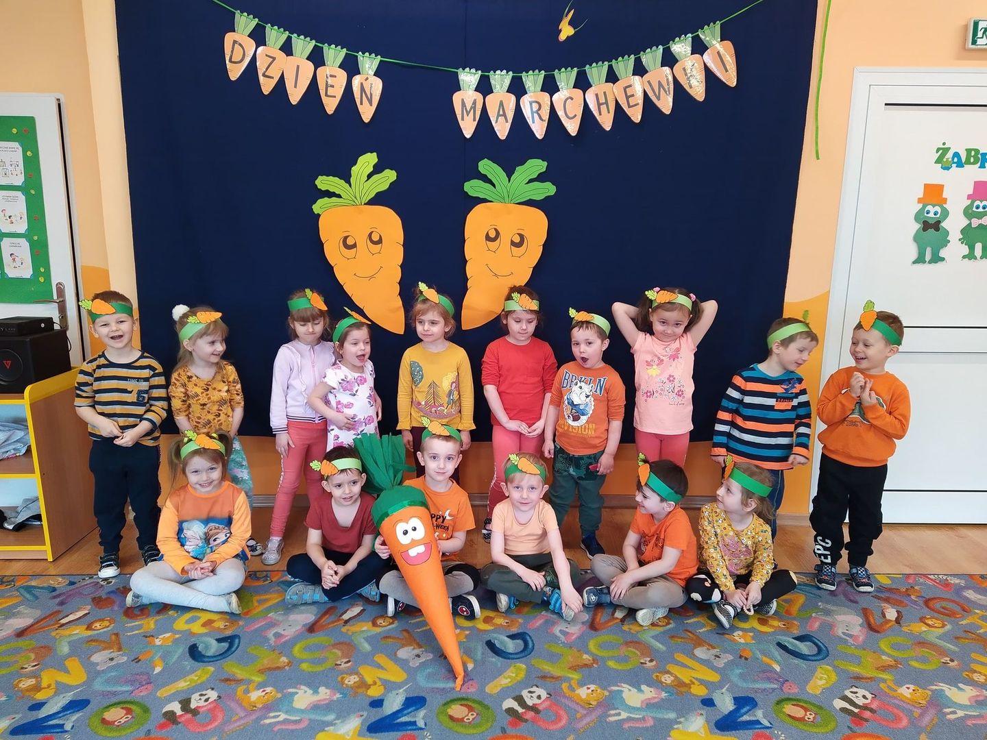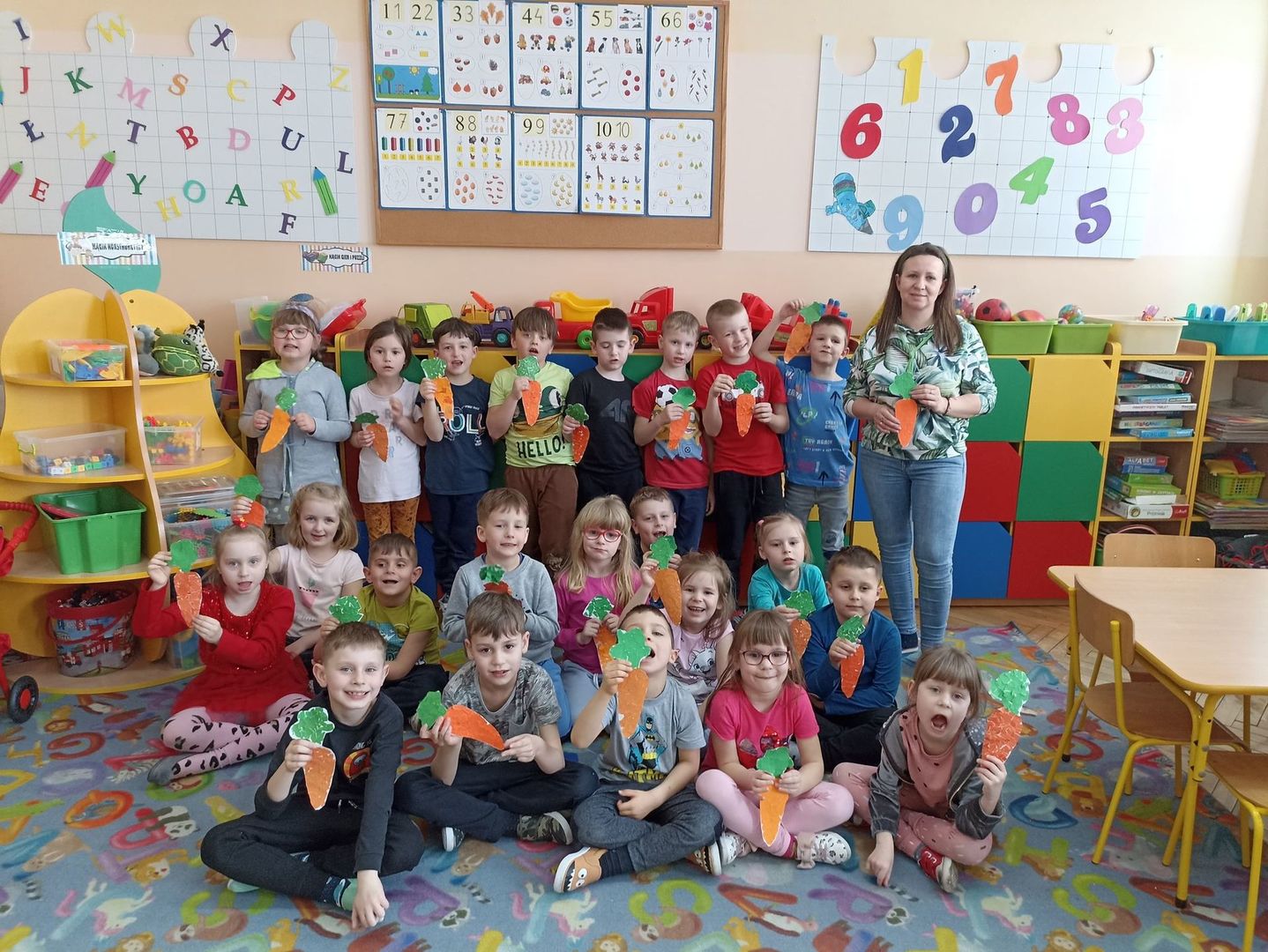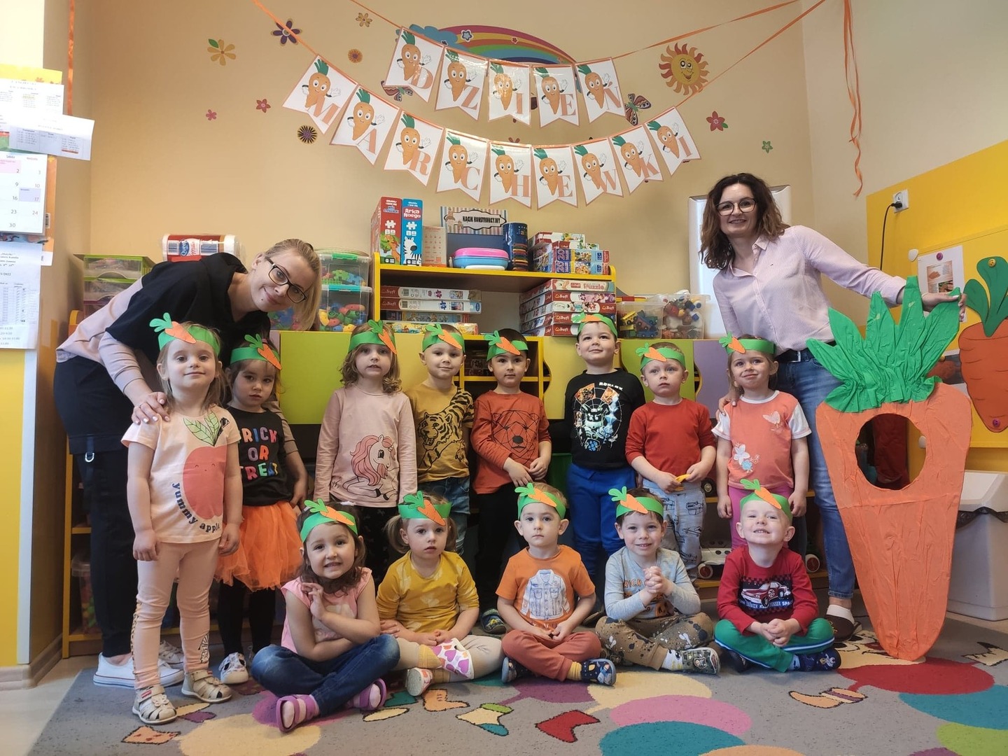 Dzień 04.04.2022r. był dniem wyjątkowo- pomarańczowym, marchewkowym, zdrowym i witaminowym. W tym dniu przedszkolaki poznały zalety i walory marchewki. Dzieci mogły się dowiedzieć wiele ciekawych rzeczy: jak bardzo jest zdrowa, zawiera wiele cennych witamin i składników odżywczych, korzystnie wpływa na skórę, włosy oraz wzrok. Warto pić także sok z marchwi, bo to witaminowa „bomba”. Ten dzień wypełniony był zabawami przy piosenkach o marchewce, pracami plastycznymi, chrupaniem surowych marchewek, próbowaniem marchewkowego soku a także degustacją marchewkowego ciasta. Dzięki takim działaniom prowadzonym już od najmłodszych lat, rozbudzamy u dzieci zainteresowanie własnym zdrowiem, potrzebę prawidłowego odżywiania się i rozróżniania produktów warunkujących zdrowie.