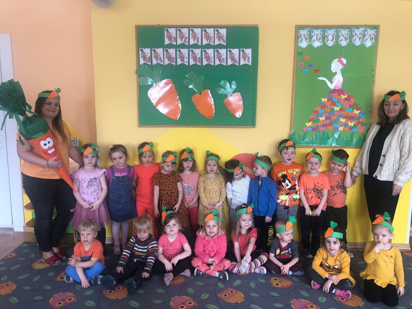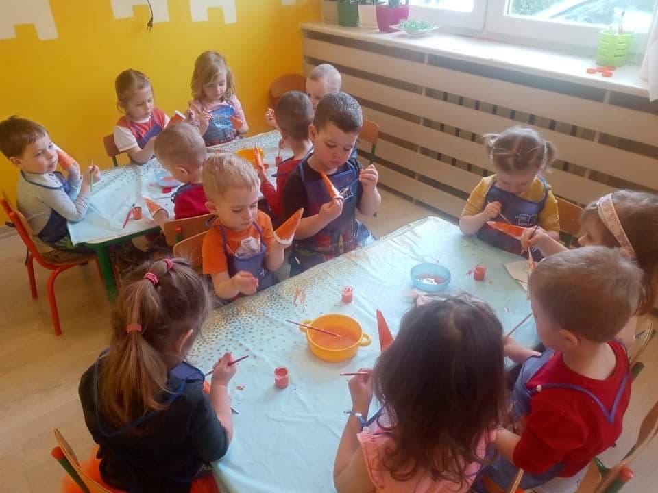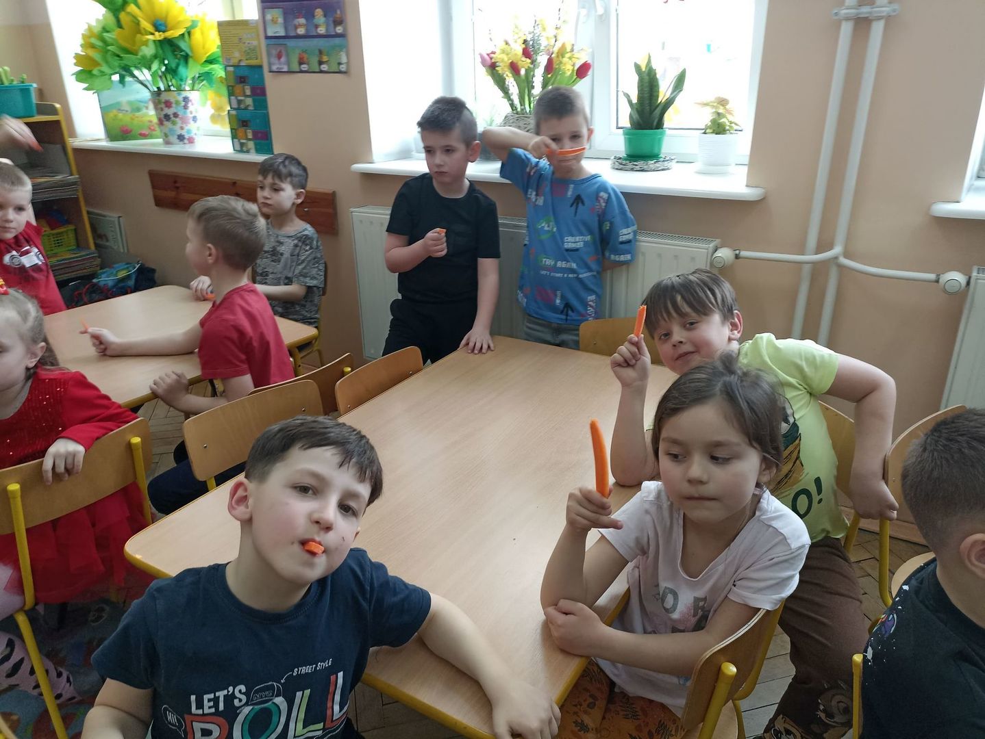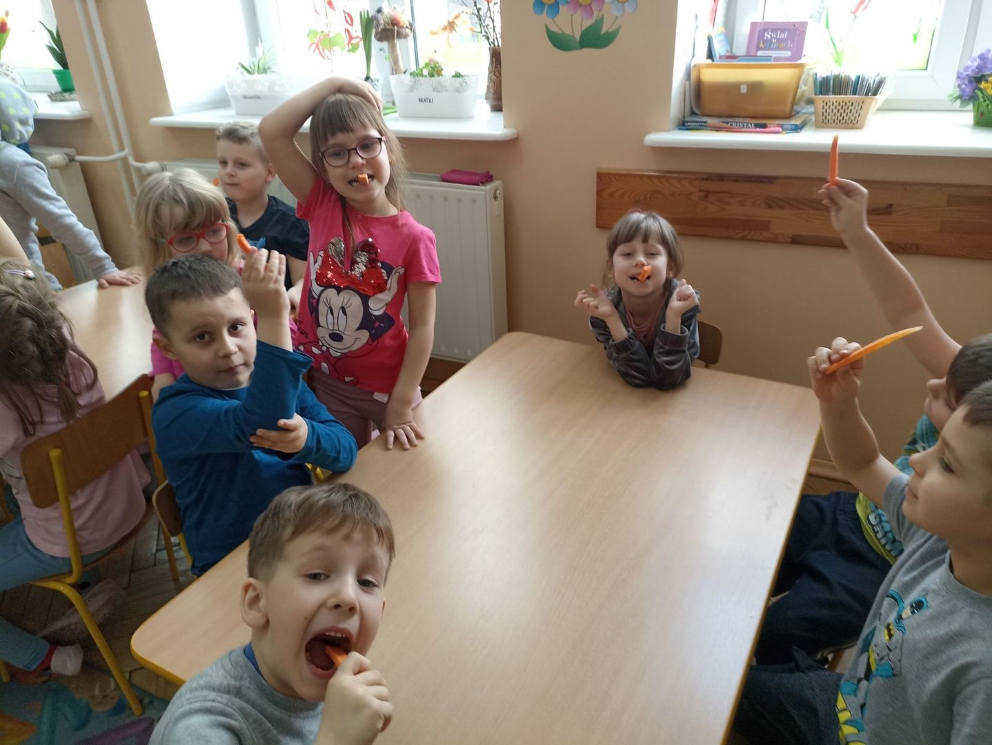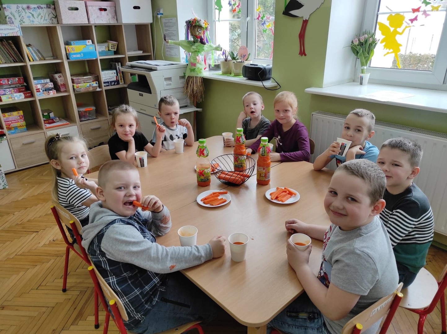 Dzień 04.04.2022r. był dniem wyjątkowo- pomarańczowym, marchewkowym, zdrowym i witaminowym. W tym dniu przedszkolaki poznały zalety i walory marchewki. Dzieci mogły się dowiedzieć wiele ciekawych rzeczy: jak bardzo jest zdrowa, zawiera wiele cennych witamin i składników odżywczych, korzystnie wpływa na skórę, włosy oraz wzrok. Warto pić także sok z marchwi, bo to witaminowa „bomba”. Ten dzień wypełniony był zabawami przy piosenkach o marchewce, pracami plastycznymi, chrupaniem surowych marchewek, próbowaniem marchewkowego soku a także degustacją marchewkowego ciasta. Dzięki takim działaniom prowadzonym już od najmłodszych lat, rozbudzamy u dzieci zainteresowanie własnym zdrowiem, potrzebę prawidłowego odżywiania się i rozróżniania produktów warunkujących zdrowie.