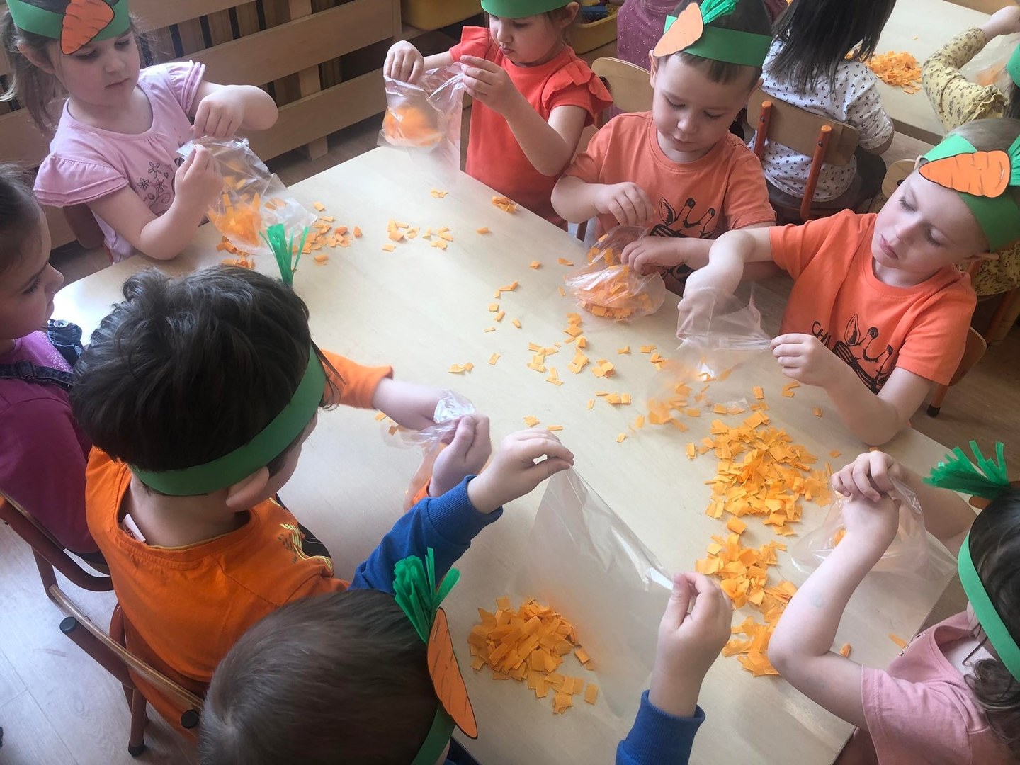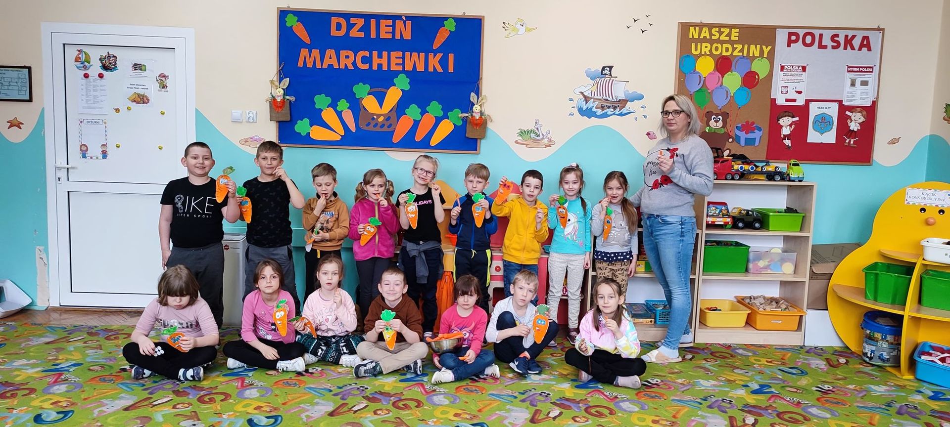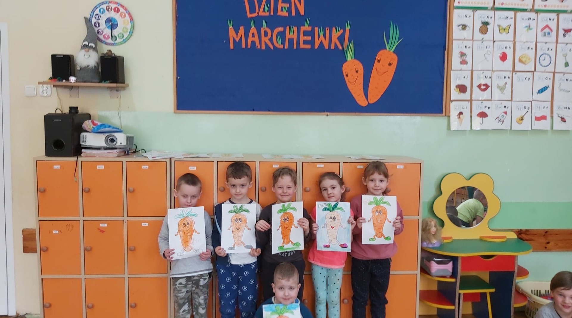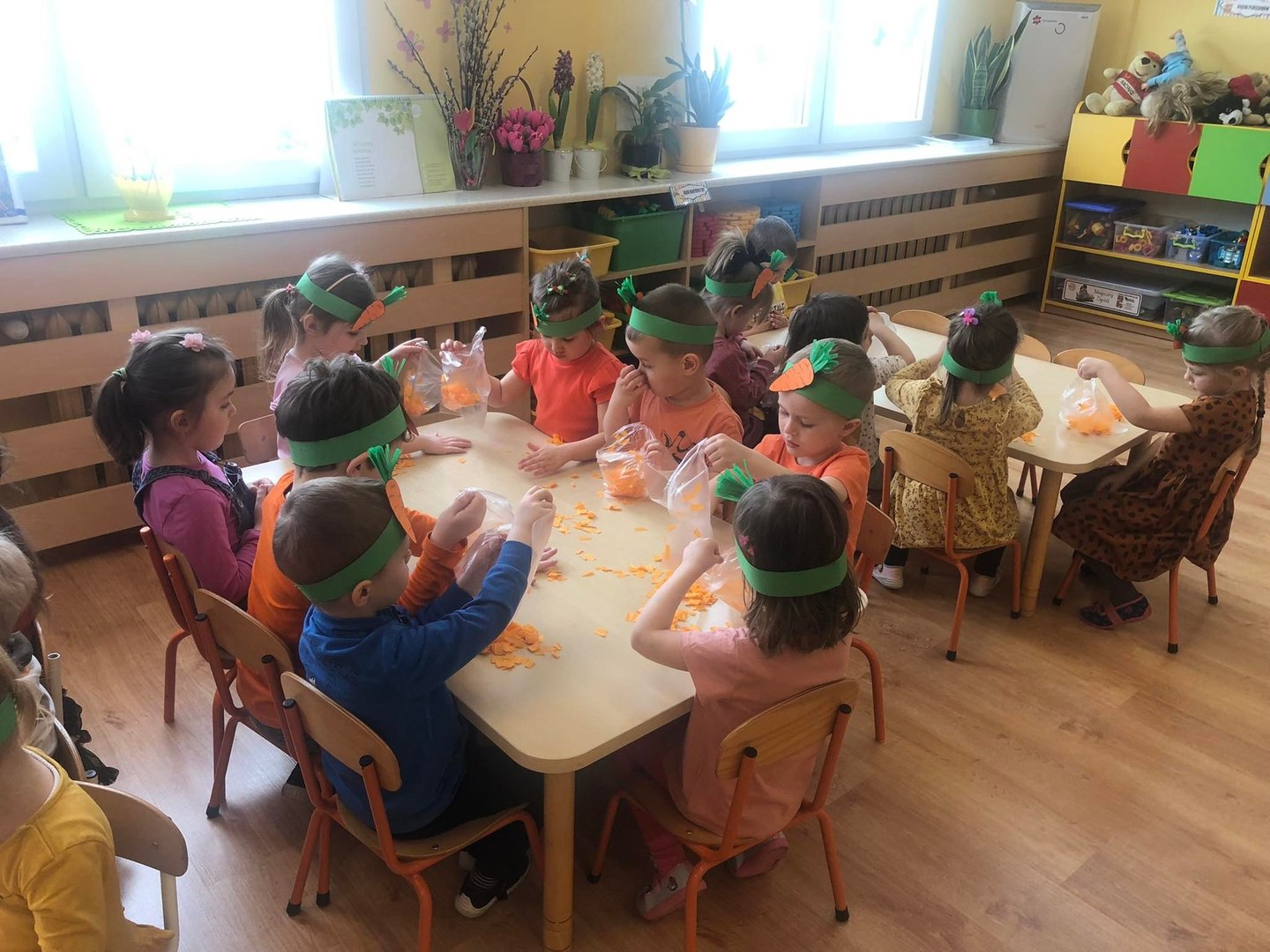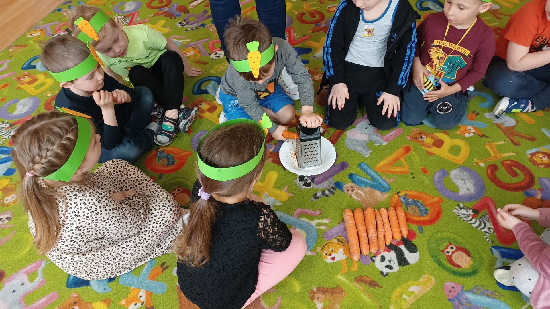 Dzień 04.04.2022r. był dniem wyjątkowo- pomarańczowym, marchewkowym, zdrowym i witaminowym. W tym dniu przedszkolaki poznały zalety i walory marchewki. Dzieci mogły się dowiedzieć wiele ciekawych rzeczy: jak bardzo jest zdrowa, zawiera wiele cennych witamin i składników odżywczych, korzystnie wpływa na skórę, włosy oraz wzrok. Warto pić także sok z marchwi, bo to witaminowa „bomba”. Ten dzień wypełniony był zabawami przy piosenkach o marchewce, pracami plastycznymi, chrupaniem surowych marchewek, próbowaniem marchewkowego soku a także degustacją marchewkowego ciasta. Dzięki takim działaniom prowadzonym już od najmłodszych lat, rozbudzamy u dzieci zainteresowanie własnym zdrowiem, potrzebę prawidłowego odżywiania się i rozróżniania produktów warunkujących zdrowie.