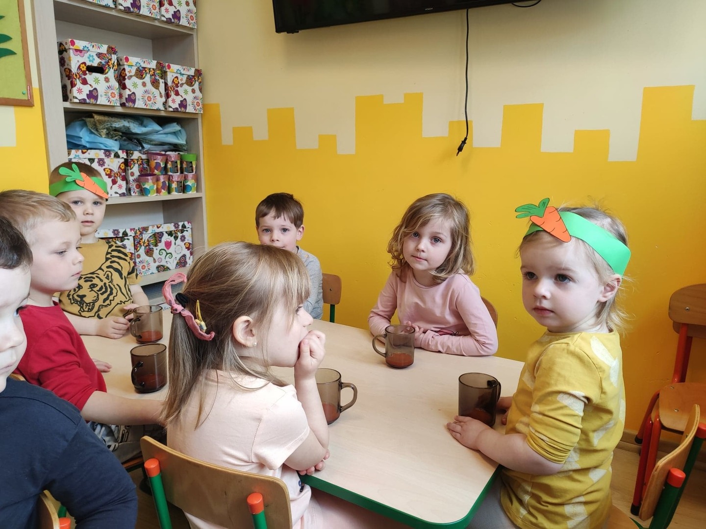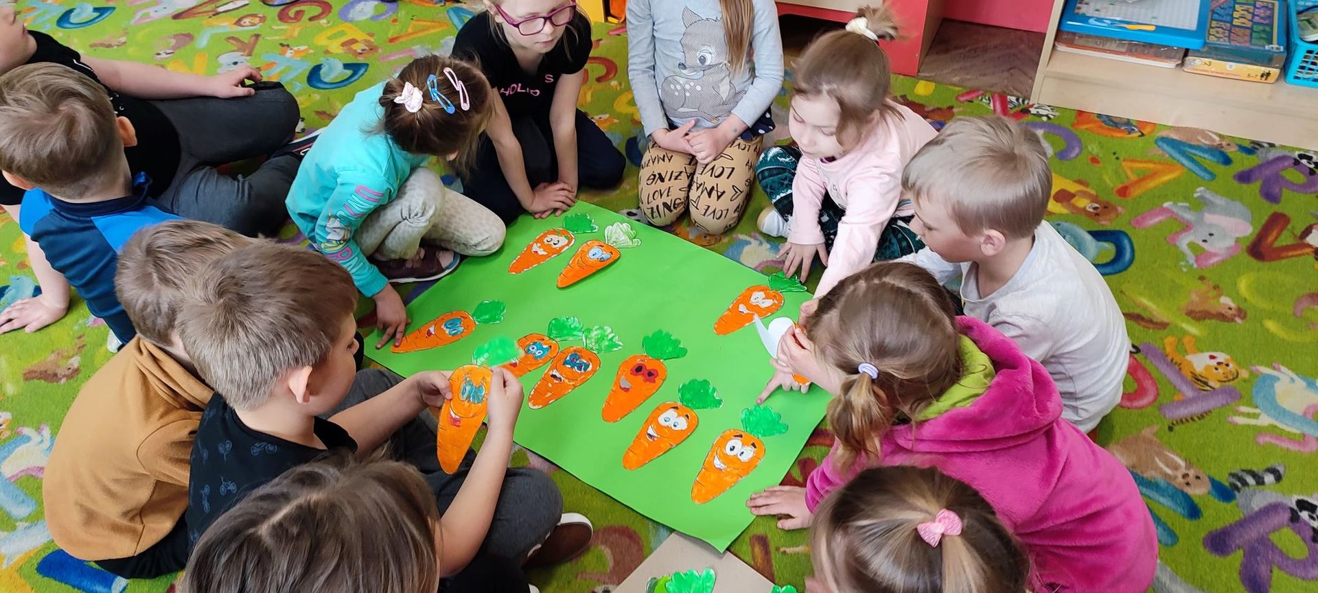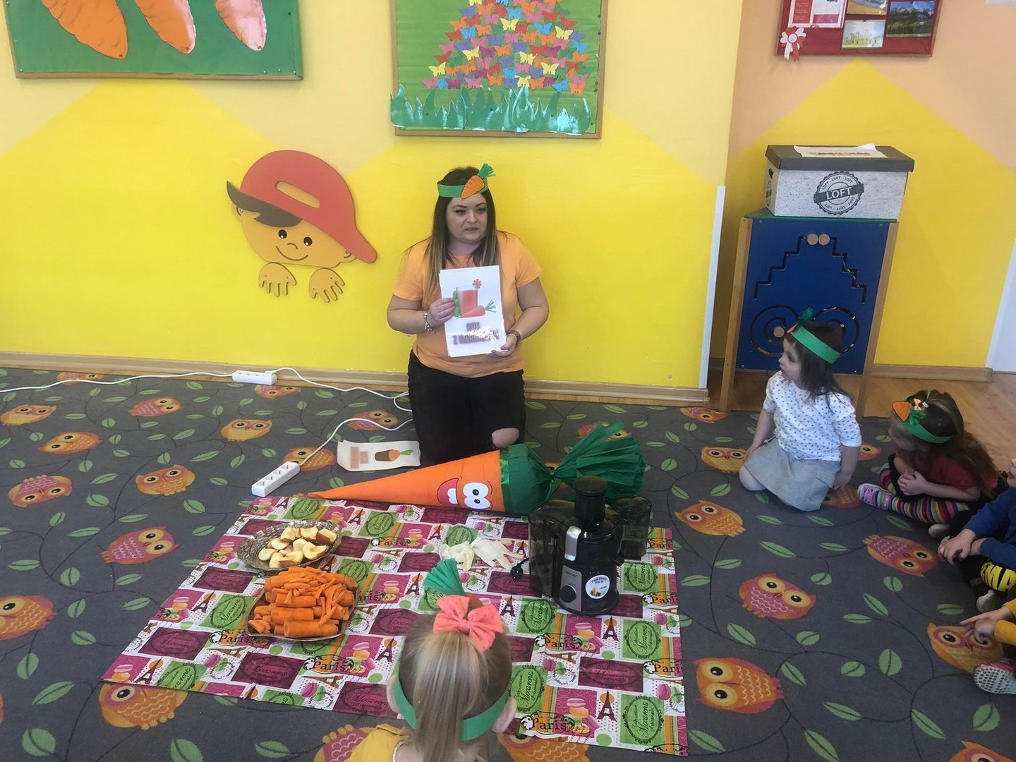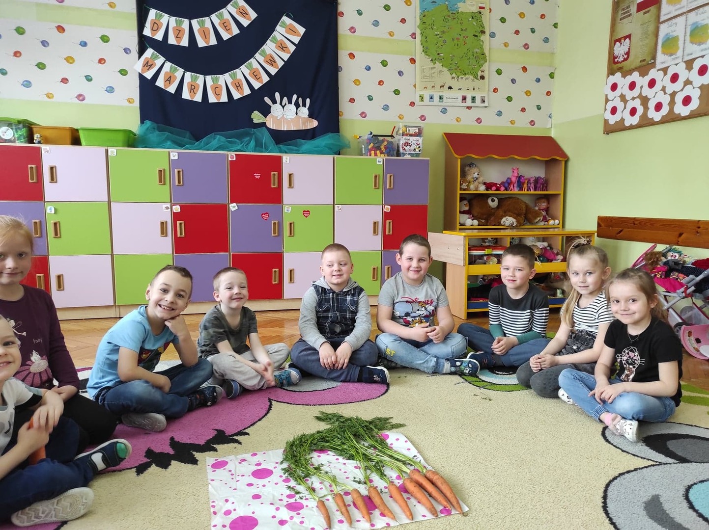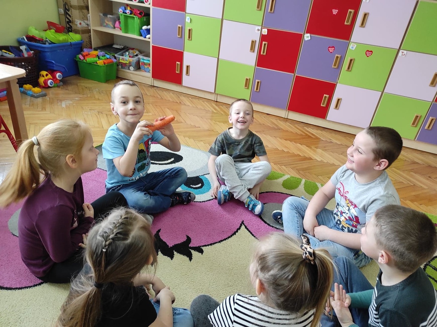 Dzień 04.04.2022r. był dniem wyjątkowo- pomarańczowym, marchewkowym, zdrowym i witaminowym. W tym dniu przedszkolaki poznały zalety i walory marchewki. Dzieci mogły się dowiedzieć wiele ciekawych rzeczy: jak bardzo jest zdrowa, zawiera wiele cennych witamin i składników odżywczych, korzystnie wpływa na skórę, włosy oraz wzrok. Warto pić także sok z marchwi, bo to witaminowa „bomba”. Ten dzień wypełniony był zabawami przy piosenkach o marchewce, pracami plastycznymi, chrupaniem surowych marchewek, próbowaniem marchewkowego soku a także degustacją marchewkowego ciasta. Dzięki takim działaniom prowadzonym już od najmłodszych lat, rozbudzamy u dzieci zainteresowanie własnym zdrowiem, potrzebę prawidłowego odżywiania się i rozróżniania produktów warunkujących zdrowie.